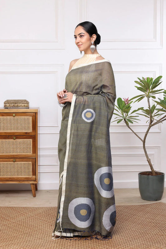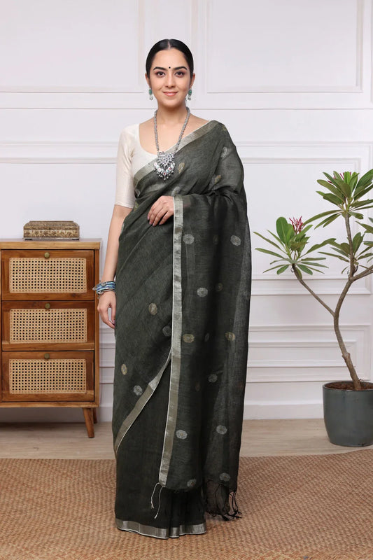 Handloom Olive Green Pure Linen Jamdani Saree
