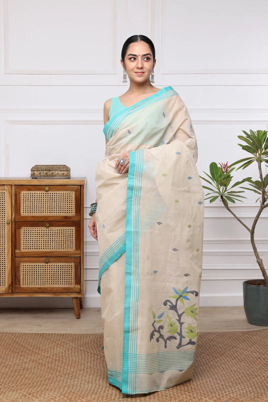 Handloom Beige Pure Cotton Jamdani Saree with Multi Colour Floral Motifs