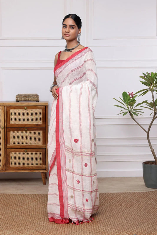 Handloom White & Red Pure Linen Saree