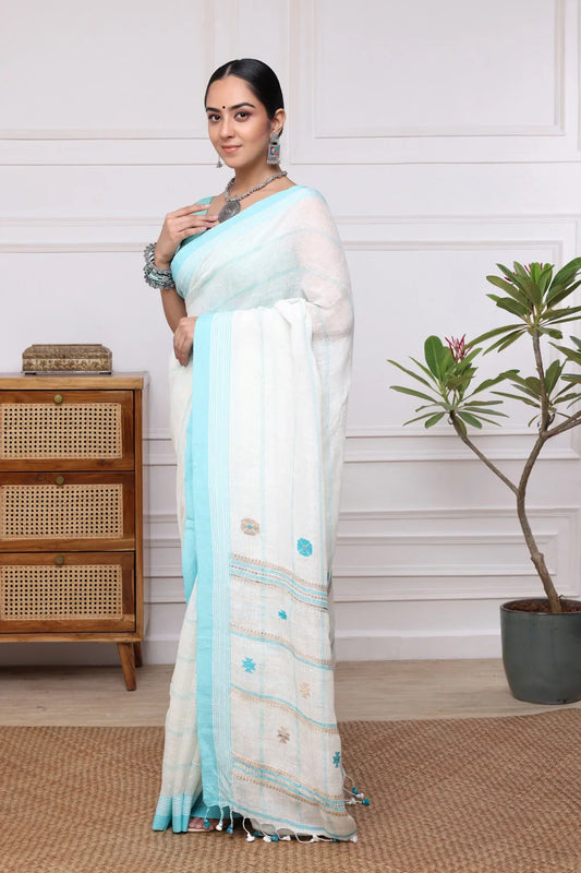 Handloom White Pure Linen Saree with Aqua Green Border
