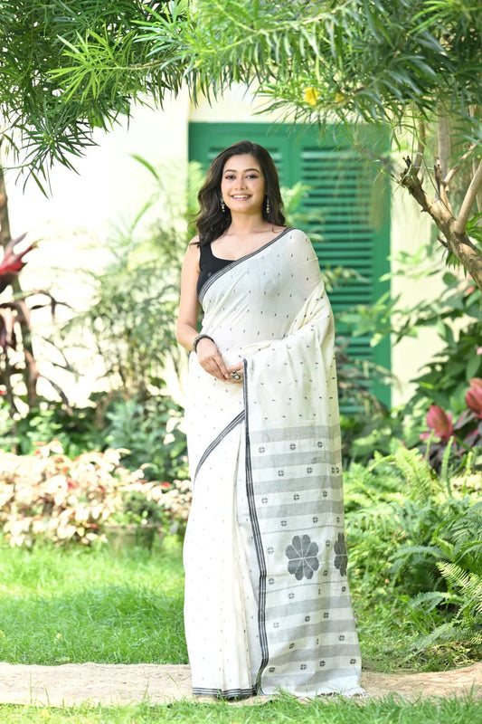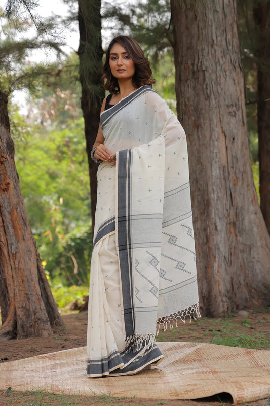 Handloom Off White Soft Cotton Saree With Dark Grey Border