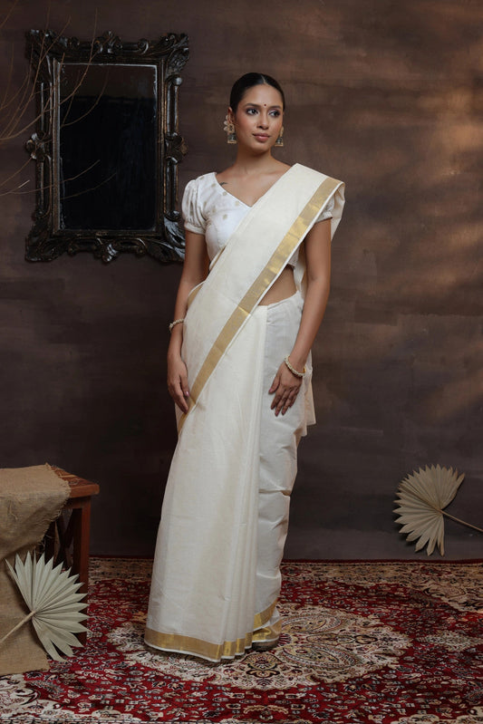 Handloom Off White Pure Cotton Kasavu Saree With Gold Zari Border