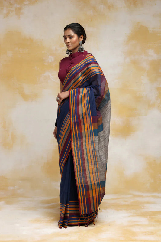 Handloom Navy Blue Pure Cotton Saree With Multi Colour Border