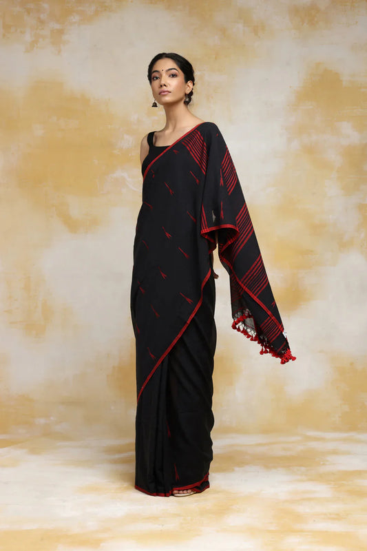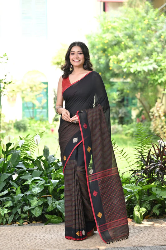 Handloom Black Booti Mulmul Cotton Saree With Red Tassels