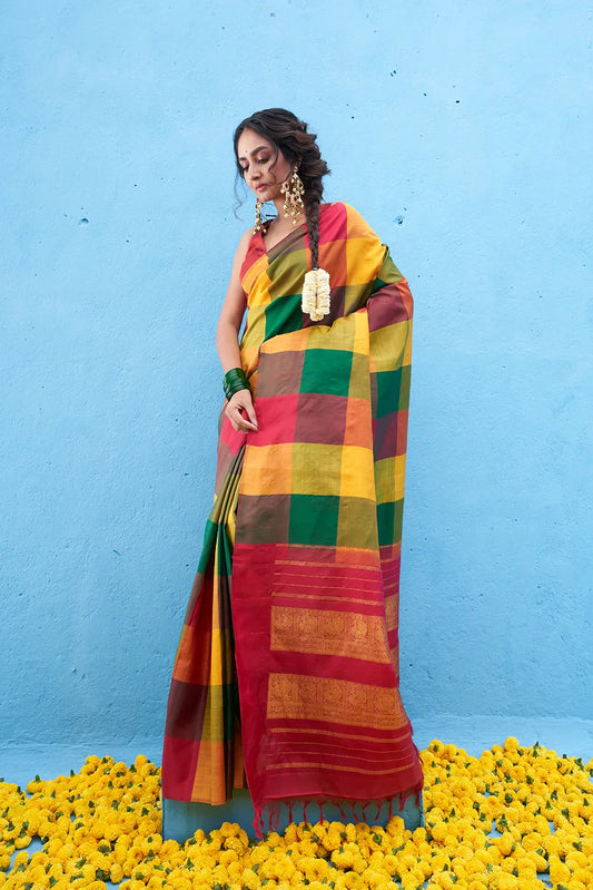 Handloom Maroon Pure Silk Saree With Multi Colour Check Boxes & Gold Zari Pallu