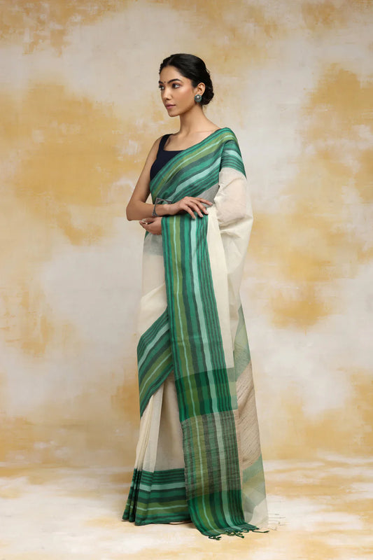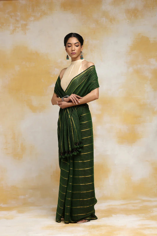 Handloom Mulmul Cotton Dark Green Saree With Zari Stripes & Tassels