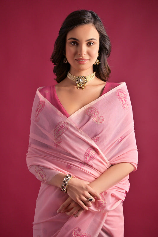Pink Mul mul Cotton Keri Woven Artisan saree