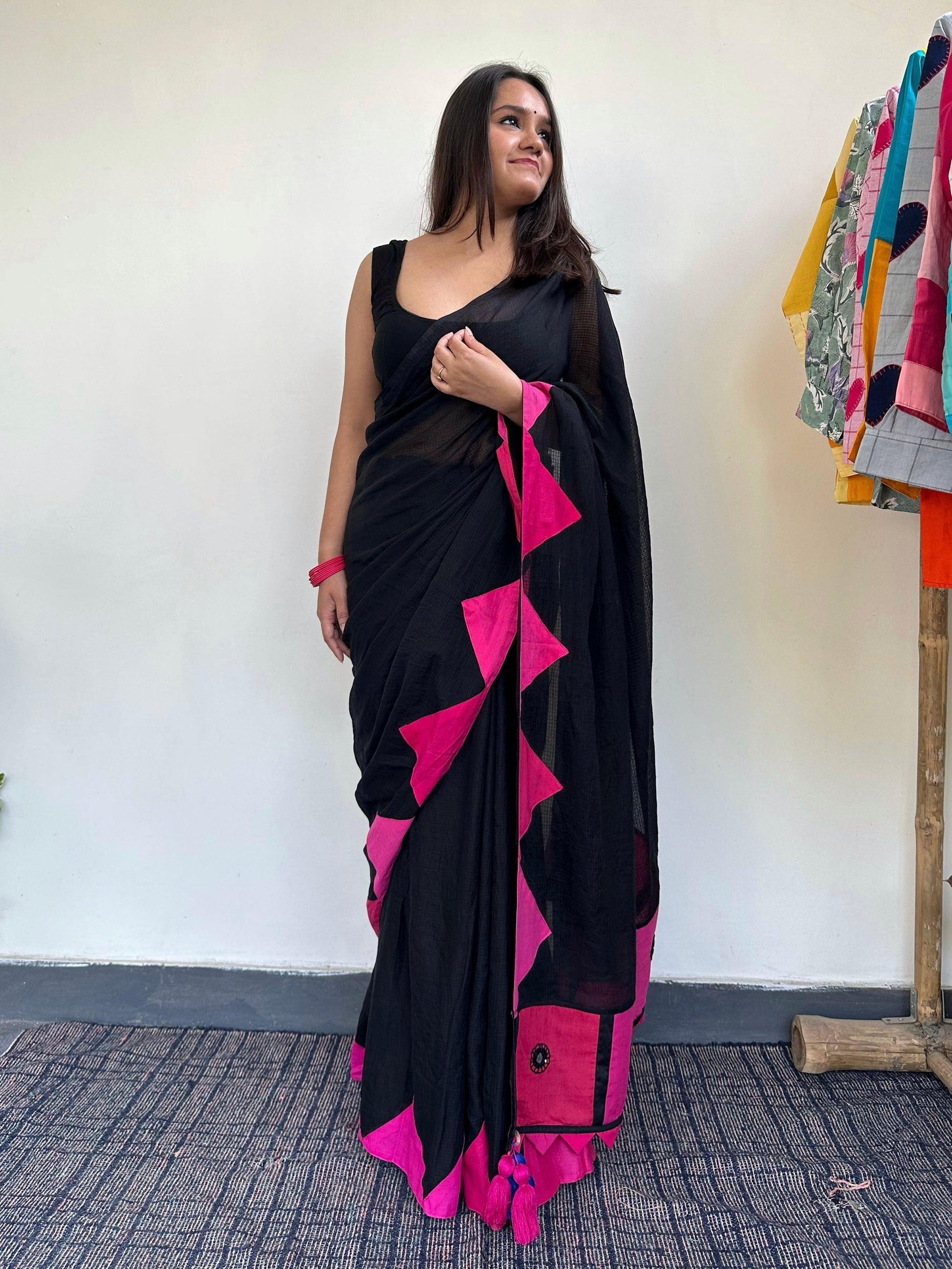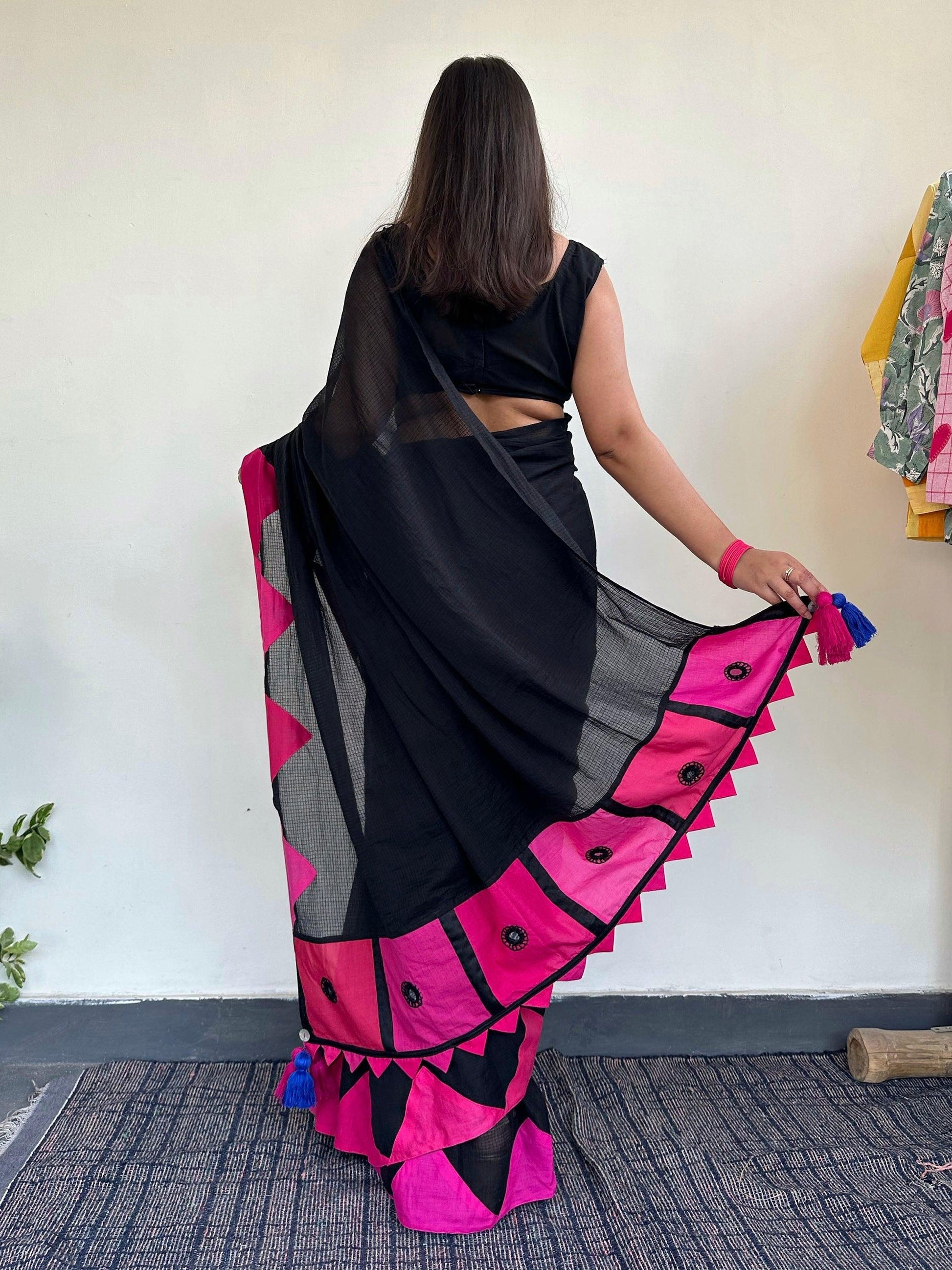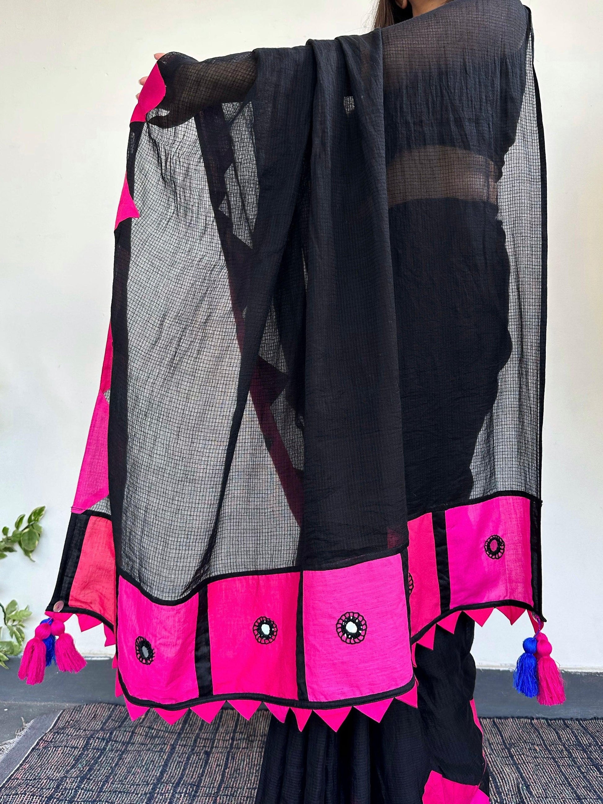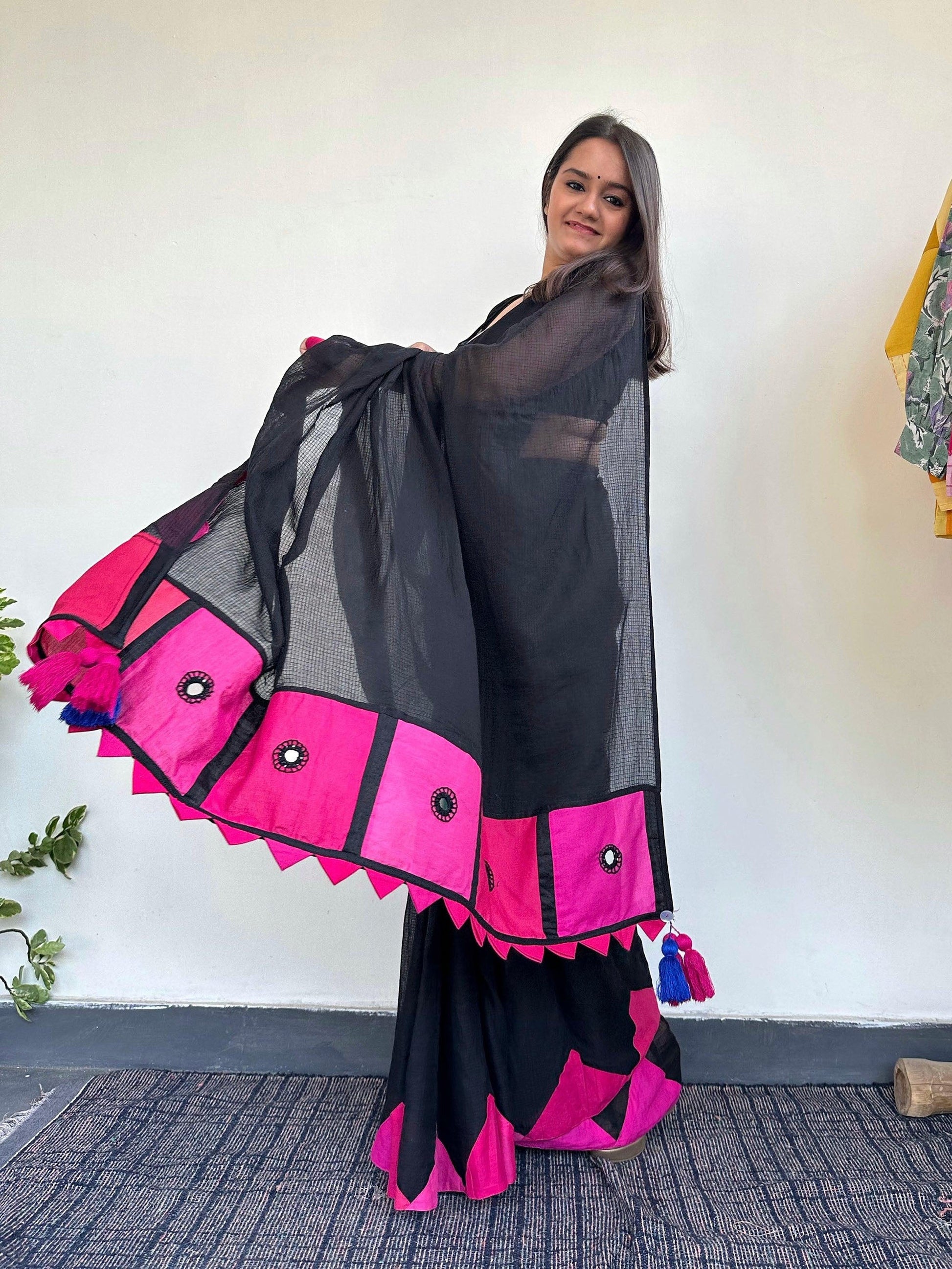 Enter a realm where style is sovereign with the गुलाबो Saree. This isn't just fashion; it's a power move. Cloaked in the timeless sophistication of black, accented with the vibrancy of fuchsia and the soft allure of pink, the गुलाबो Saree is a bold statement piece for the fashion-forward. Adorn yourself with the intricate hand-embroidered mirrors that catch the light and eyes alike, and let the handmade tassels add a playful sway to your step. With gentle hand wash care, this 100% cotton ensemble is not only a nod to sustainable luxury but also a testament to enduring elegance. Make the गुलाबो Saree your sartorial signature.