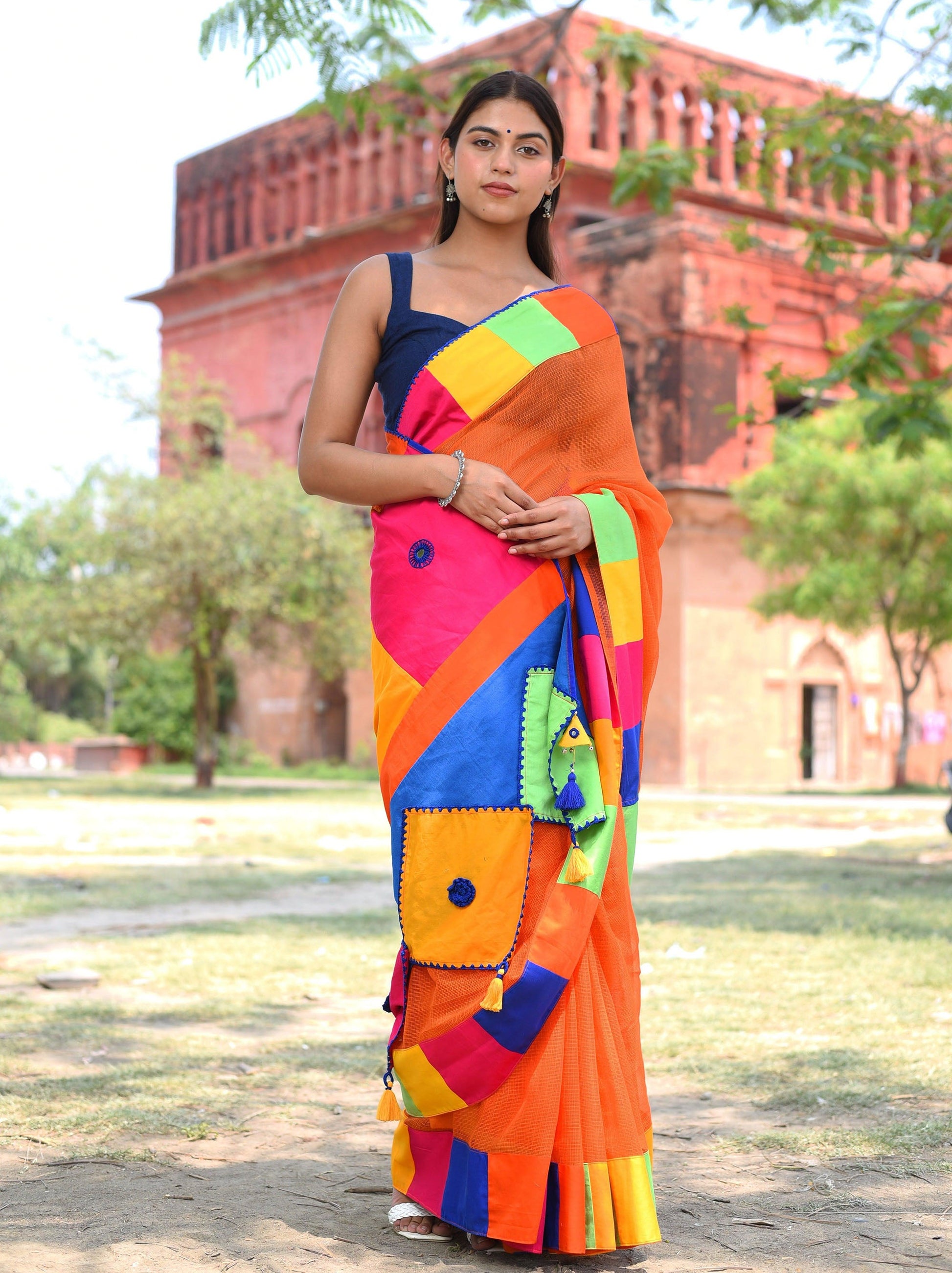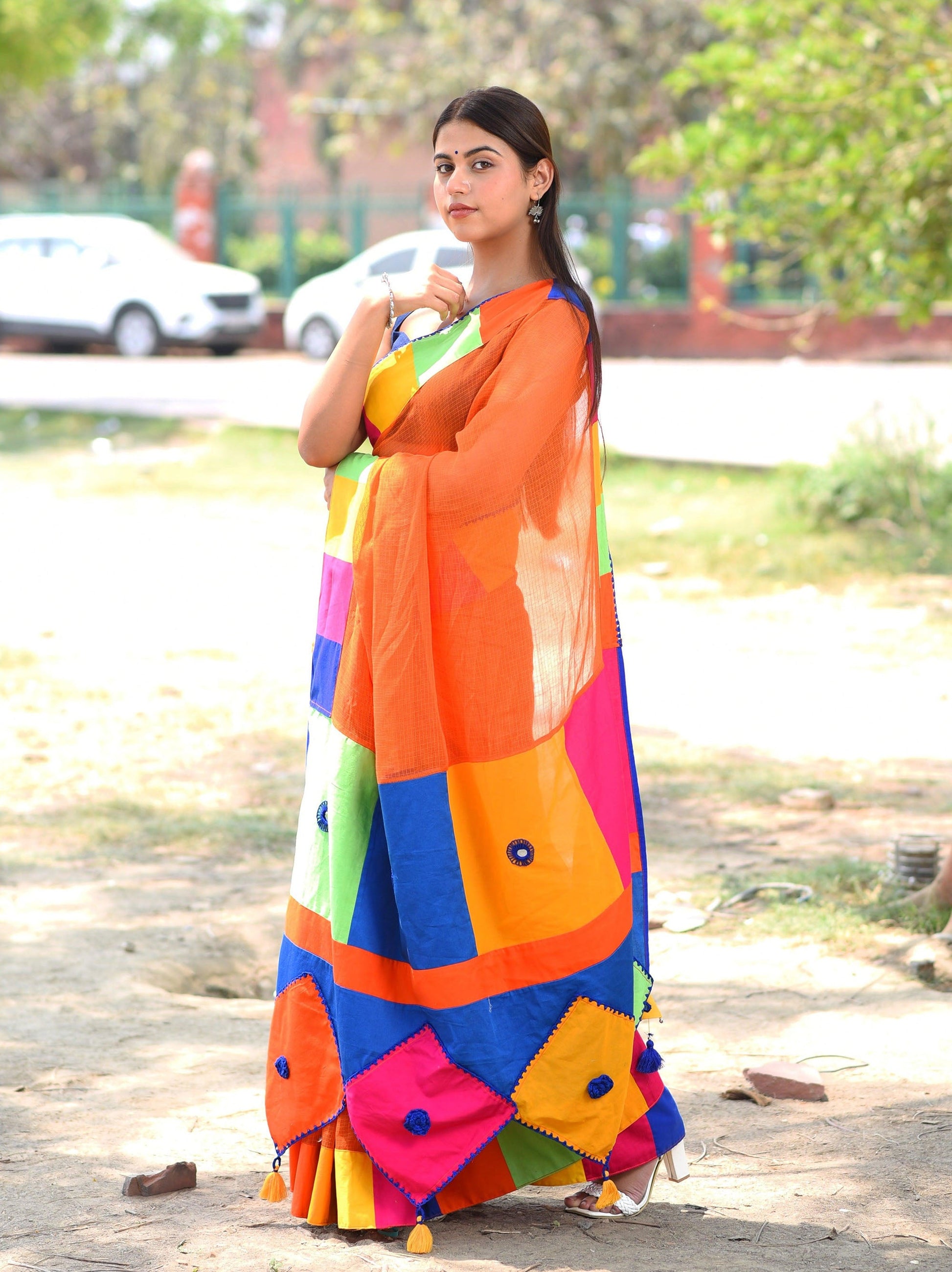 Elevate your saree collection with the vibrant पतंग Saree, a radiant orange masterpiece that captures the spirit of celebration. 🌅🌺 Crafted from a luxurious kota woven blend of cotton and silk, this saree combines the best of comfort and opulence. It is meticulously adorned with a brocade of crochet flowers, detailed mirror embroidery, and eye-catching accent trims, each element adding a layer of exquisite craftsmanship.