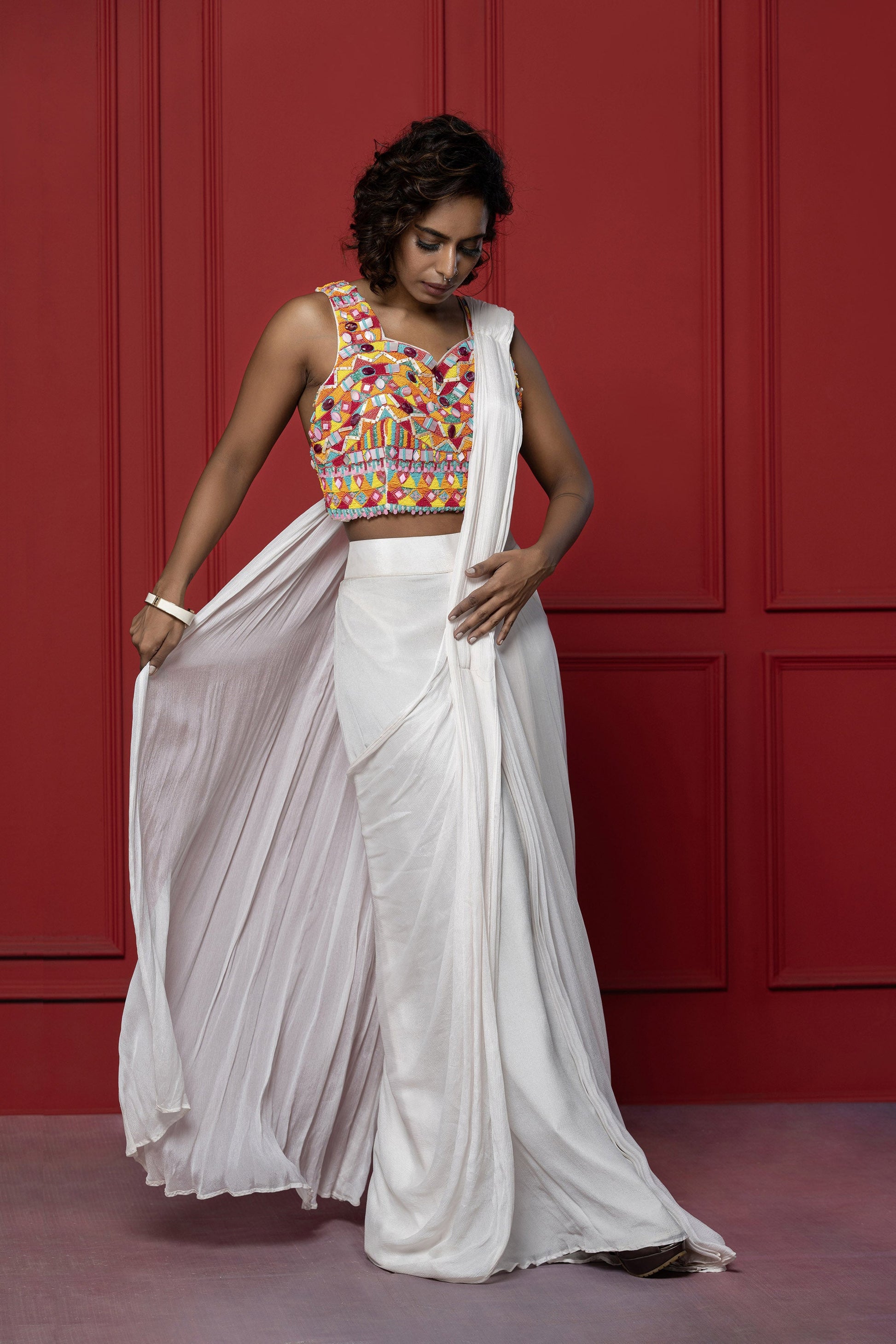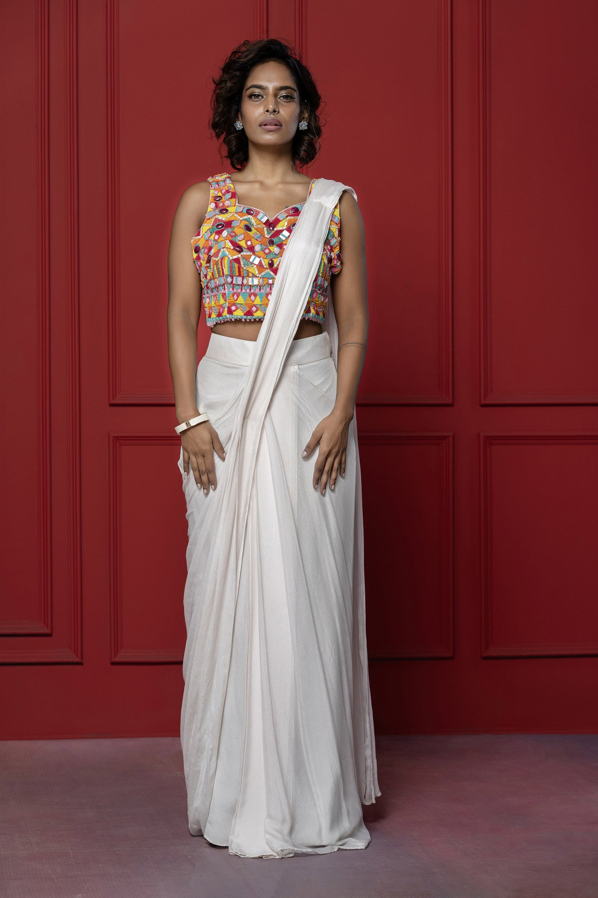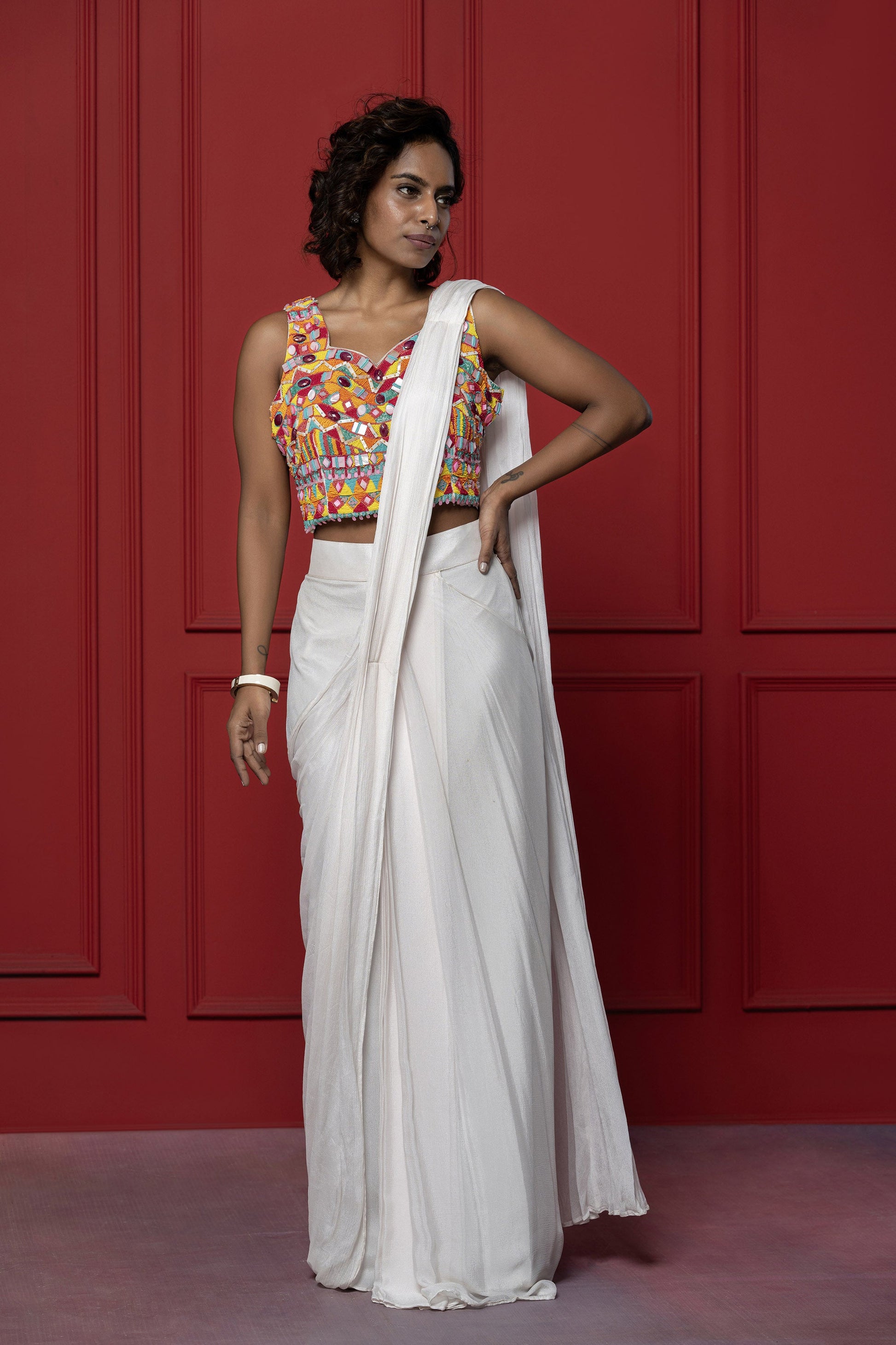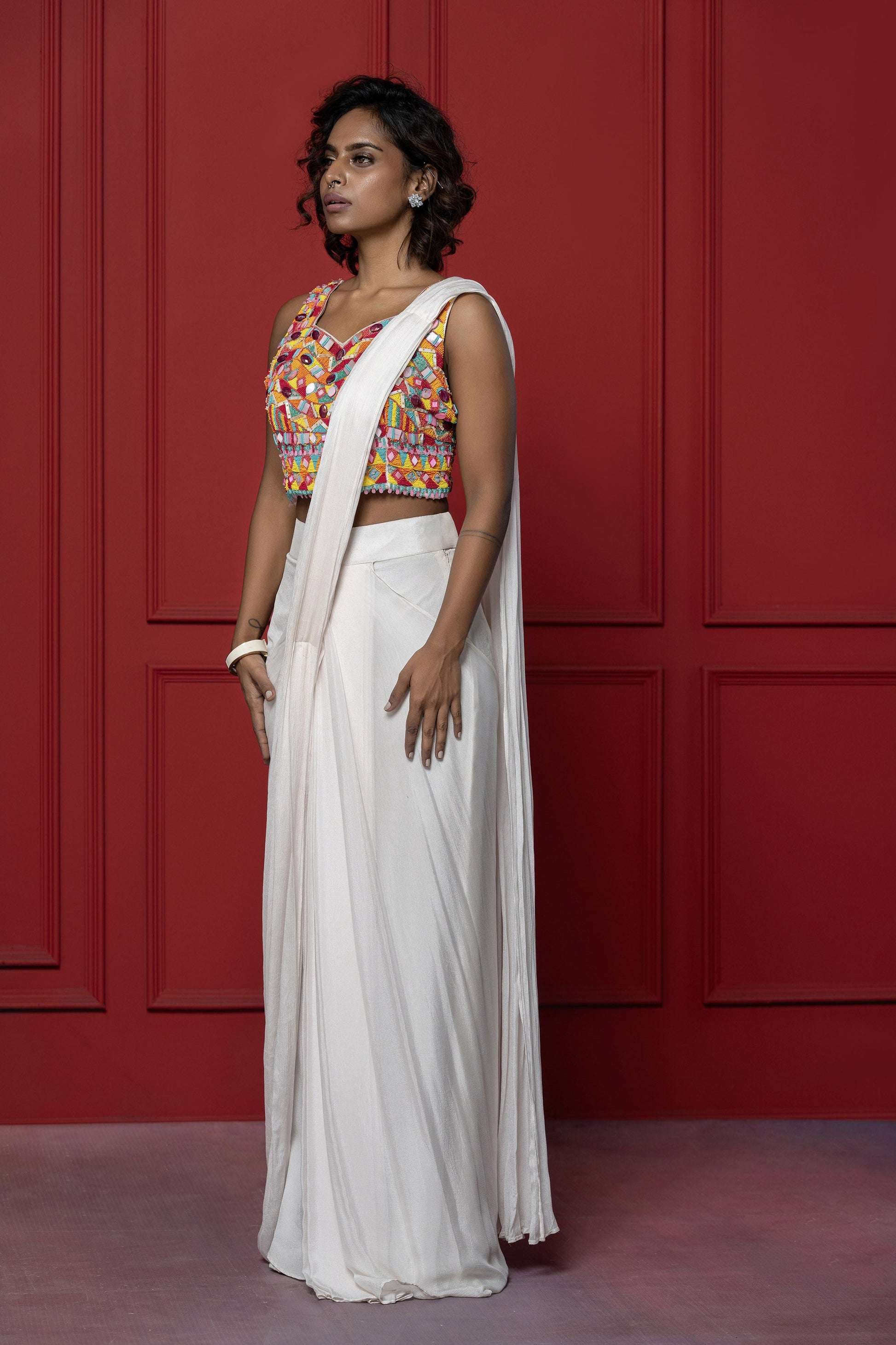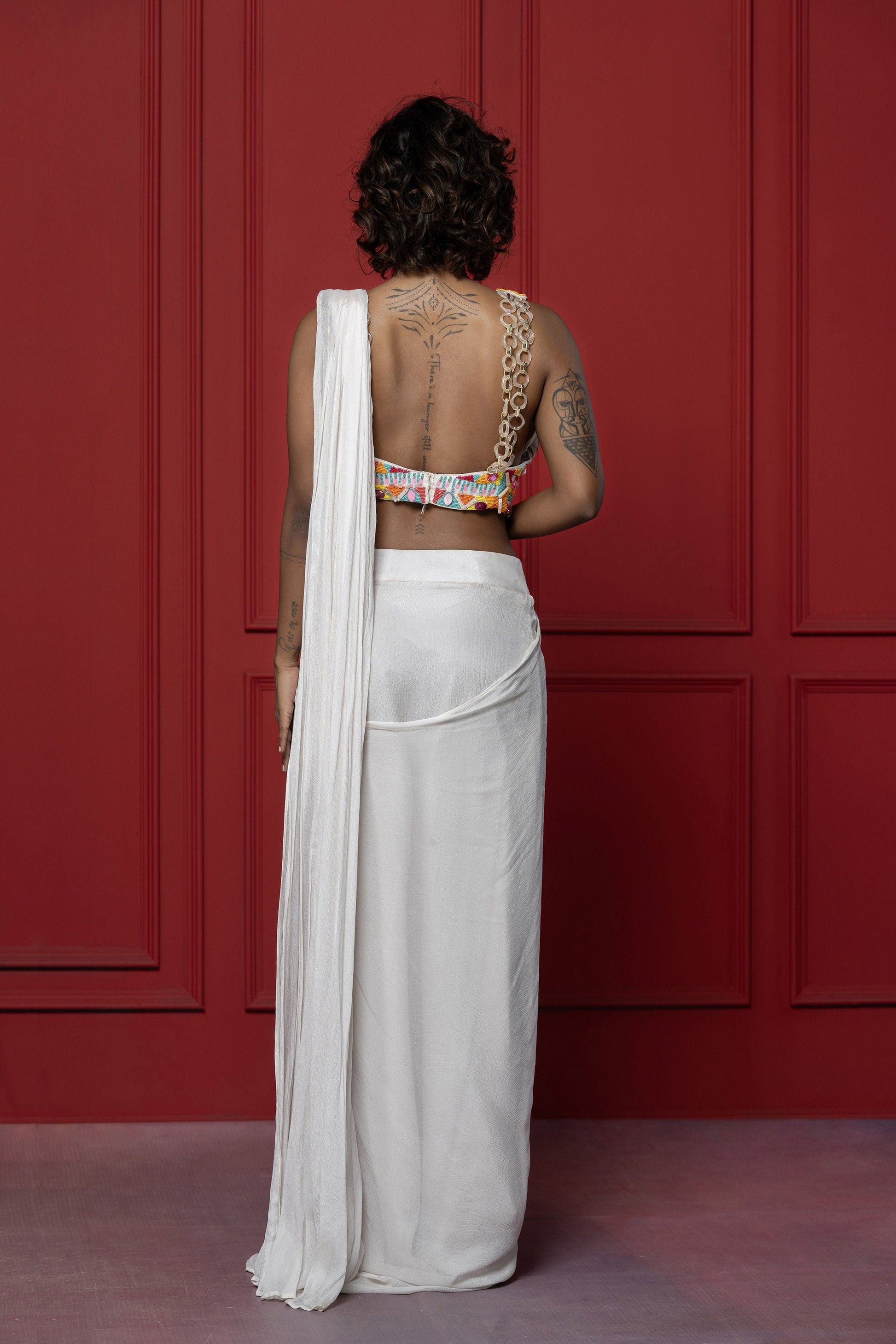 3D blouse with multi-coloured work that has motifs all over with chain detail as straps & a plain drape