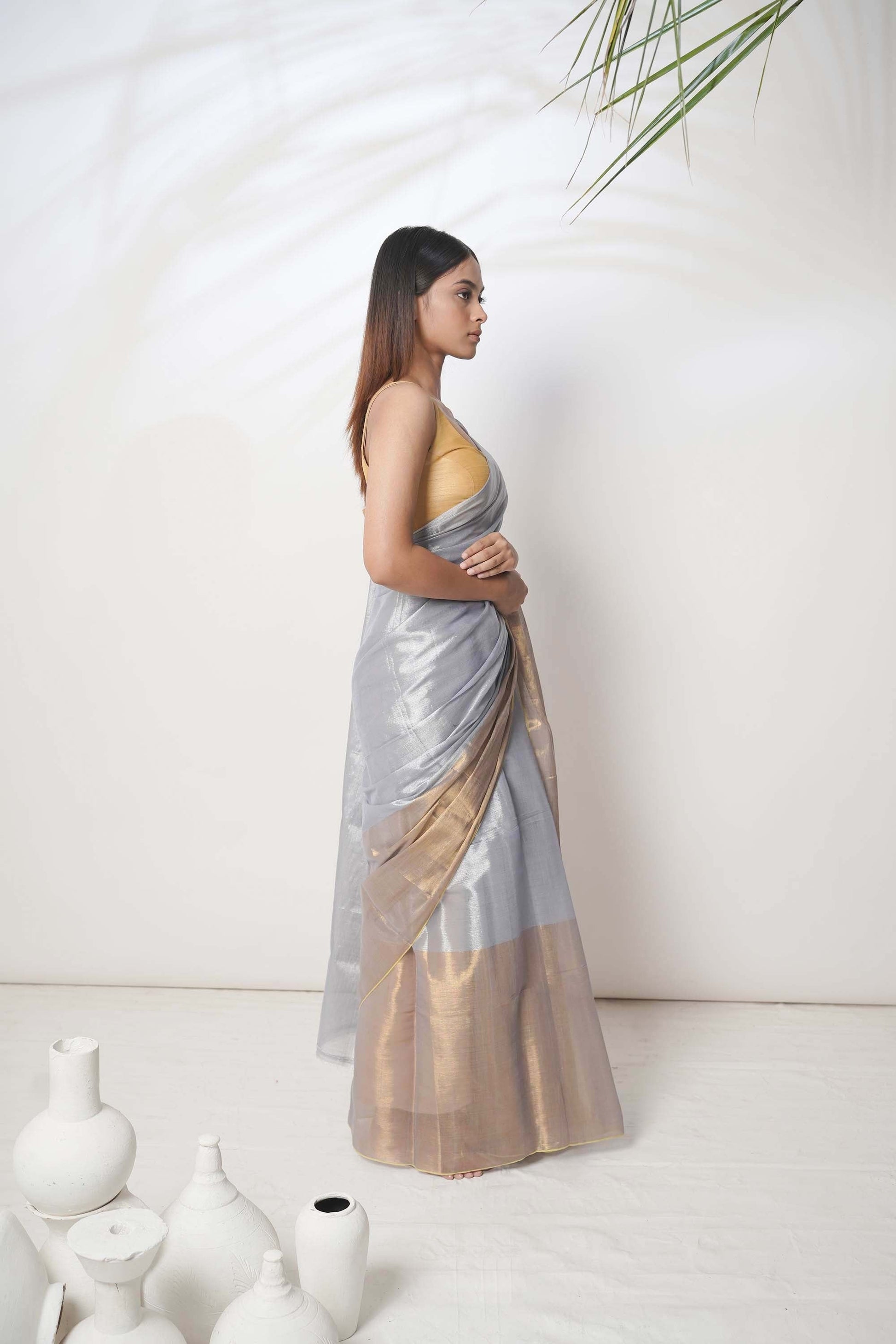 Alankrita | Slate Blue and Gold Handloom Tissue Saree