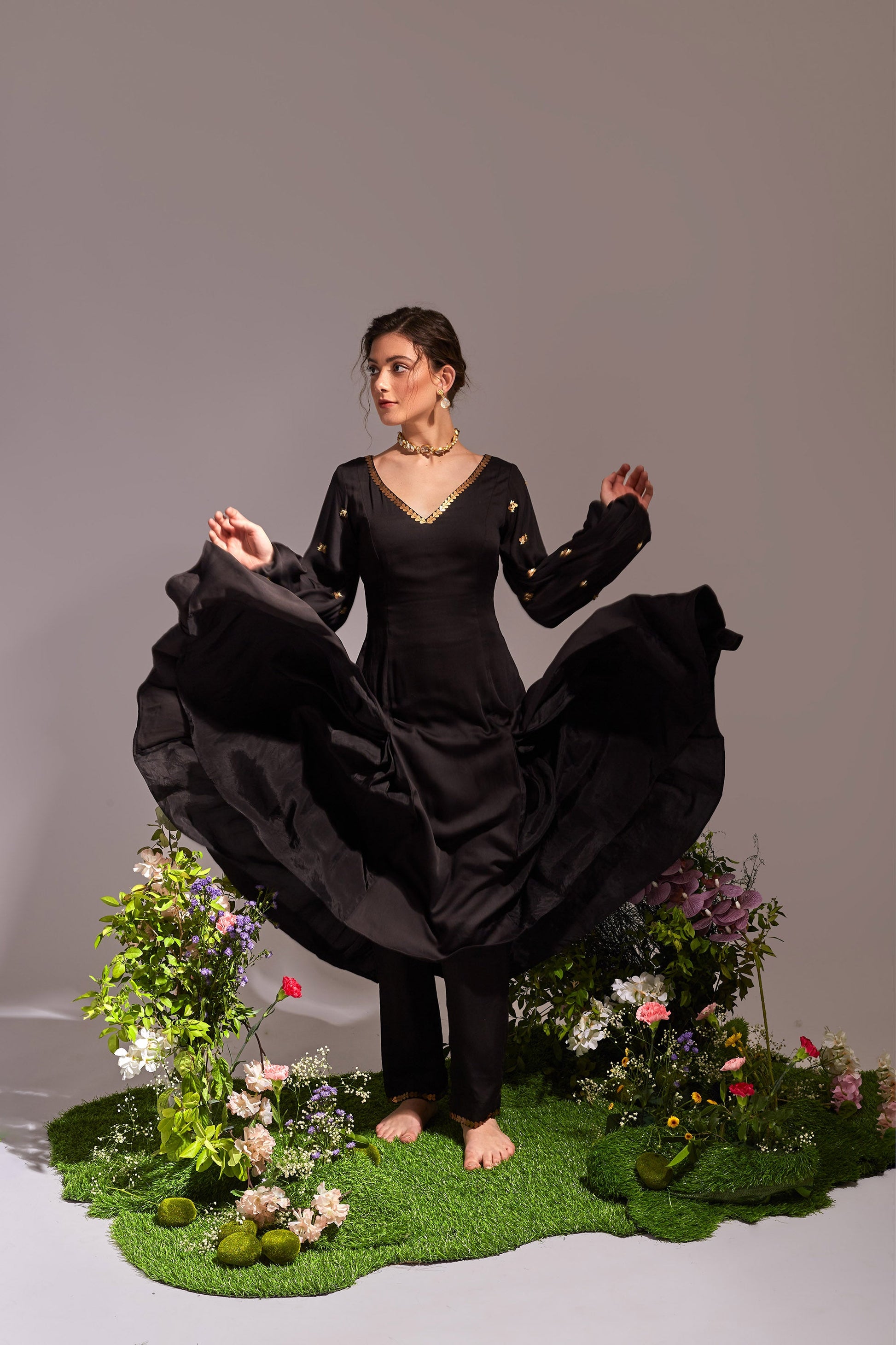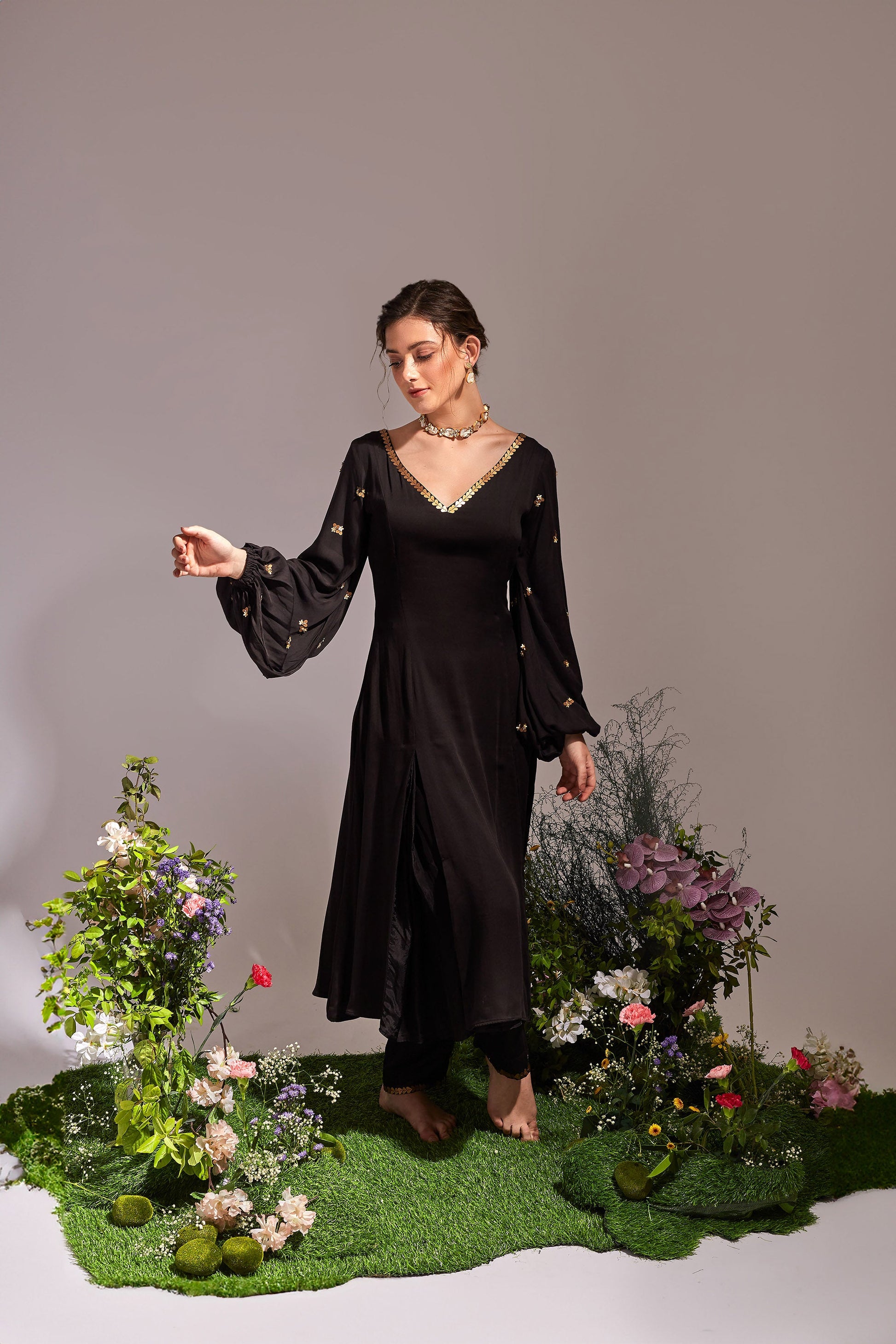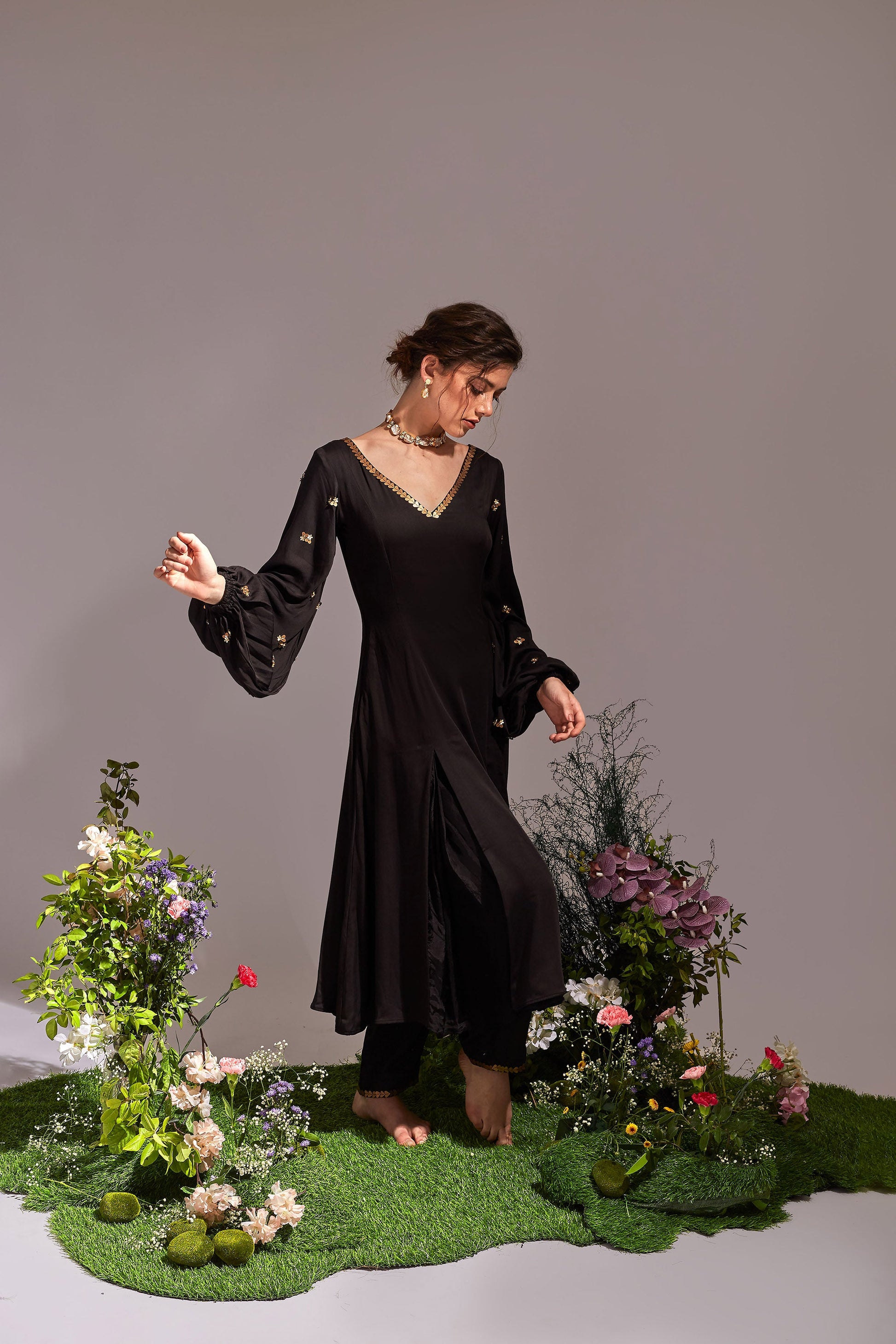 The kurta features exquisite flower and heart embellished sleeves, a flattering V-neck, and a heart cutout at the back, creating an unforgettable impression. Paired effortlessly with relaxed-fitted narrow-hem pants, adorned with delicate heart-shaped sequins, this ensemble exudes both grace and contemporary style.