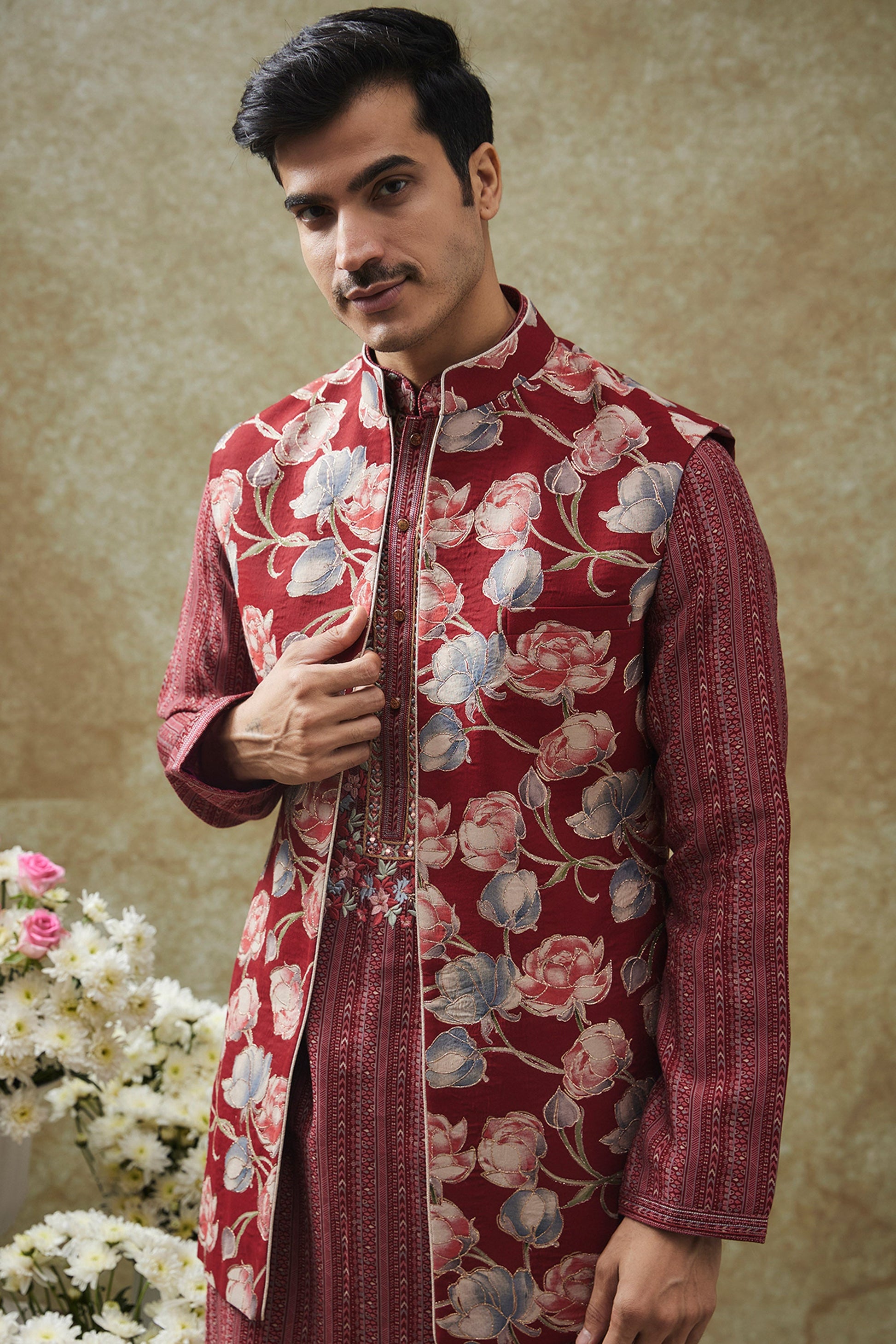 Apple Red Kurta Jacket set in Splendid Silk Fabric with Foil Work on Printed Jacket, Multicolored Thread work on Kurta' neck, Paired with Matching Fitted Bottom