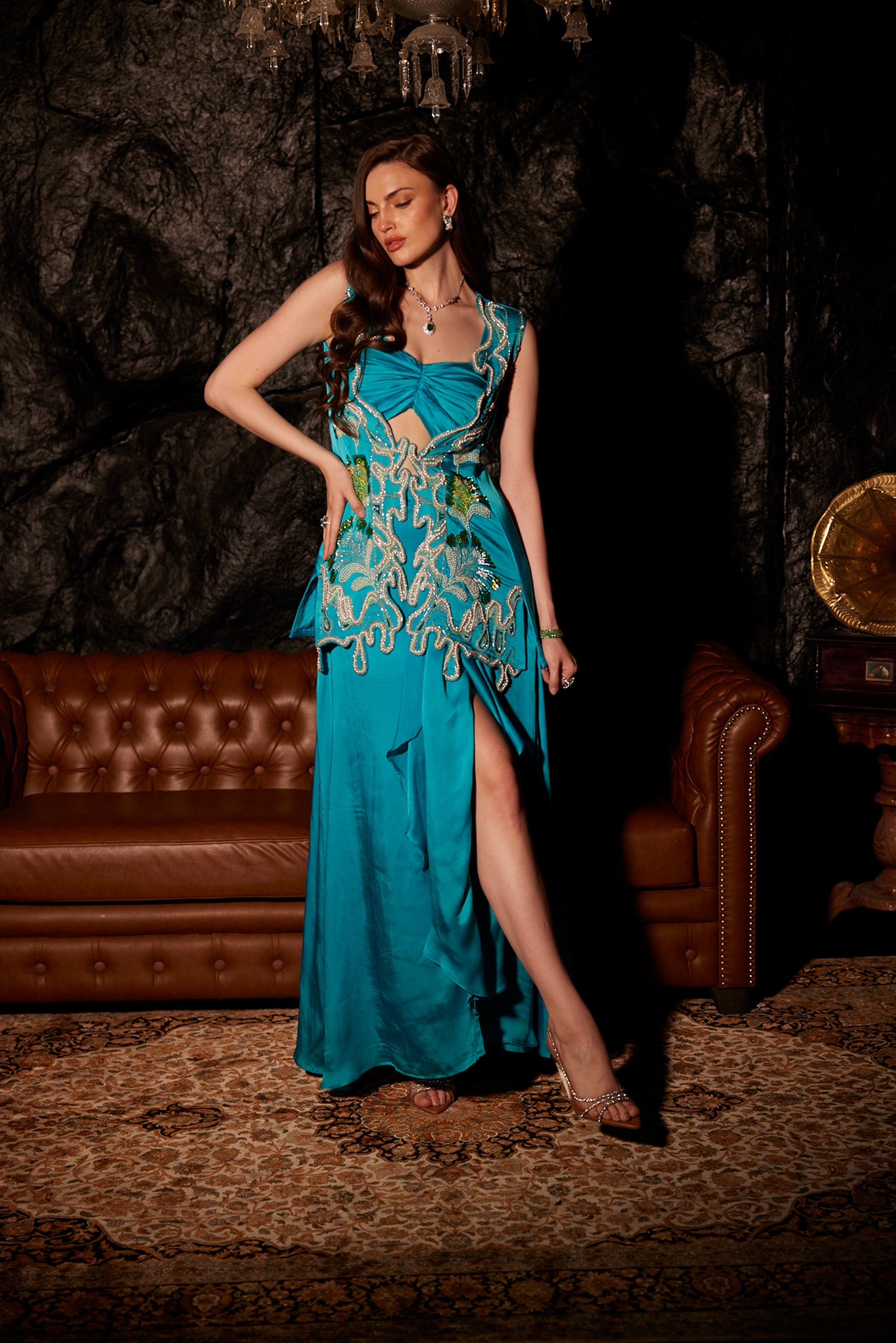 Aqua Breeze Front Slit Dress, adorned with an exquisite array of cutdana, pearls, beads, silver accents, diamond-like stones, delicate chains, and holographic detailing. Each element is intricately woven into the fabric, creating a luxurious texture that catches the light with every movement. Elevate your elegance with this dress, perfect for making a striking impression at any special occasion.