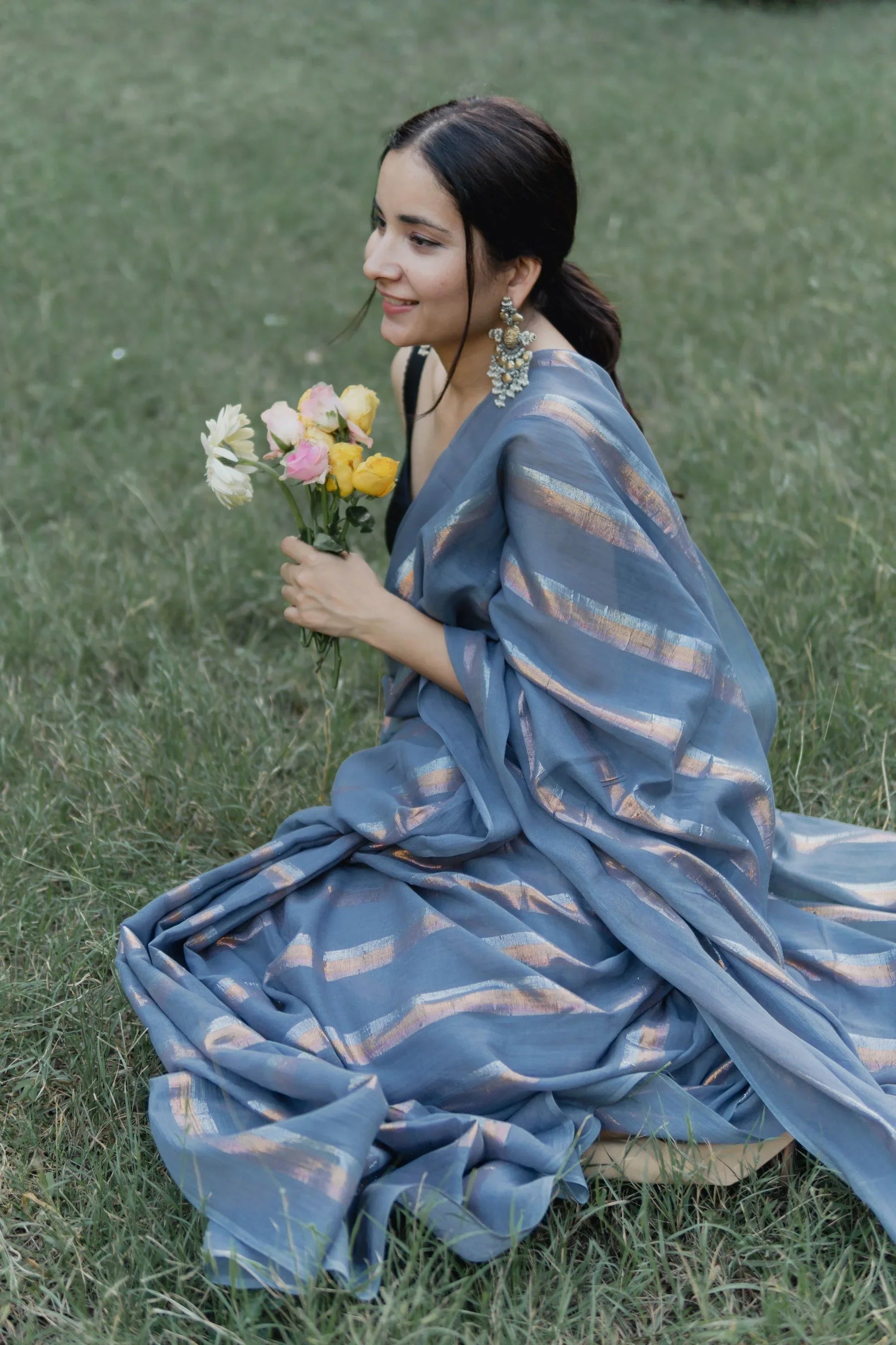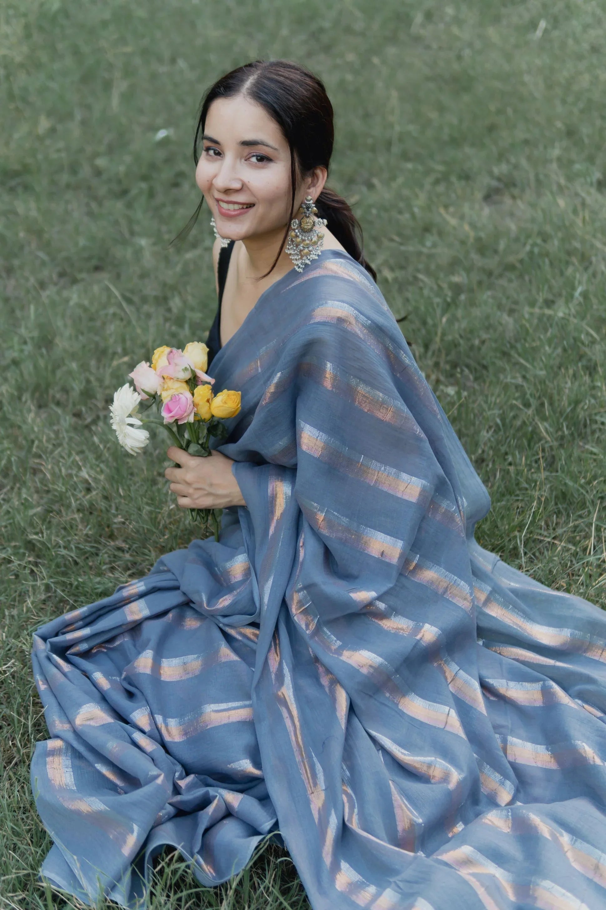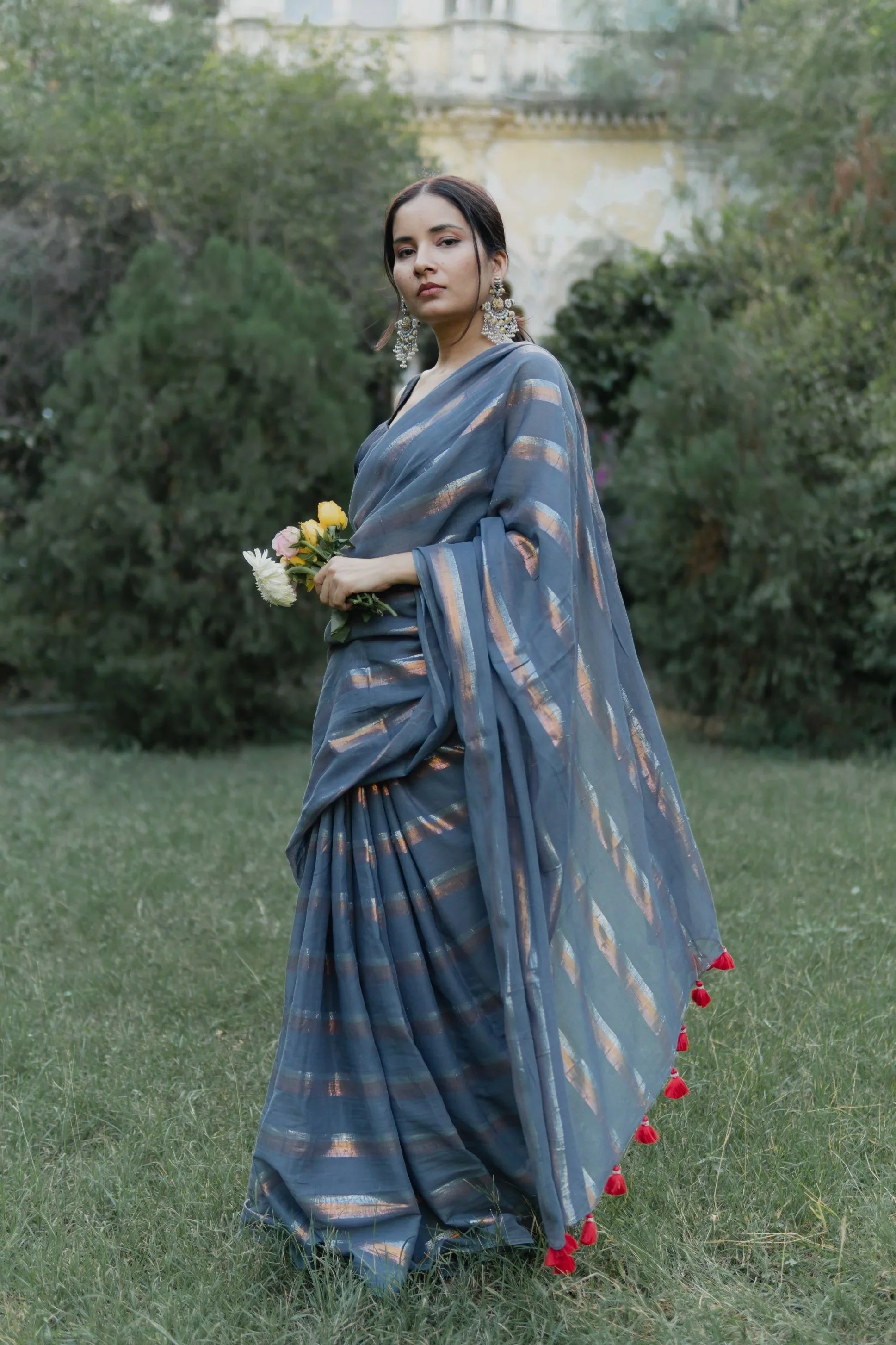 This saree is in cotton mulmul fabric with silver and gold lurex stripes. Saree has red color tassels at the pallu to enhance the look. Saree fabric is soft and flowy. Its very easy to drape, perfect for any occasion.