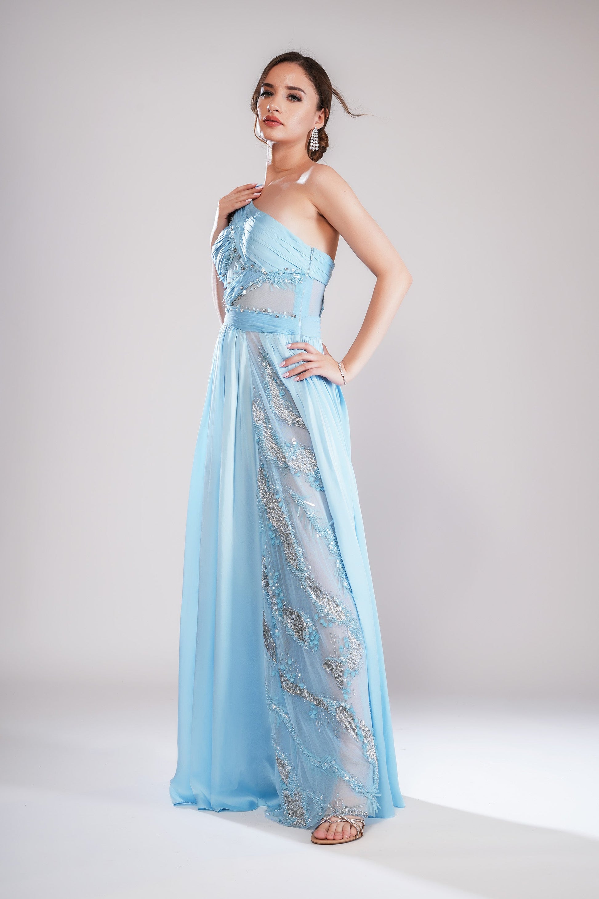 An ice blue gown featuring an asymmetric one-shoulder design with a pleated, embellished bodice and a tulle skirt panel with a flowing, pleated skirt. The shimmering panel adds a touch of sparkle, creating a timeless and elegant silhouette perfect for high-fashion events.