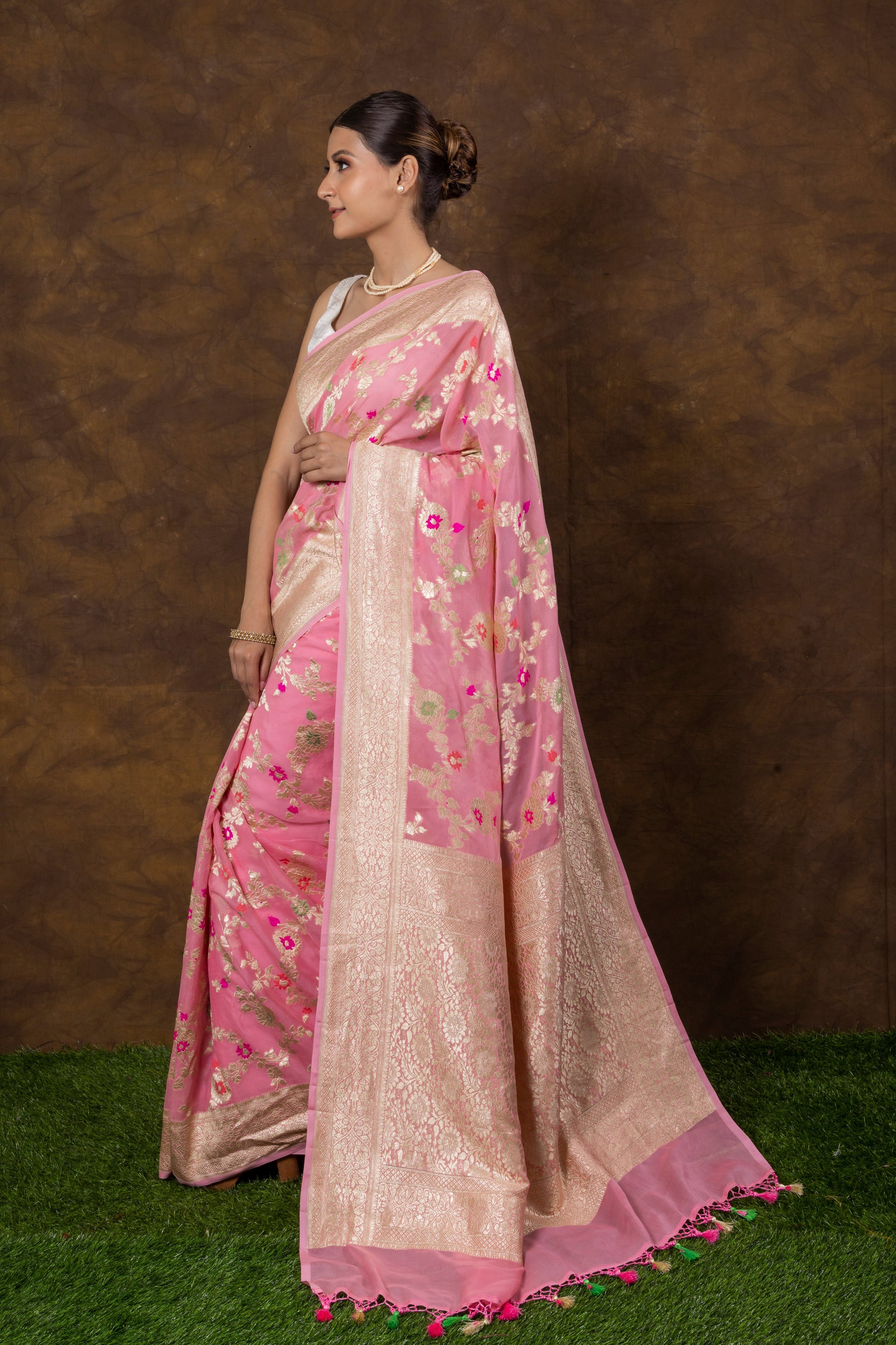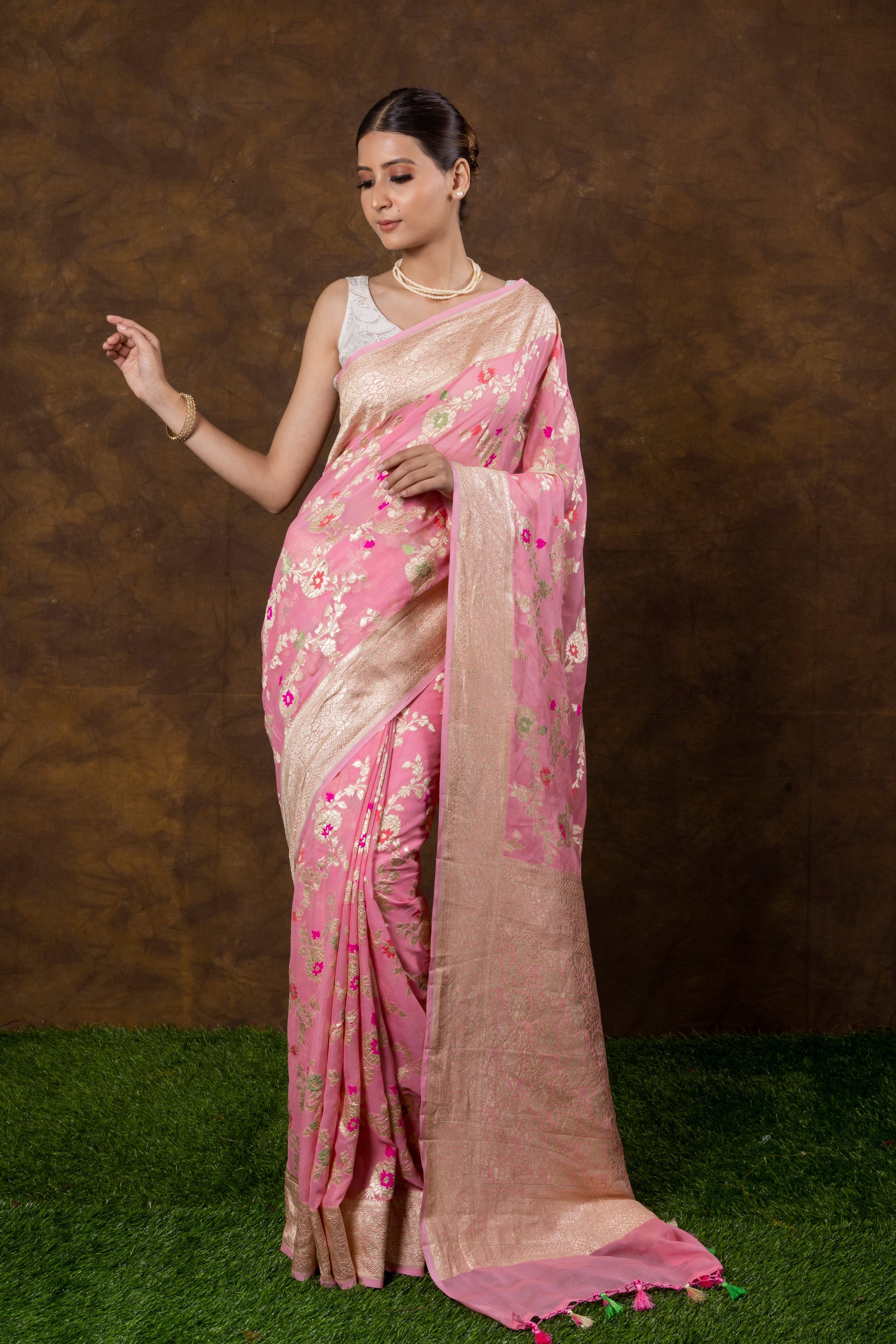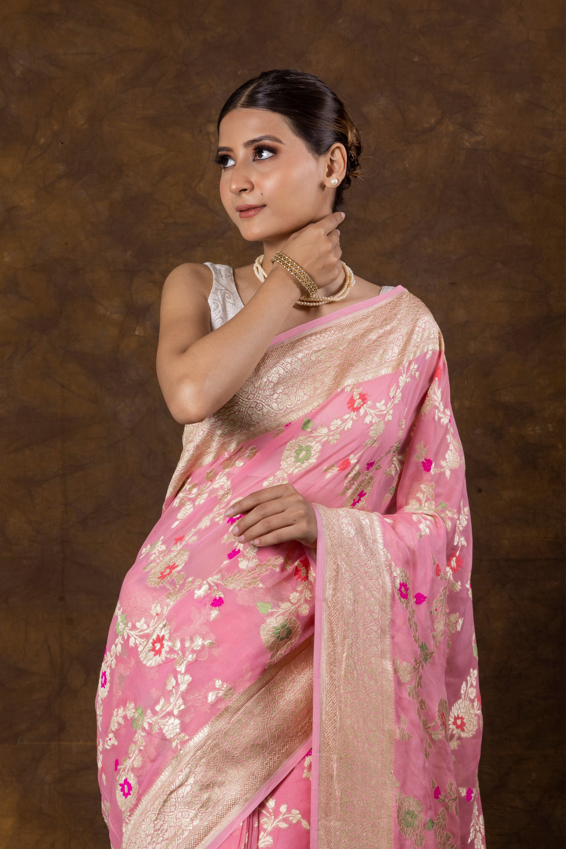 Product Description: The Baby Pink Georgette Khaddi Pure Silk Saree is a masterpiece of Banarasi craftsmanship. It features an exquisite Jaal design with multi-color meena work and a radiant gold zari border and aachal. This saree is a symbol of timeless elegance and showcases the artistry of handloom Banarasi weaving.