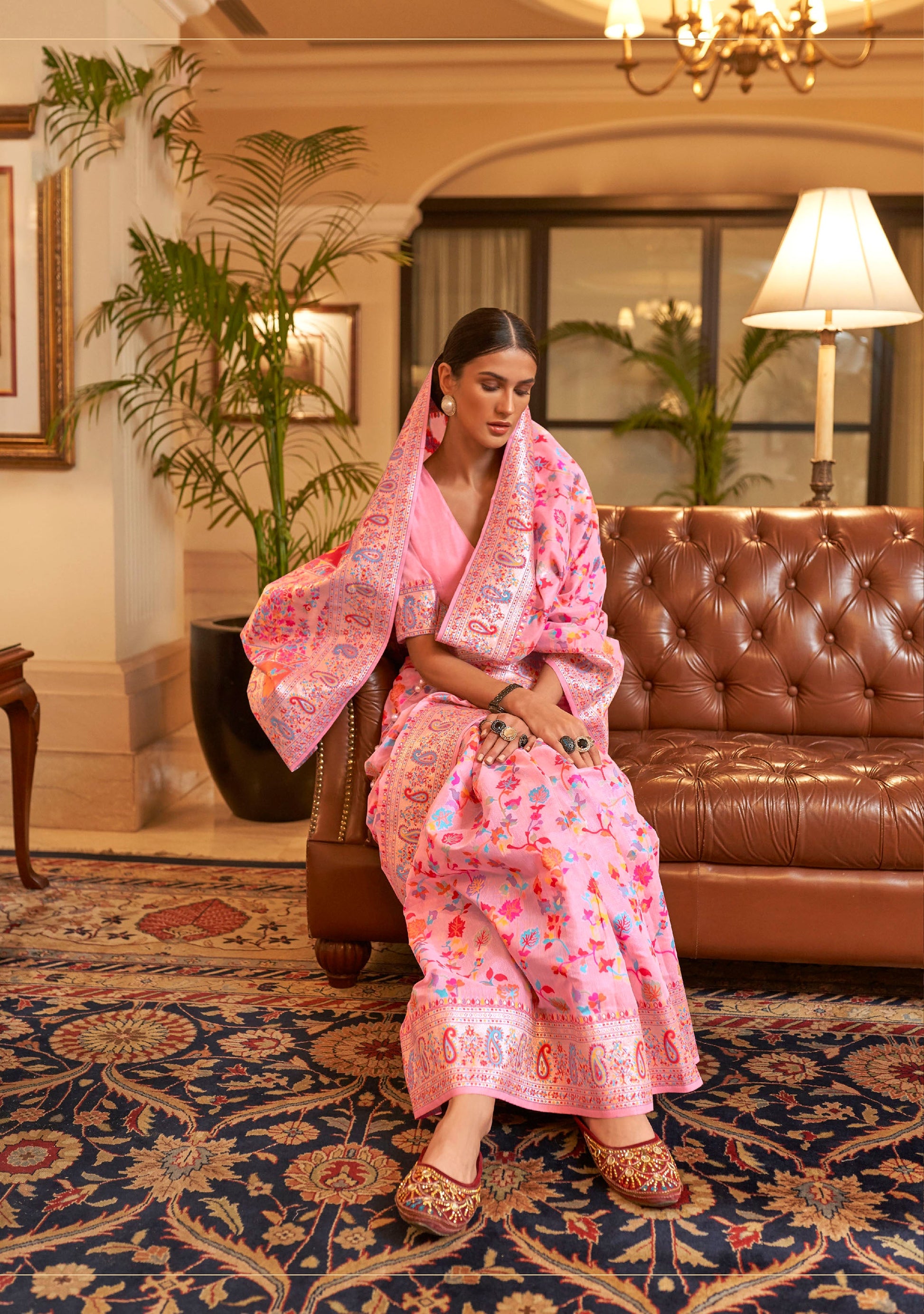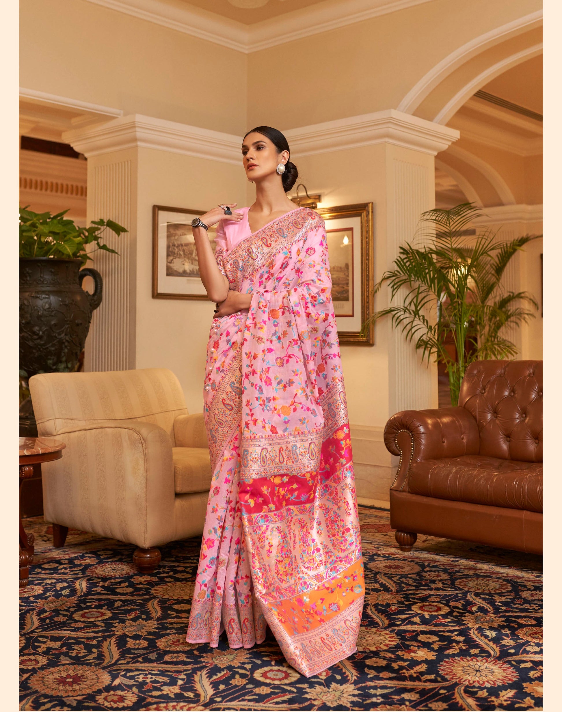 Does your wardrobe need more versatility? Then, check out this. Let your skin feel the refreshing touch as you adorn this superior-quality lightweight Baby Pink Kashmiri Silk Woven Saree to match the overall modest design. If you're yearning to make a fashion statement in your outfit, pick this Zari embroidery design for any occasion, such as wedding receptions, engagement parties, and sangeets. A wedding Guest would look gorgeous in this Baby Pink Kashmiri Silk Woven Saree. Don't wait. Just go ahead and order.