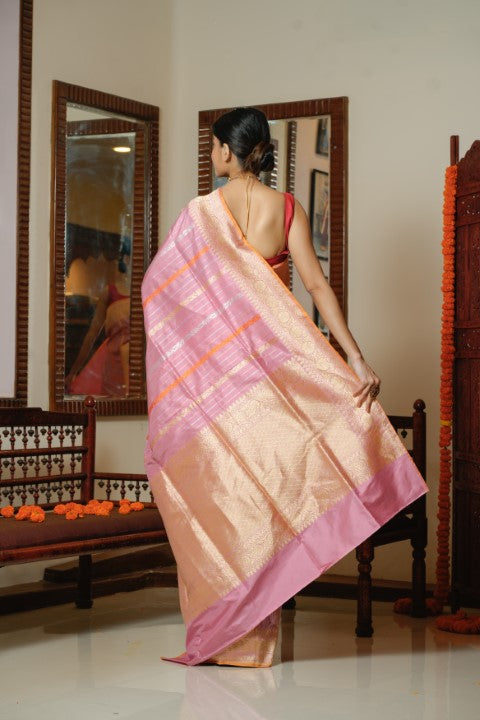 Product Description: Elevate your ethnic wardrobe with the timeless elegance of the Katan Pure Silk Saree. Handwoven using the Kadhwa technique in the Handloom Banarasi tradition, this saree weighs 770 gms and features a mesmerizing Multi-Color Stripe Pattern with intricate Gold and Silver zari work. The saree spans 5.50 meters for the body, accompanied by an additional 0.90 meters for the blouse piece, with a width of 110 cms.