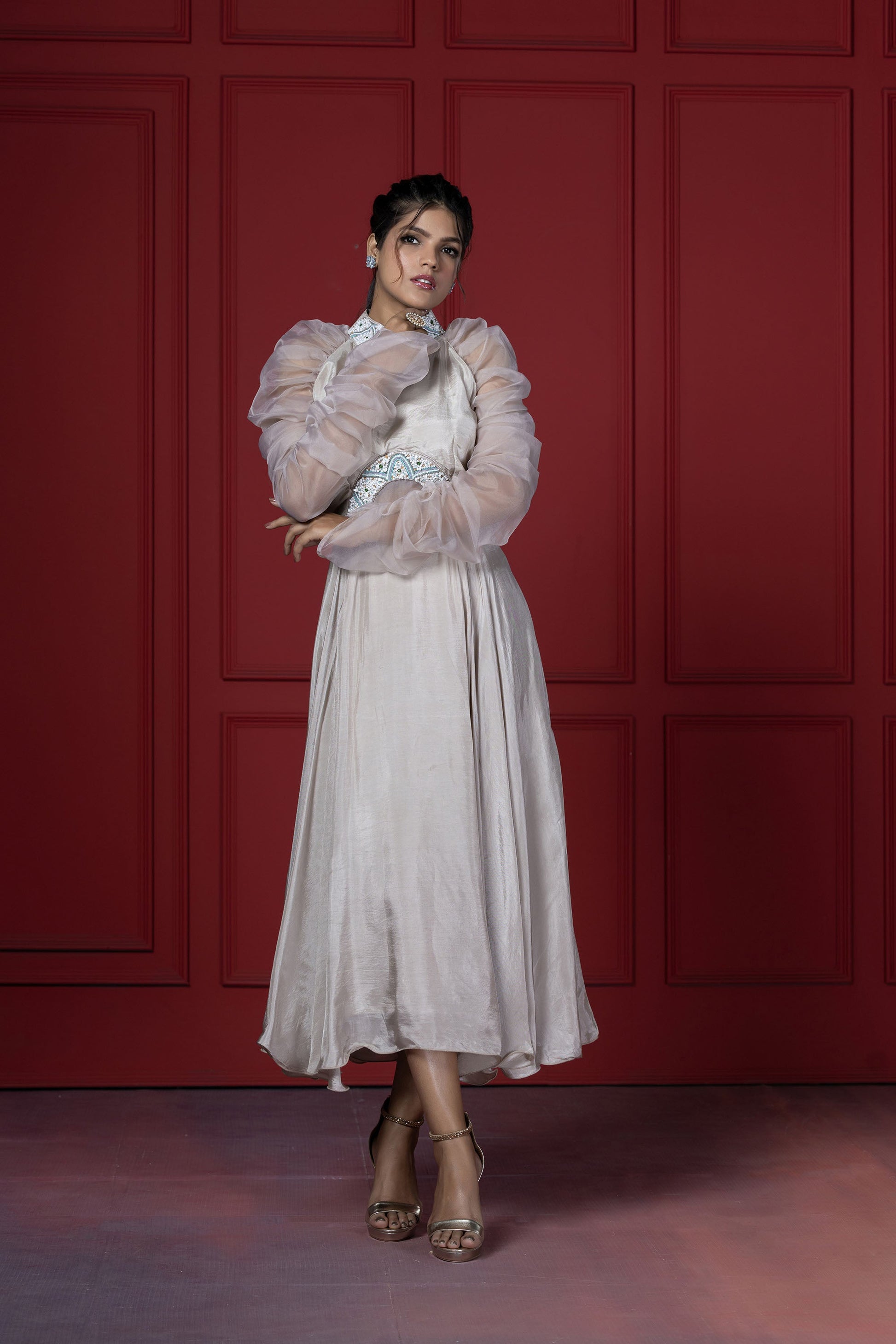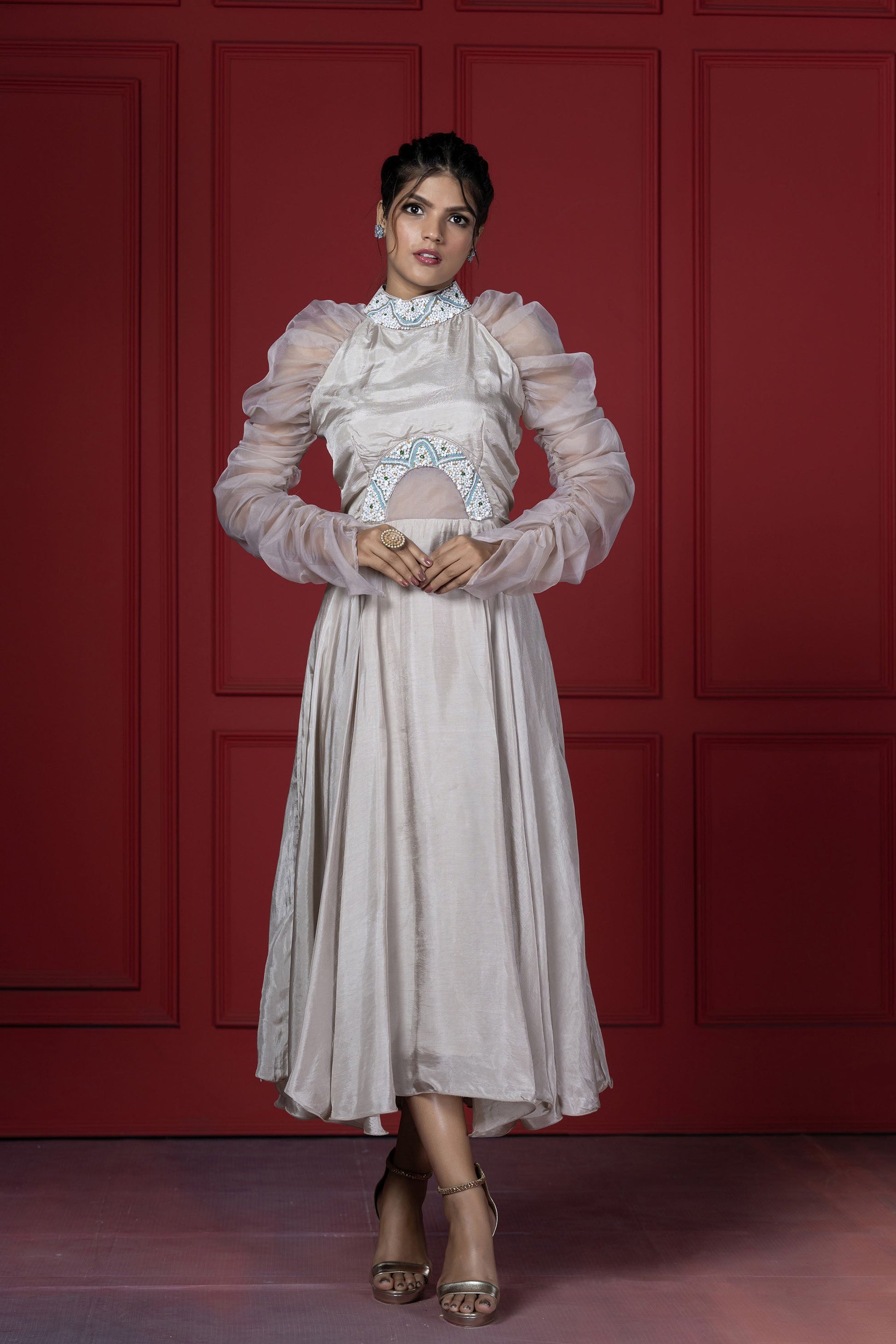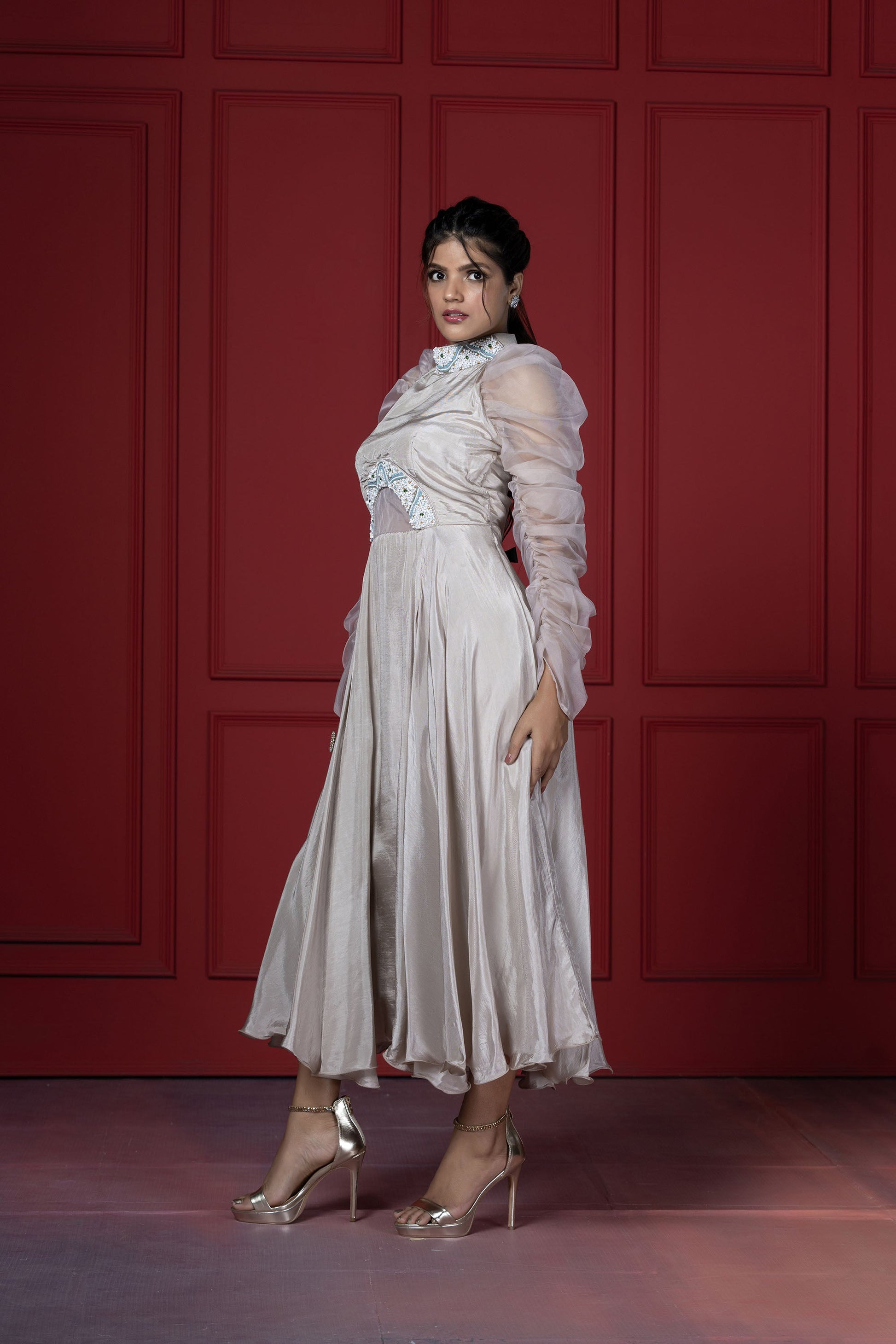 This dress blends the elegant tone of beige with playful feminine elements. Main attraction point are the sleeves that are puffed up with elastic on the sides of the sleeve.