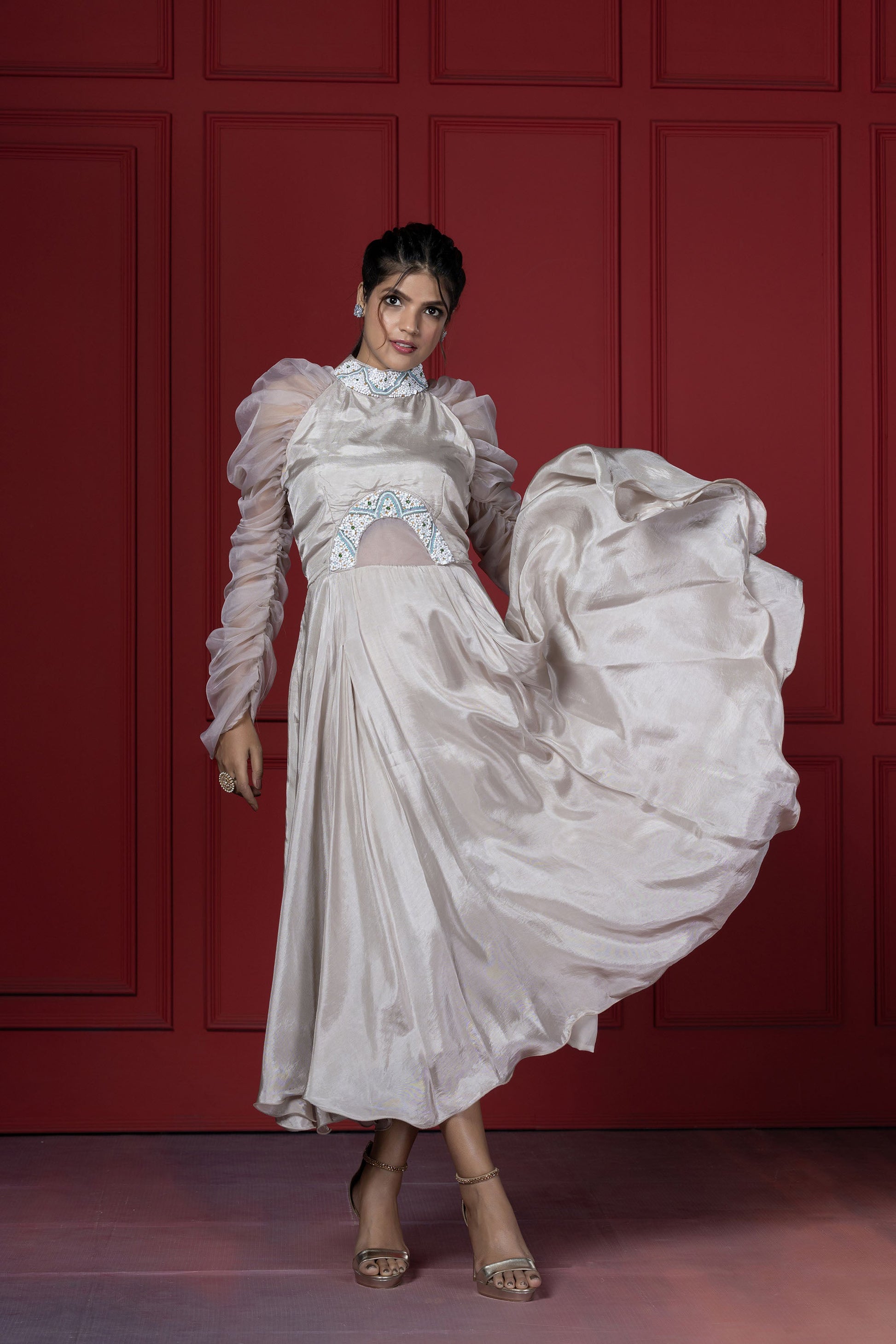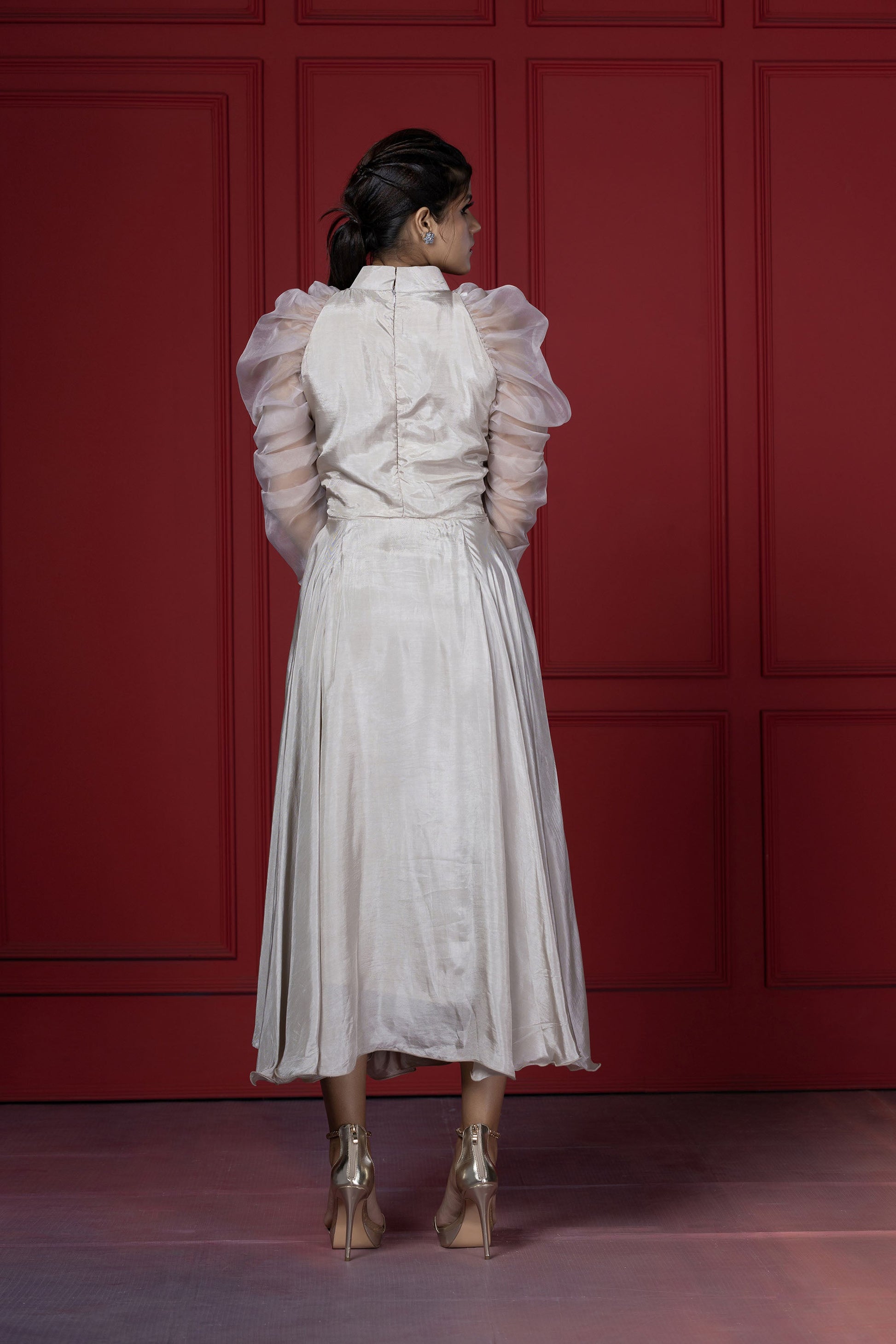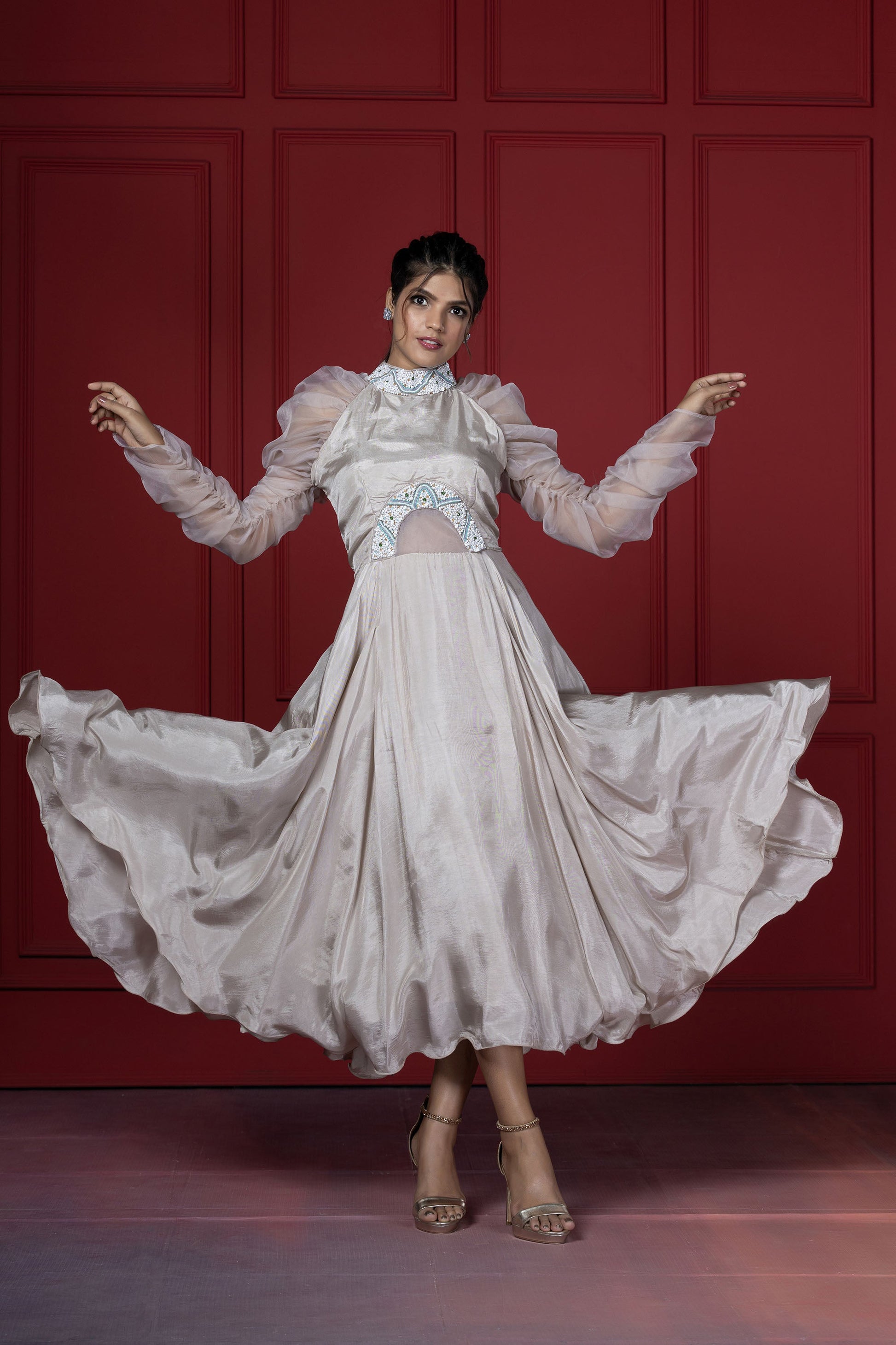 This dress blends the elegant tone of beige with playful feminine elements. Main attraction point are the sleeves that are puffed up with elastic on the sides of the sleeve.