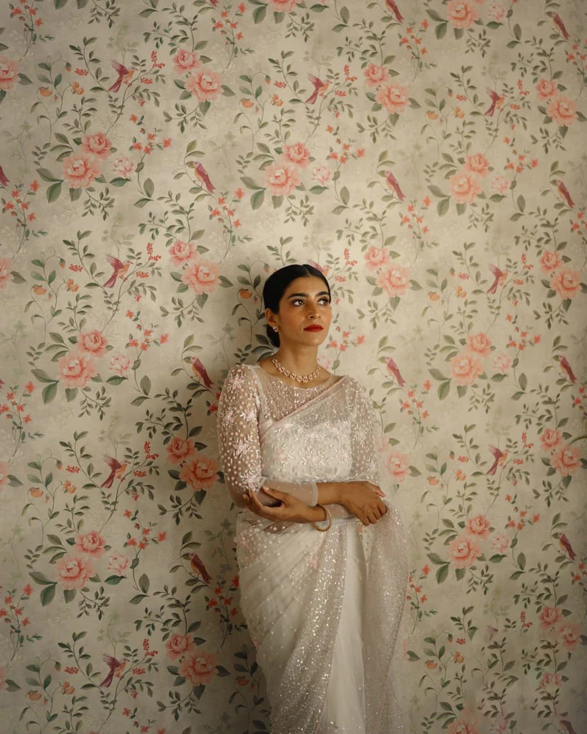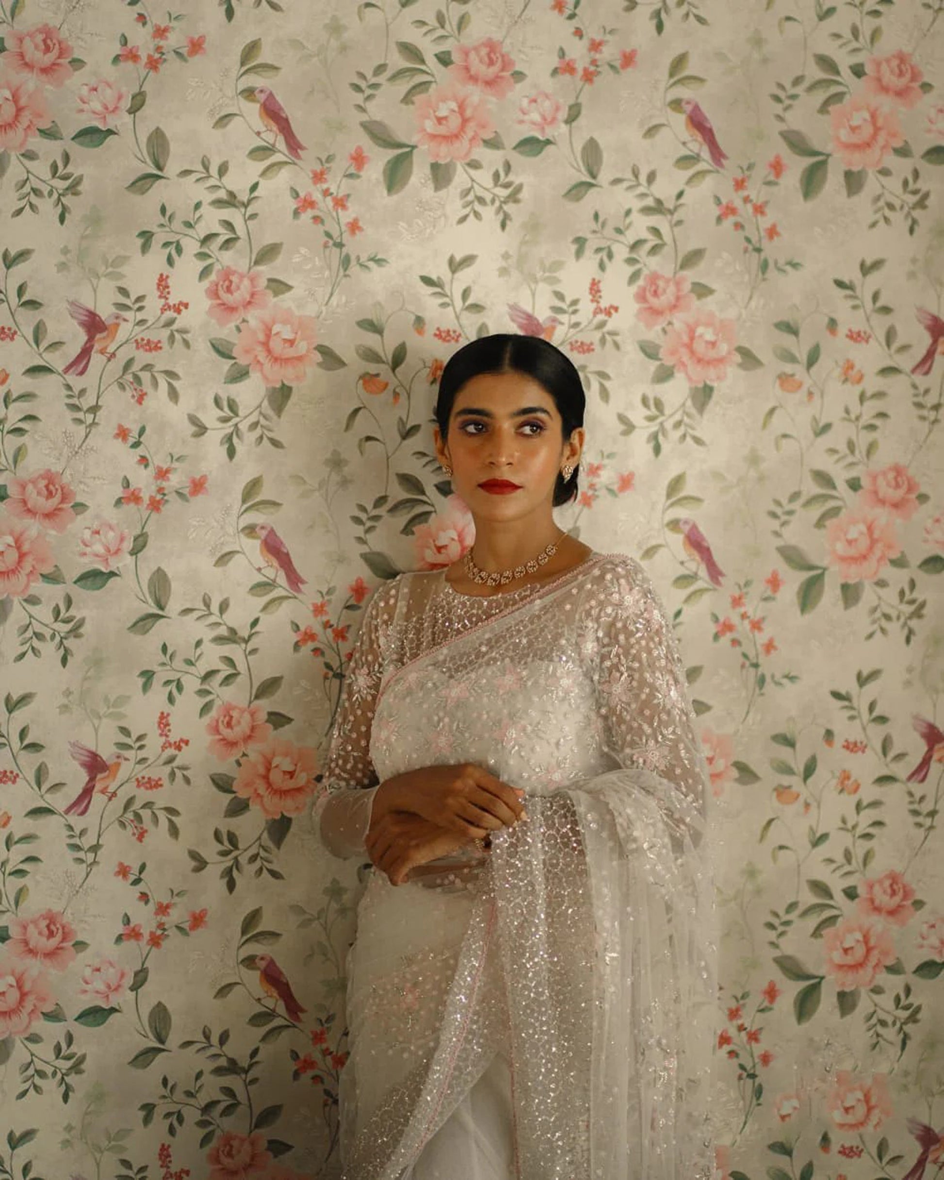 In beautiful and elegant looking white saree with beautiful hand embroidery with mix of a pastel shade