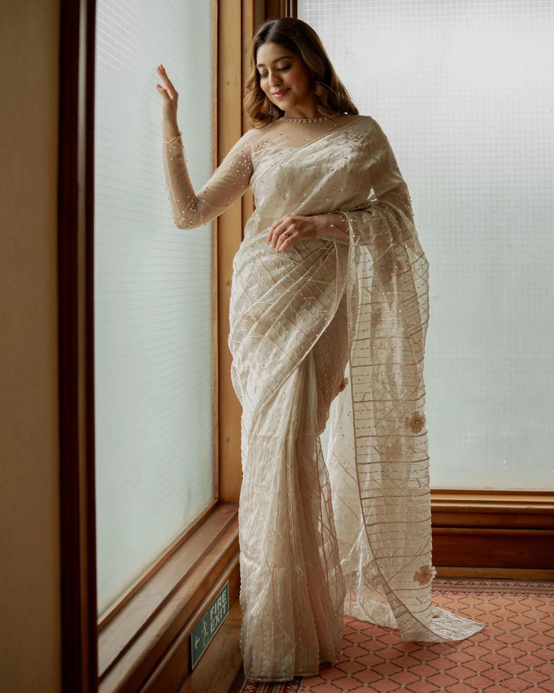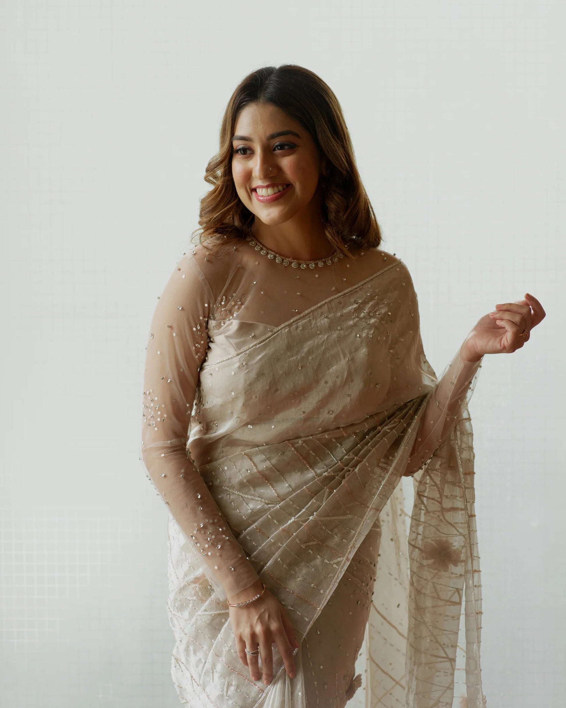 A vision of elegance and draped in majestic beige, rose, and nude net saree with intricate beaded work that shines brightly, Our bride with a true masterpiece, a work of art that will be etched in our hearts