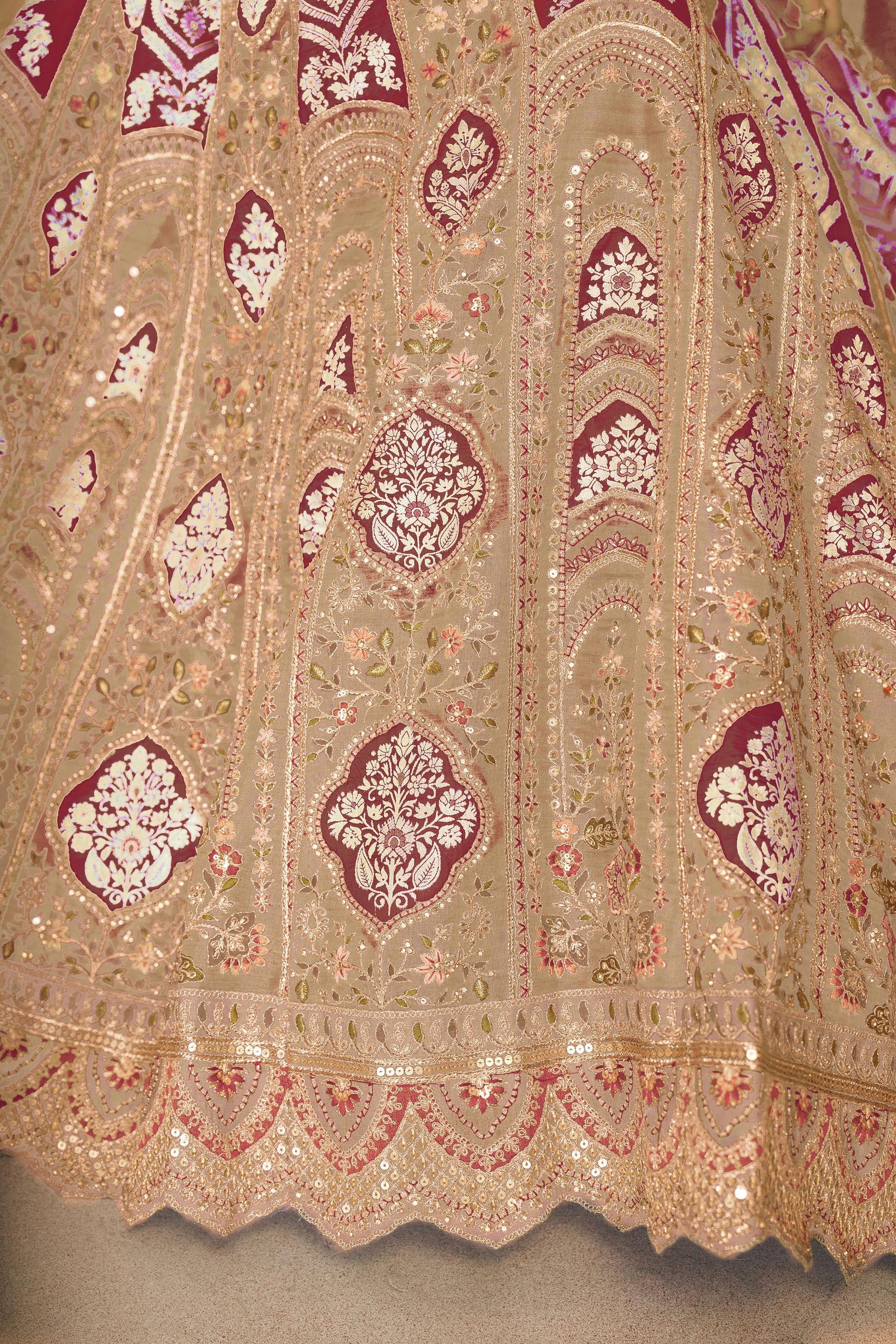 Beige Aari Embroidered Silk Lehenga For Wedding