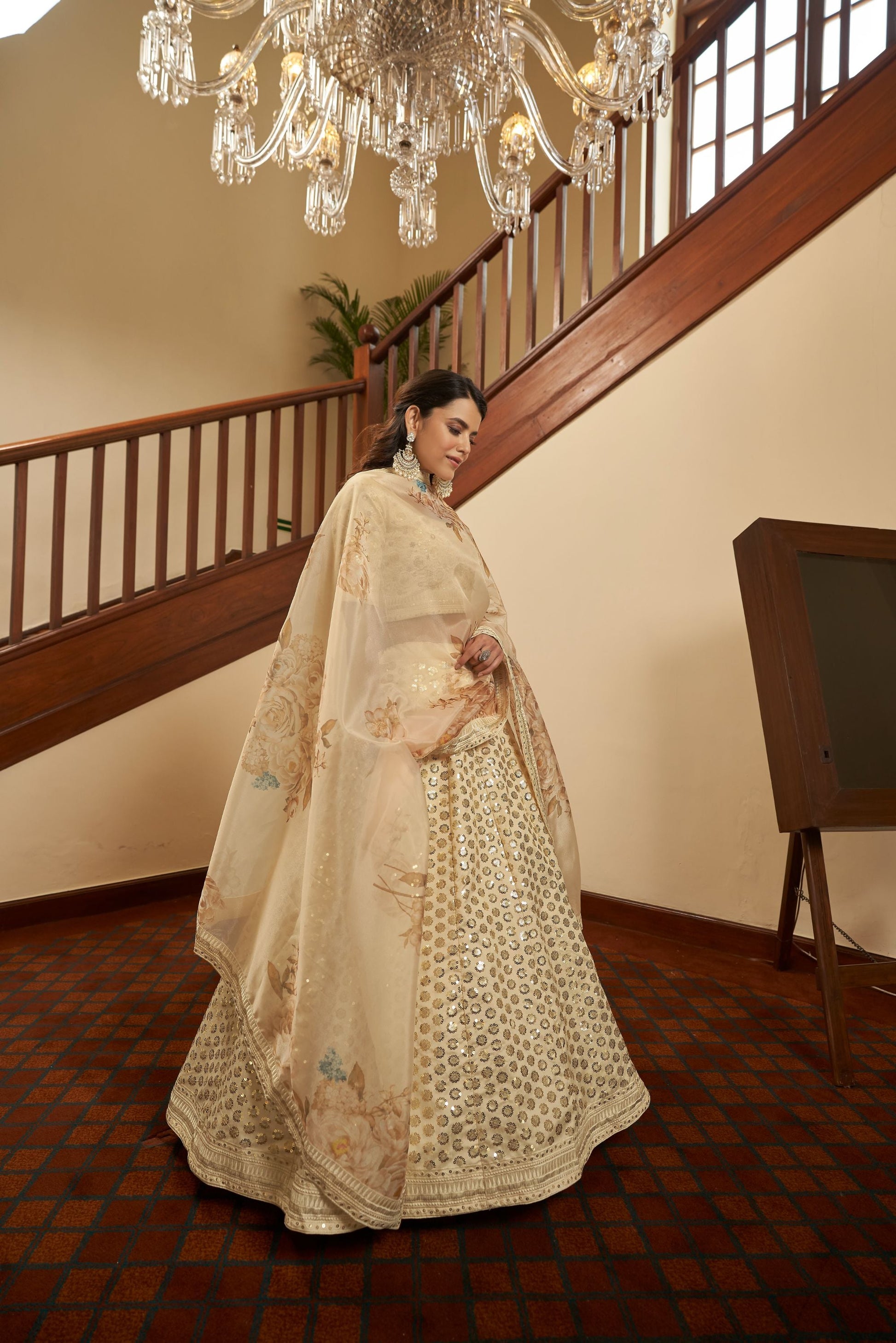 Looking for a lehenga that is both traditional and modern? Look no further than this beige art silk lehenga! The beautiful art silk fabric is adorned with intricate embroidery in a classic beige hue. The lehenga comes with a matching dupatta and blouse, making it a complete ensemble.