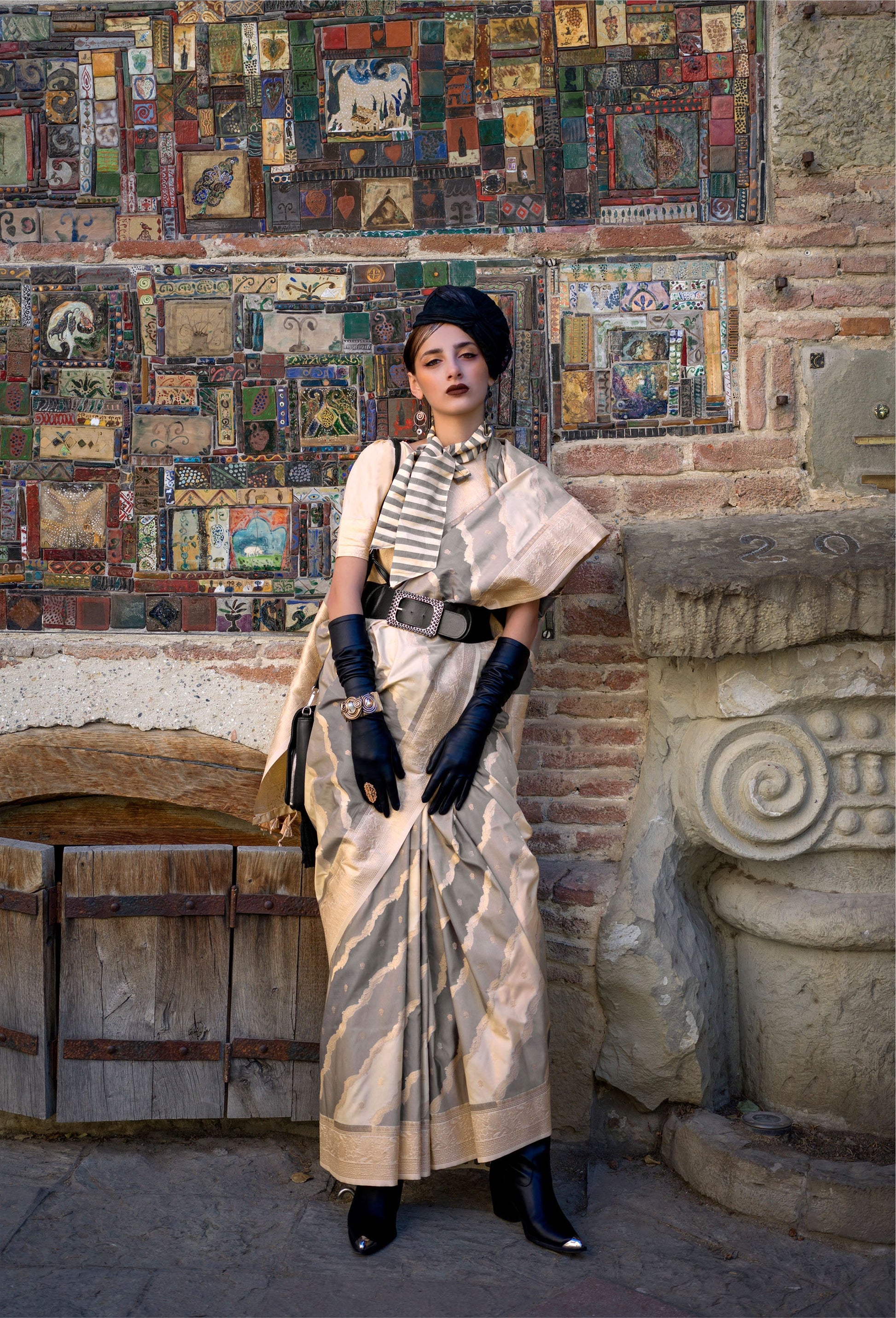 Beige Grey Kimbus Katan Silk Rangkaat Handloom Saree