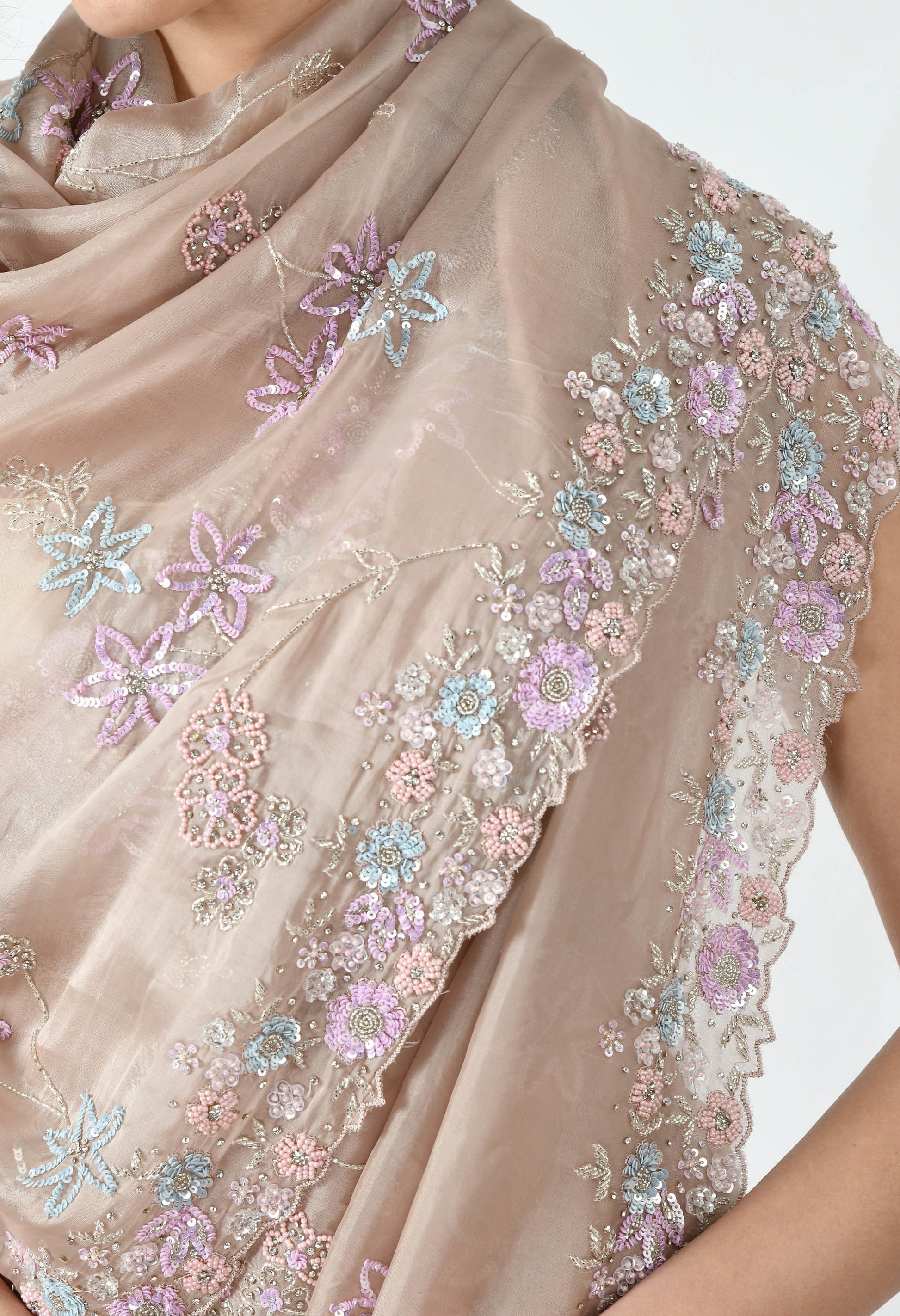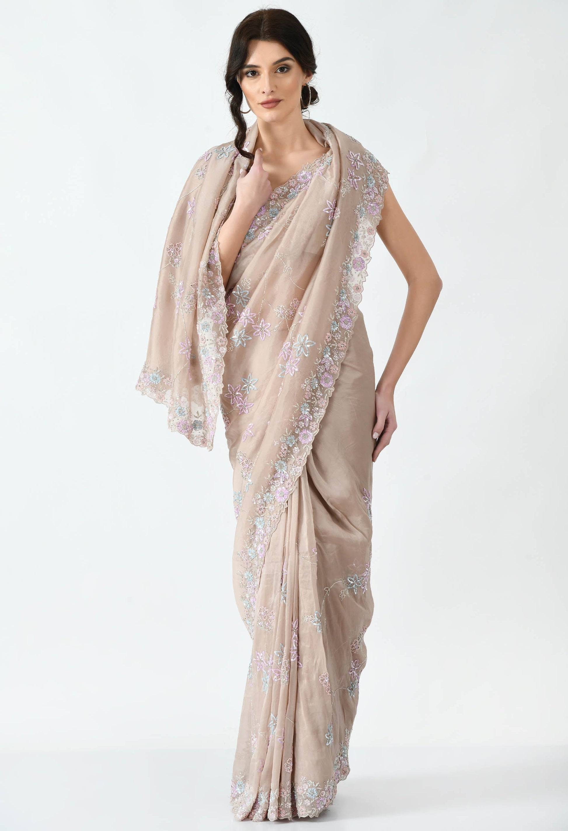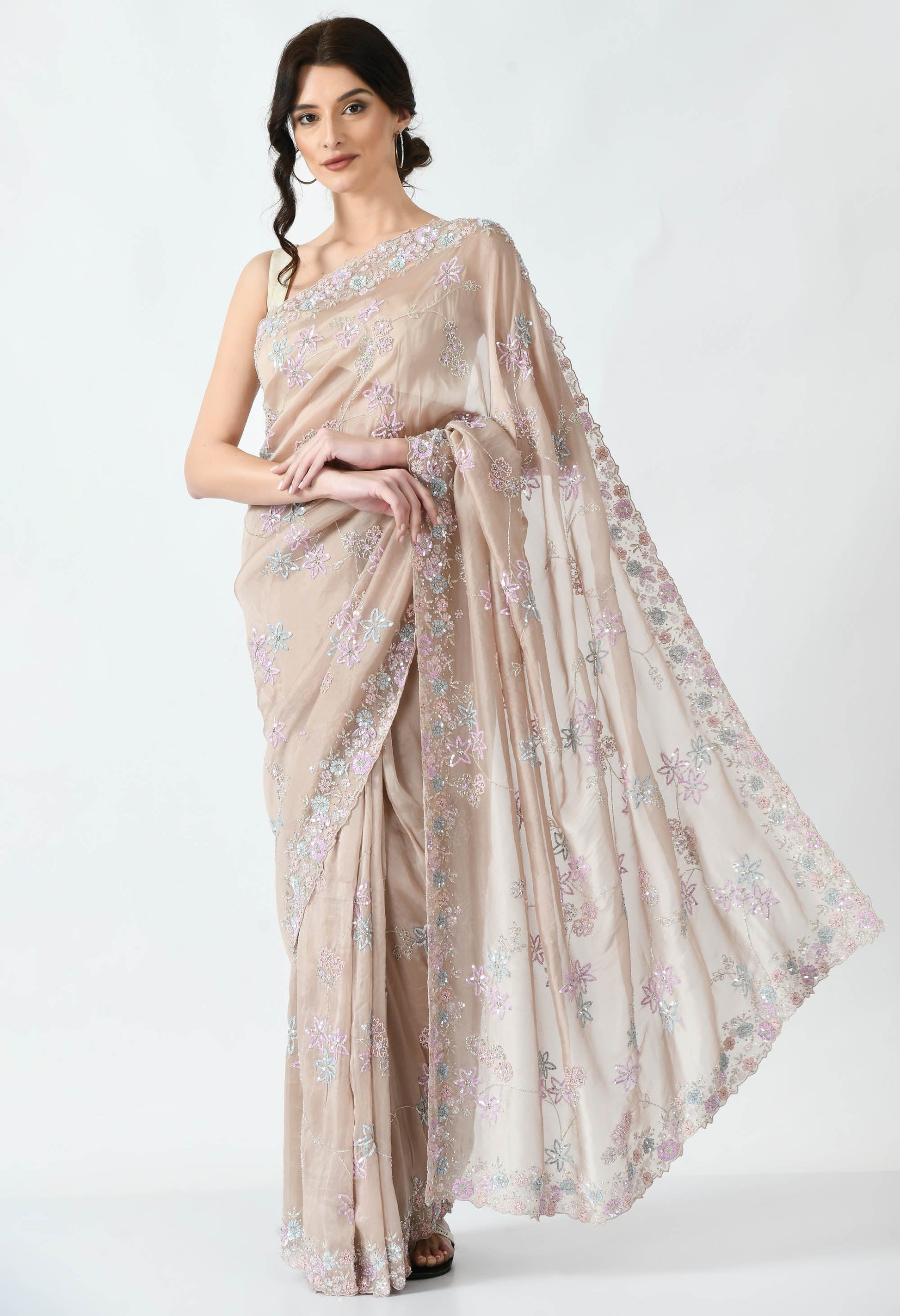 Beige Hand embroidered Floral Organza Special Designer Saree