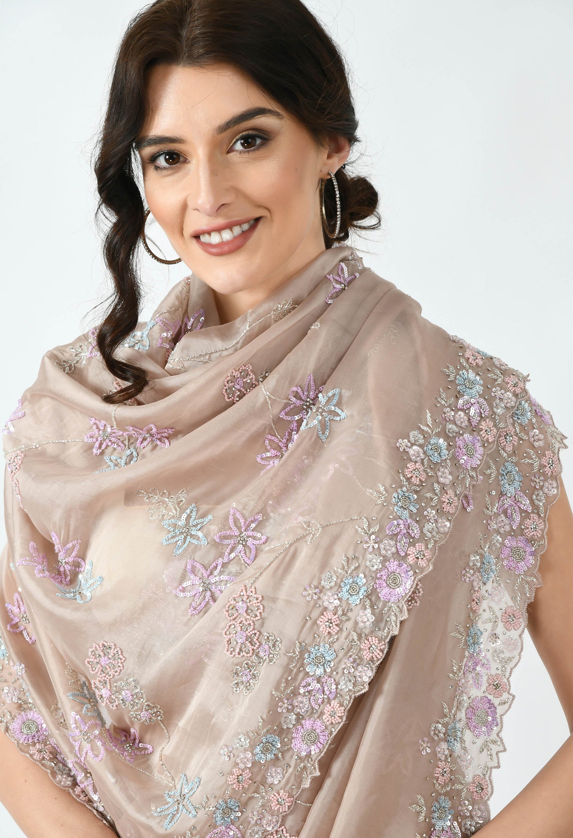 Dazzling Beige Hand embroidered Organza Special Designer Saree with hand embroidery work floral motifs. This is a saree that is tailor made efficiently with perfect exquisite detailing. Handmade to Embrace your special moments. Suitable for Parties , family gatherings and Weddings. Perfect for a wedding Guest