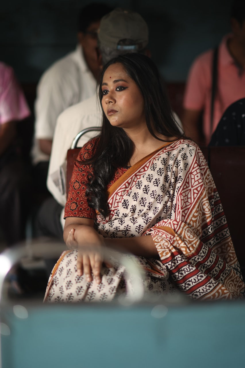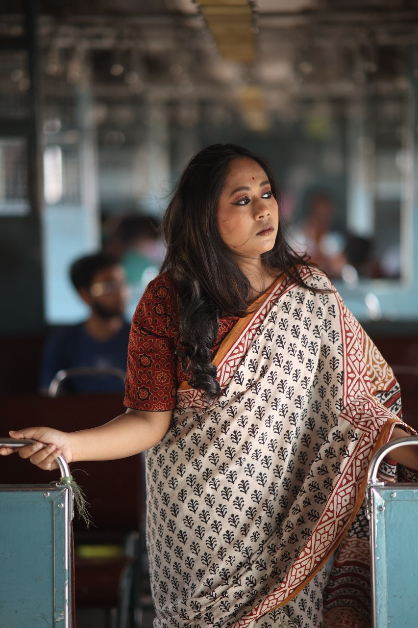 Beige Bagru White Saree with Rust Motif - Handblock Print Natural Dyed - Mulmul Cotton Saree