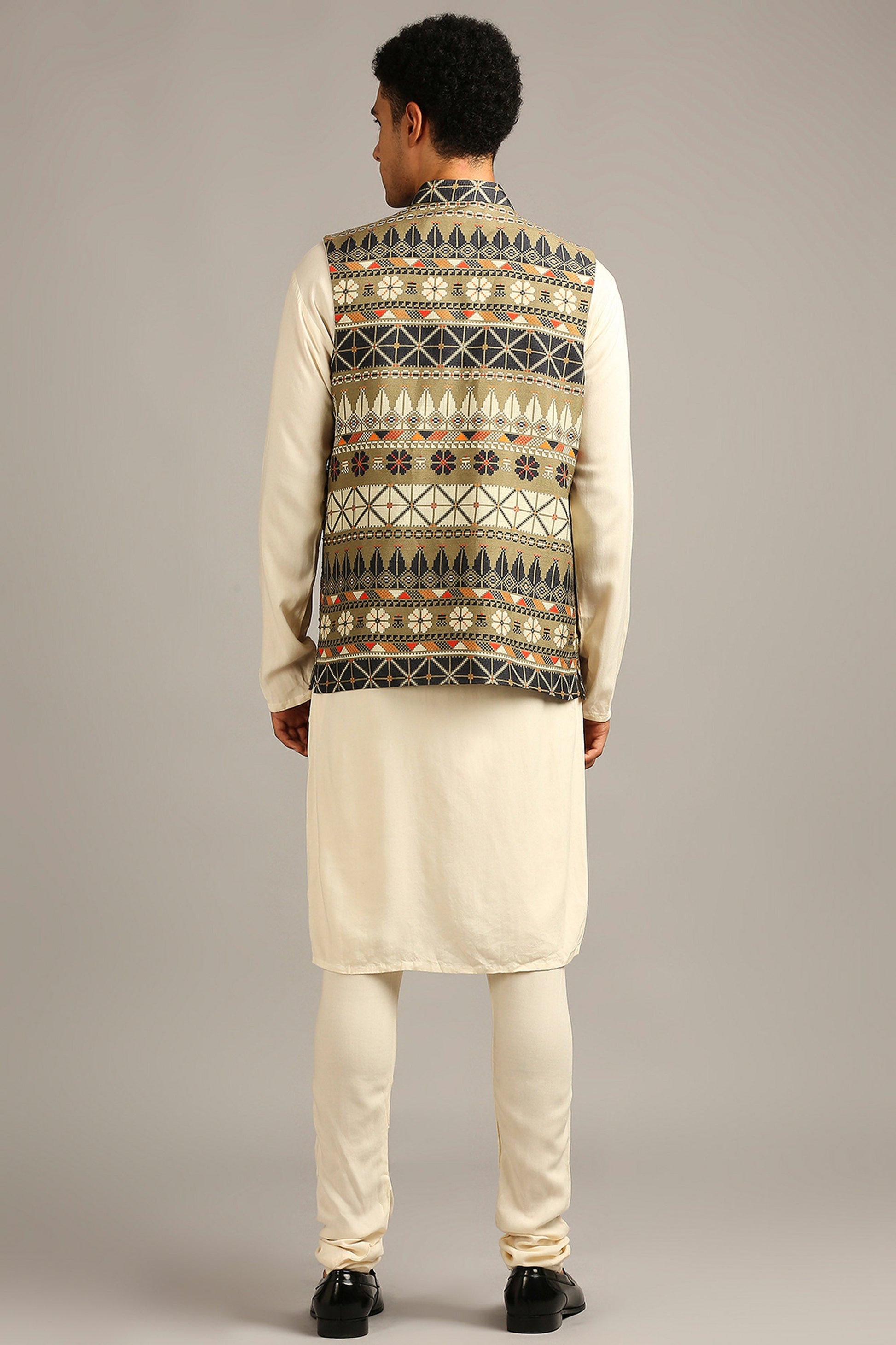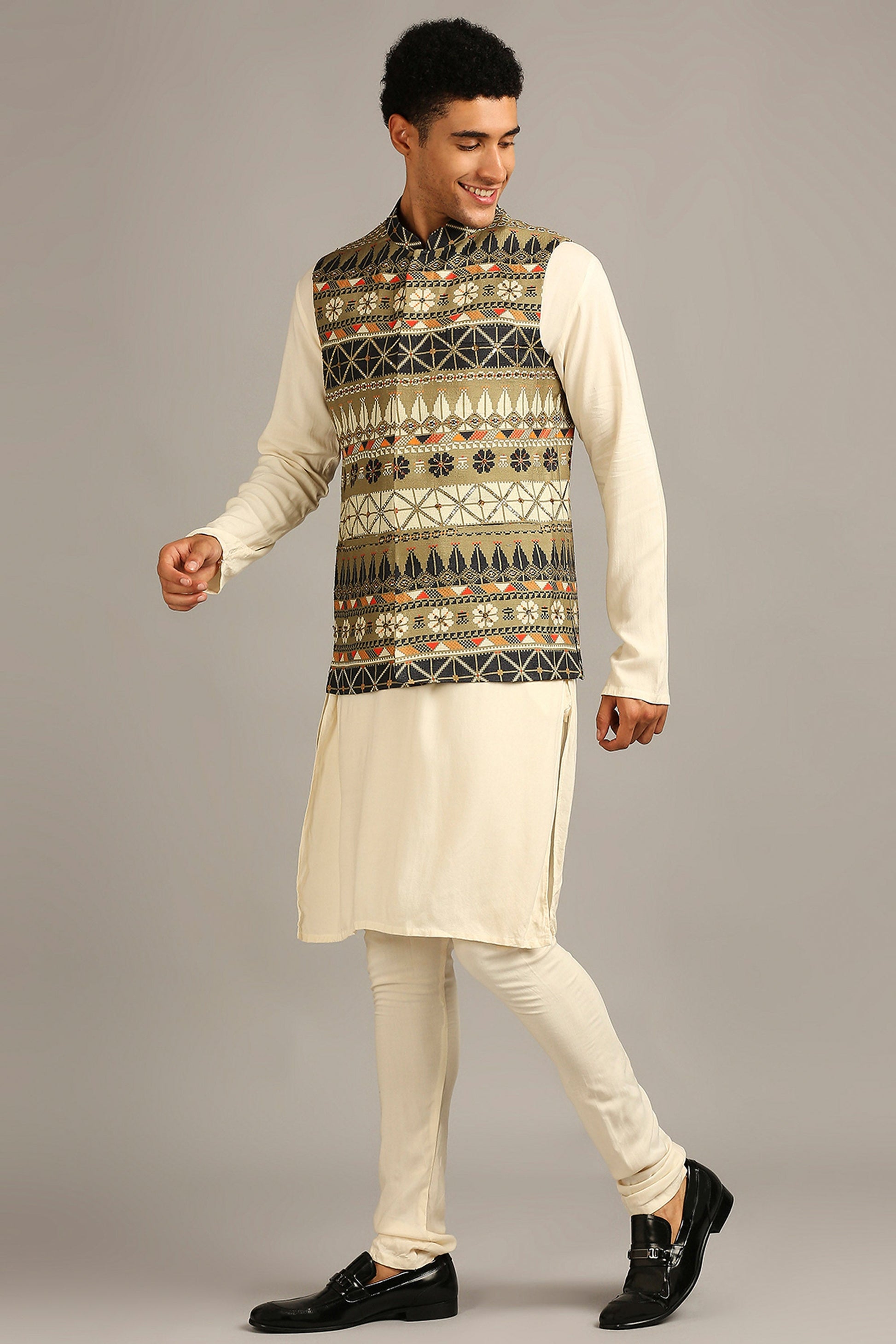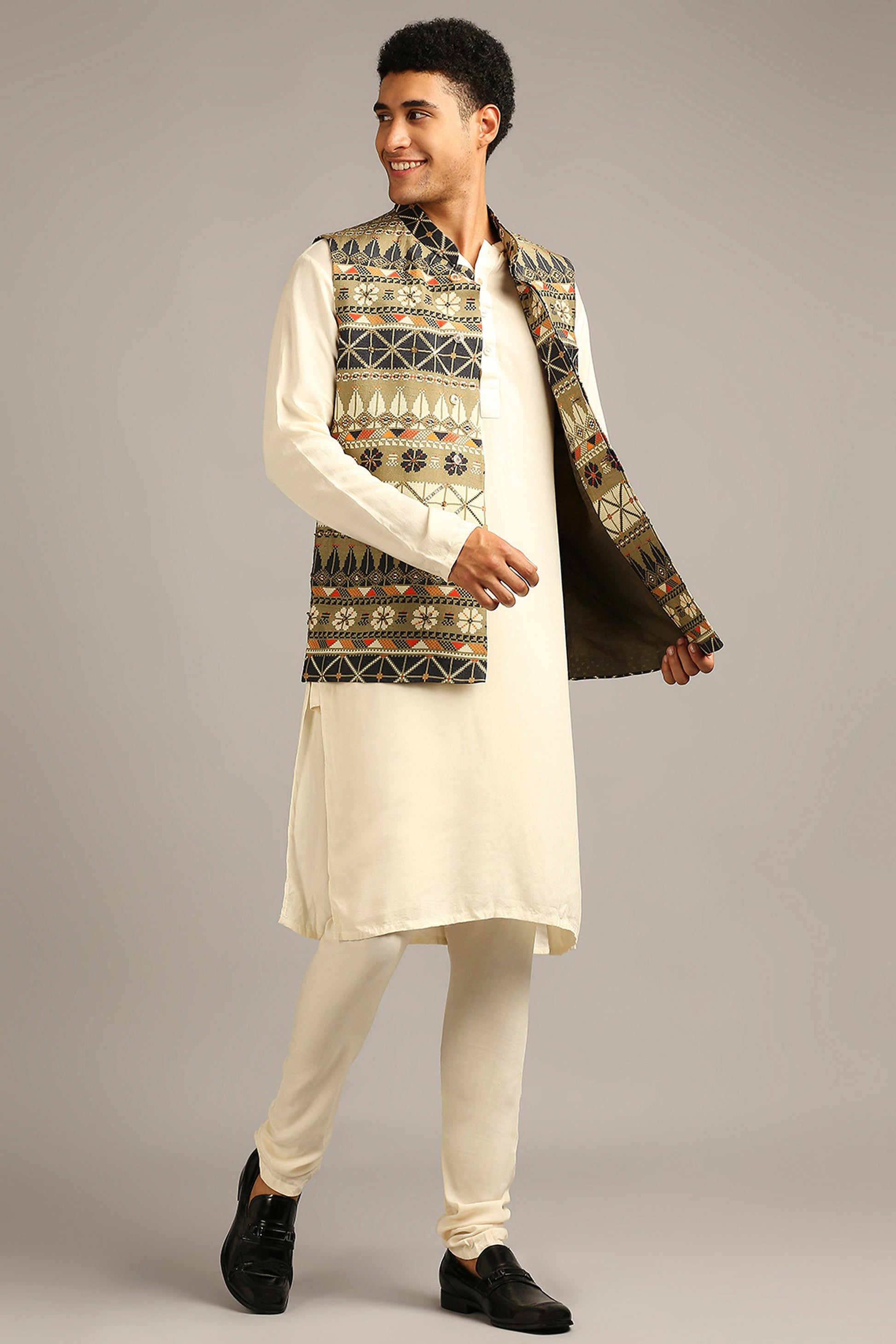 Beige,Green Silk Tiraz printed bundi with kurta set