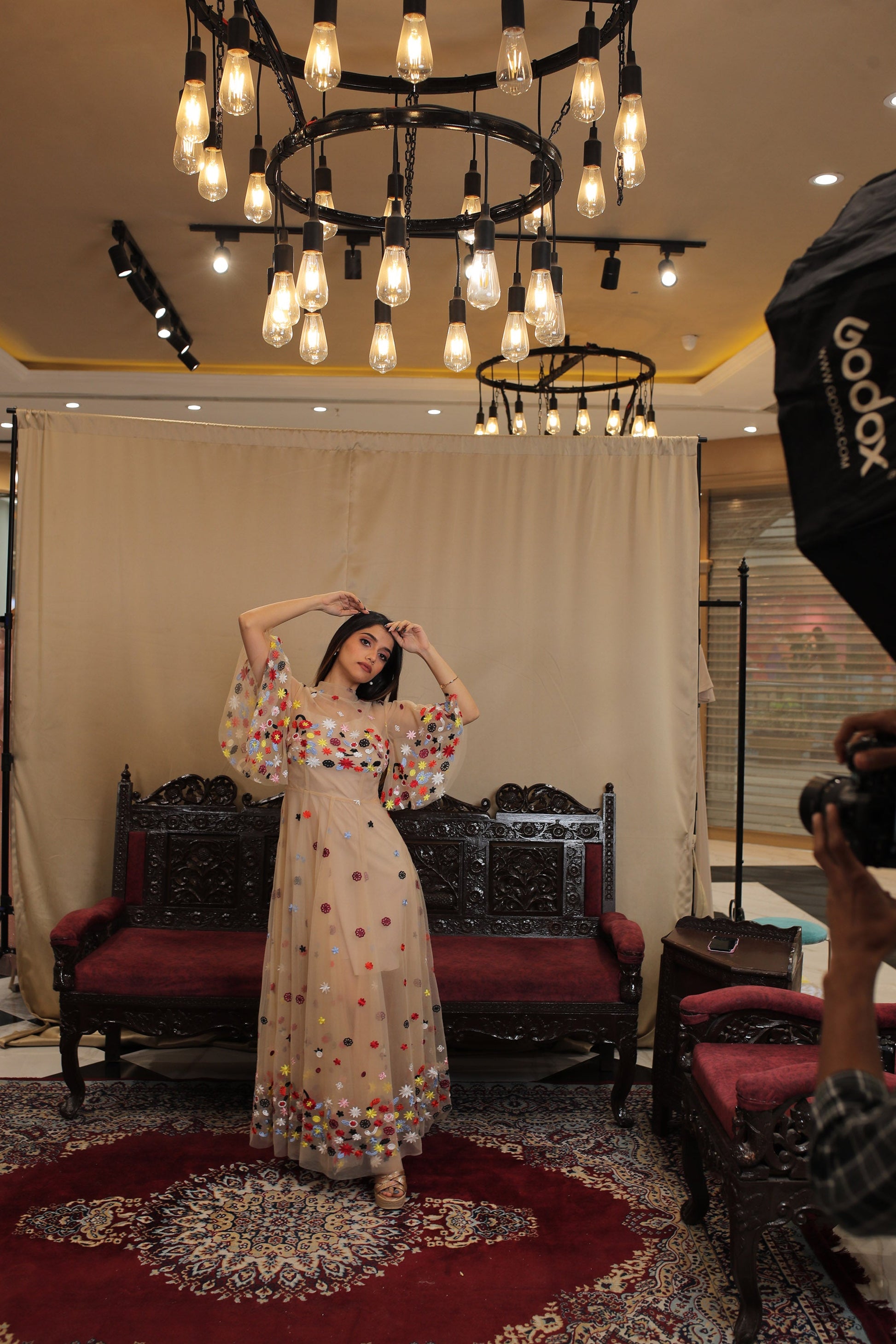 Beige Tulle Floral embroidered ankle - length round - neck Designer dress