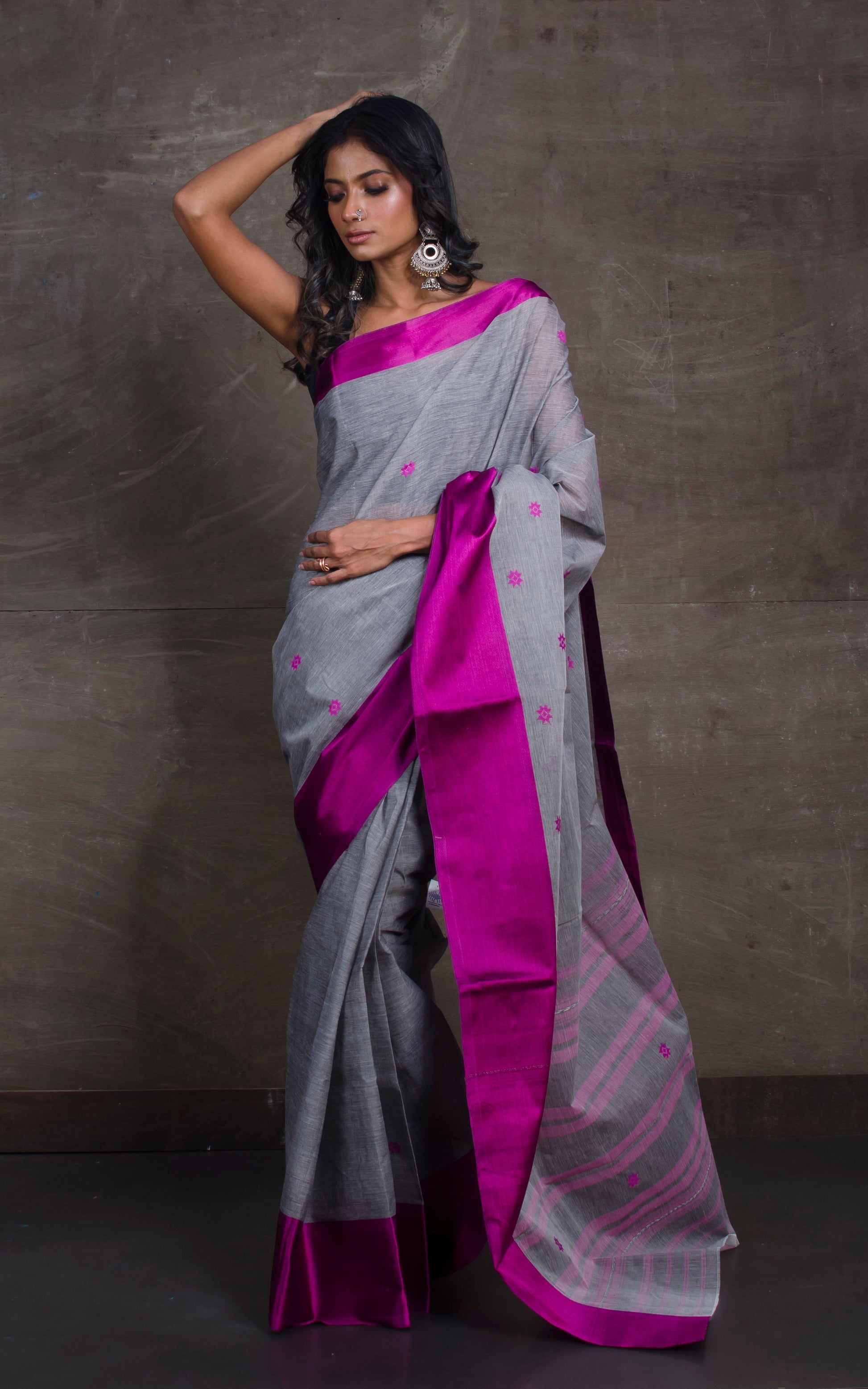 Bengal Handloom Satin Silk Border Cotton Saree in Steel Grey and Magenta