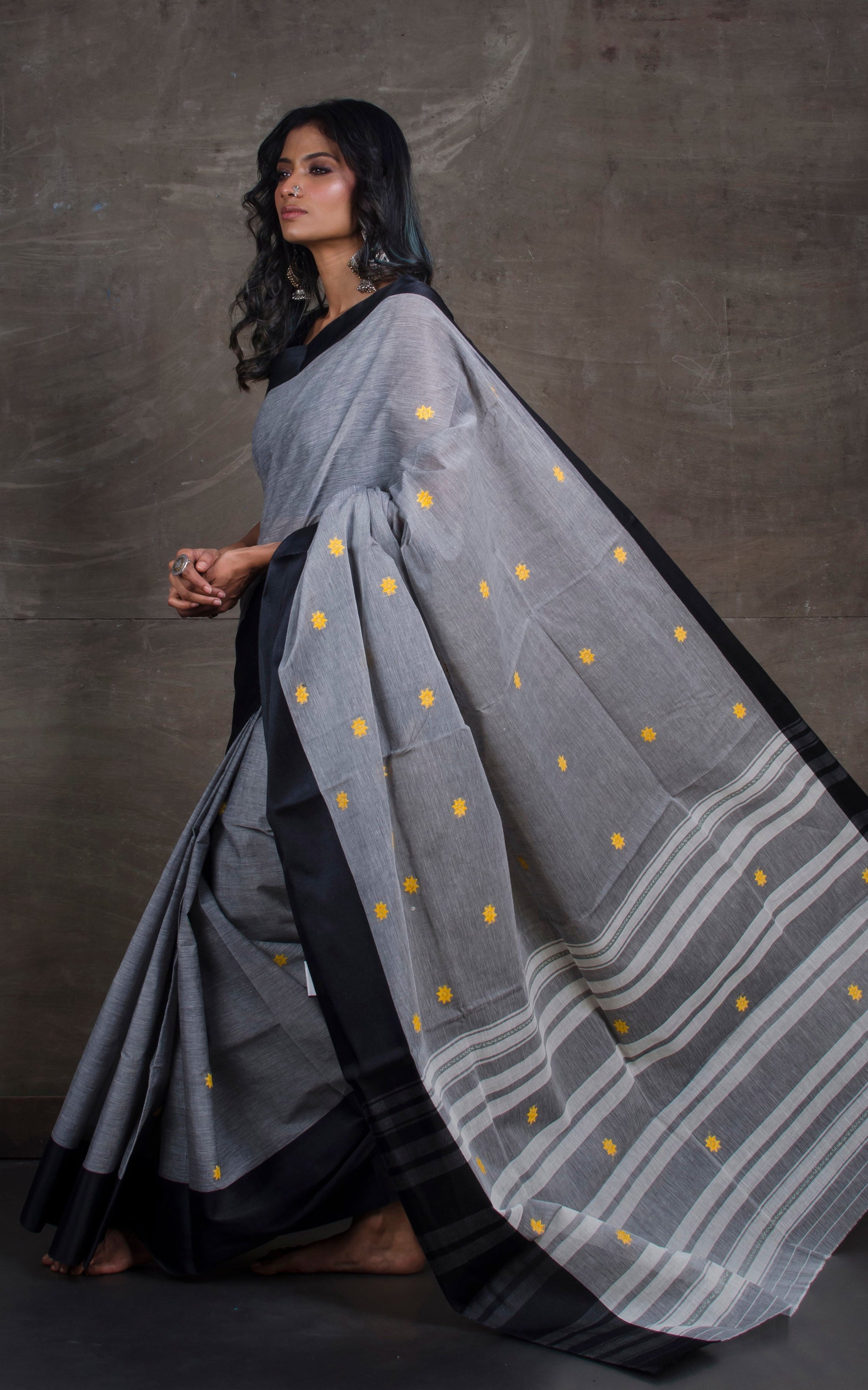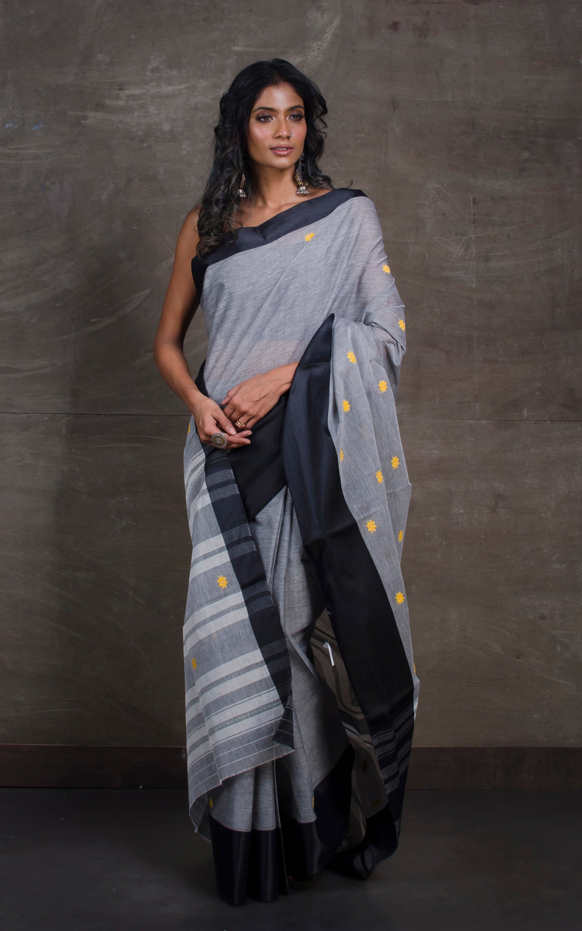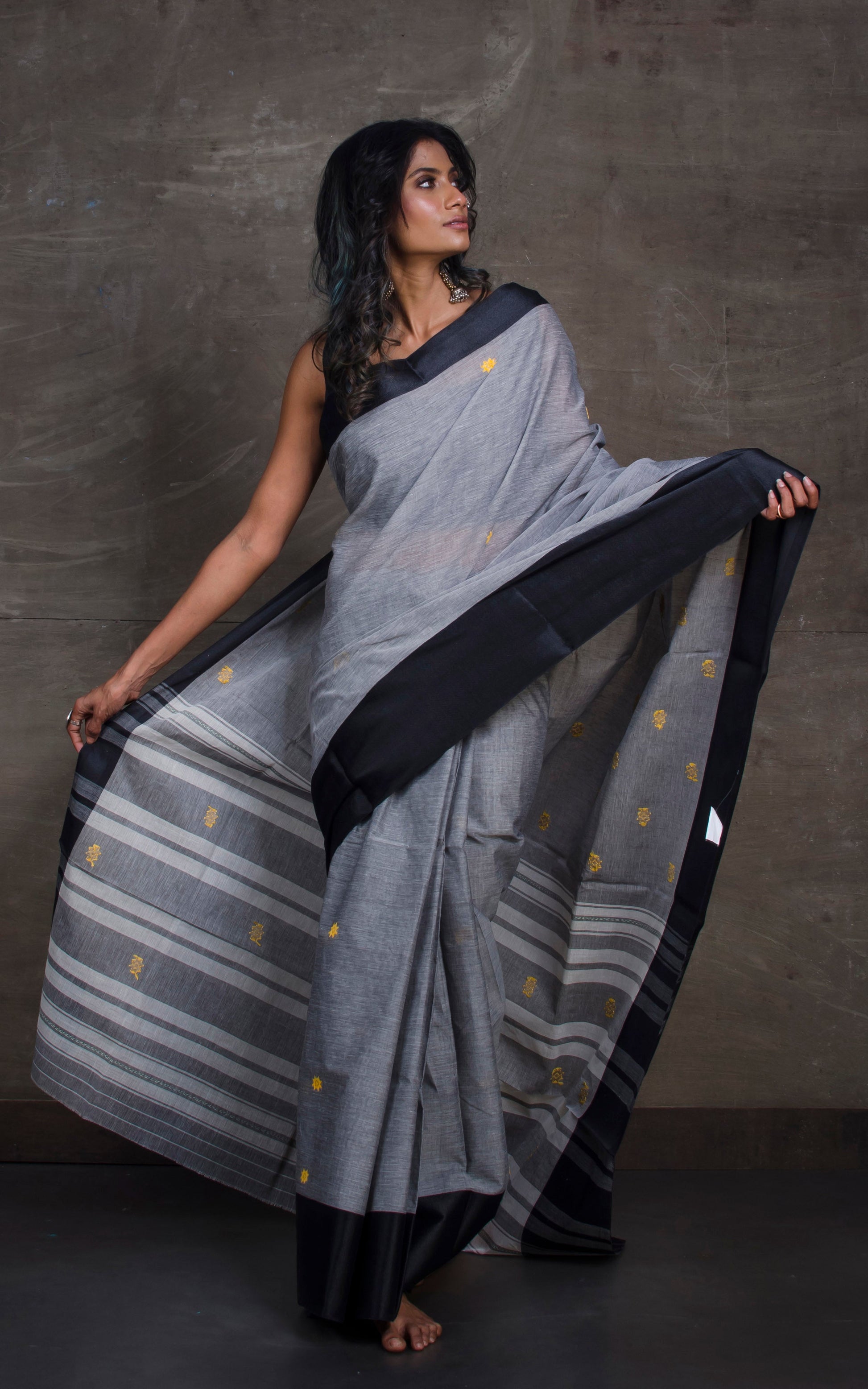 Bengal Handloom Satin SIlk Border Cotton Saree in Steel Grey and Zed Black