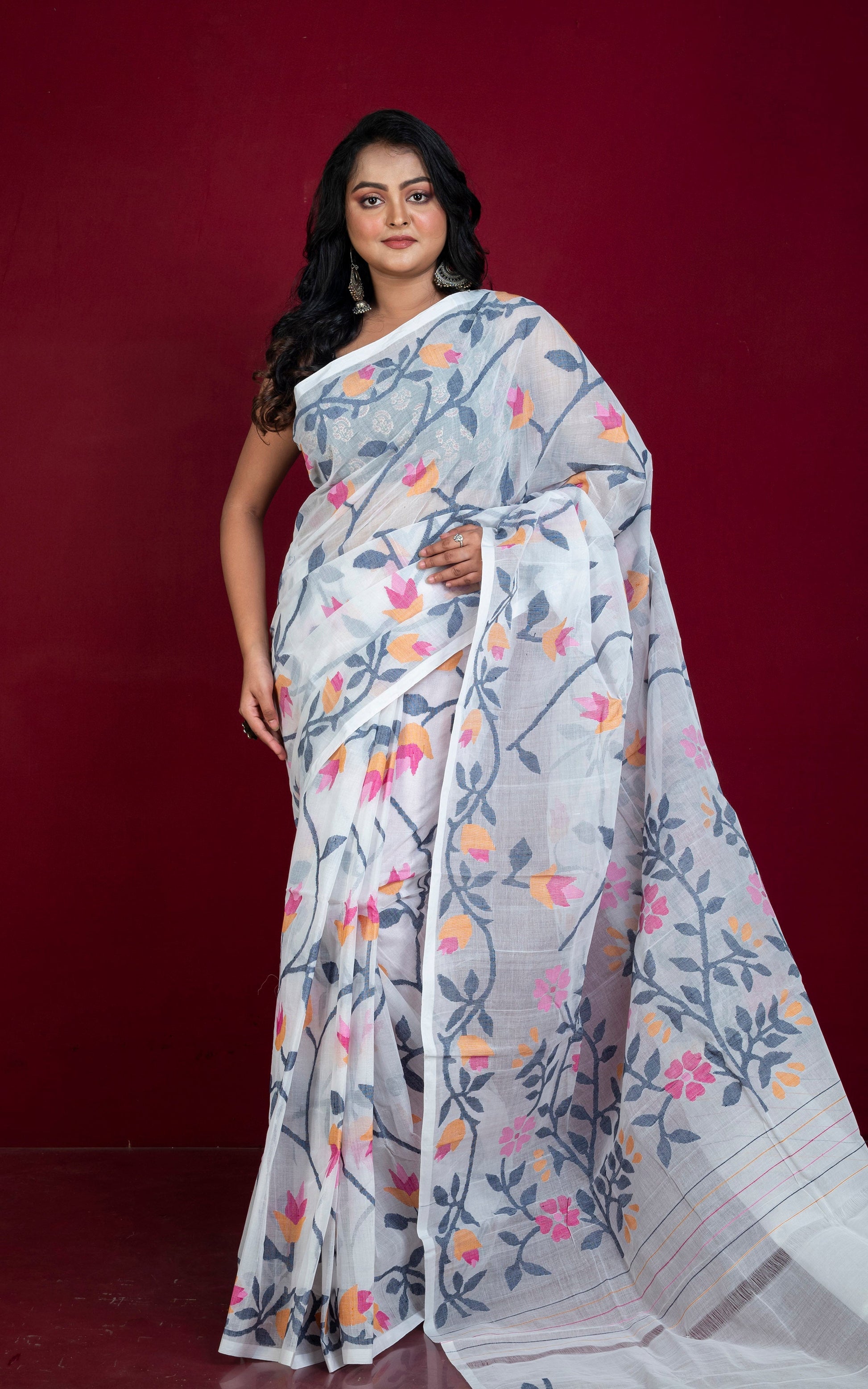 Bengal's Pride Premium Hand Woven Jangla Jaal Work Cotton Dhakai Jamdani Saree in Off White, Black, Amber, Taffy Pink and Hot Pink Thread Work