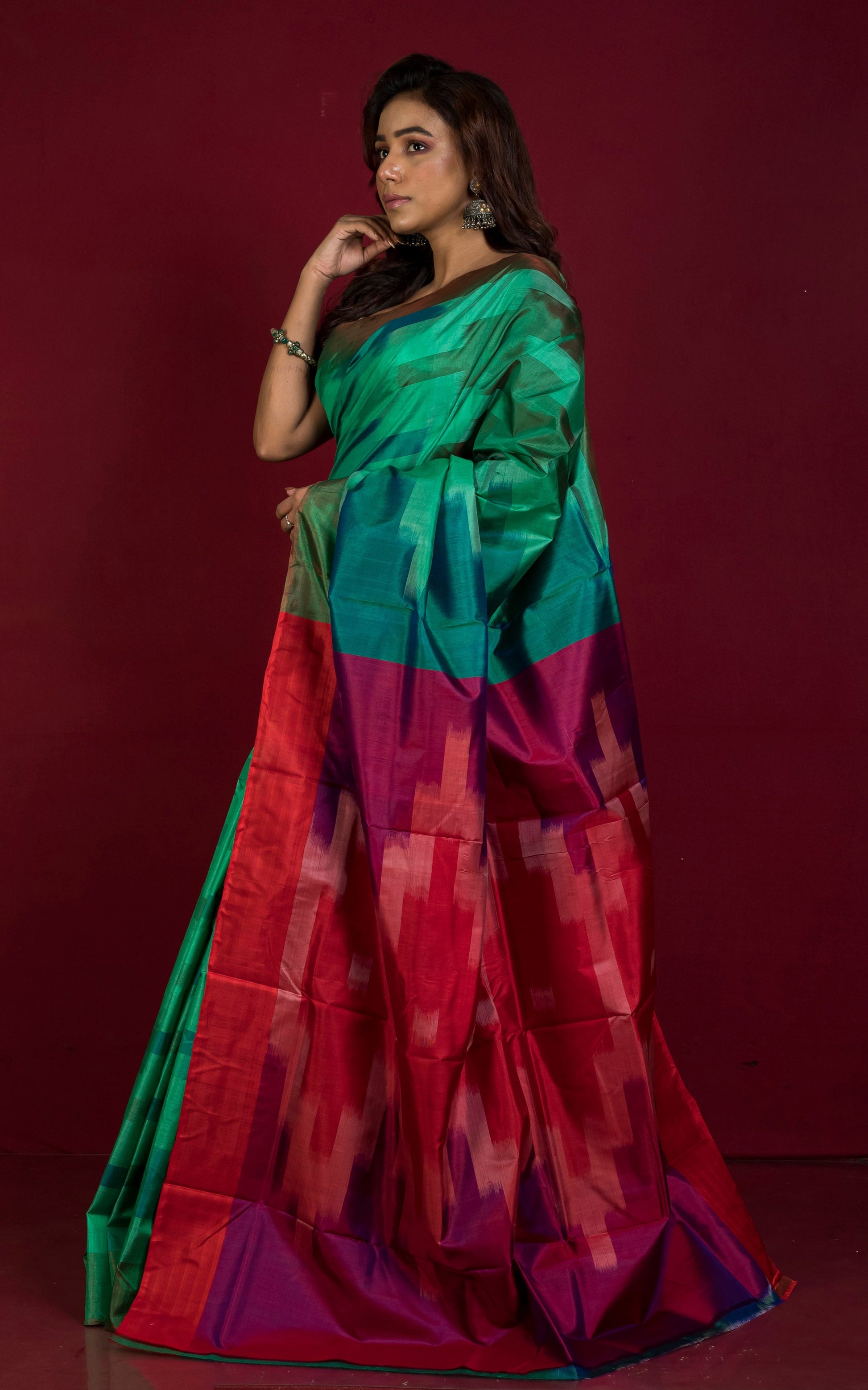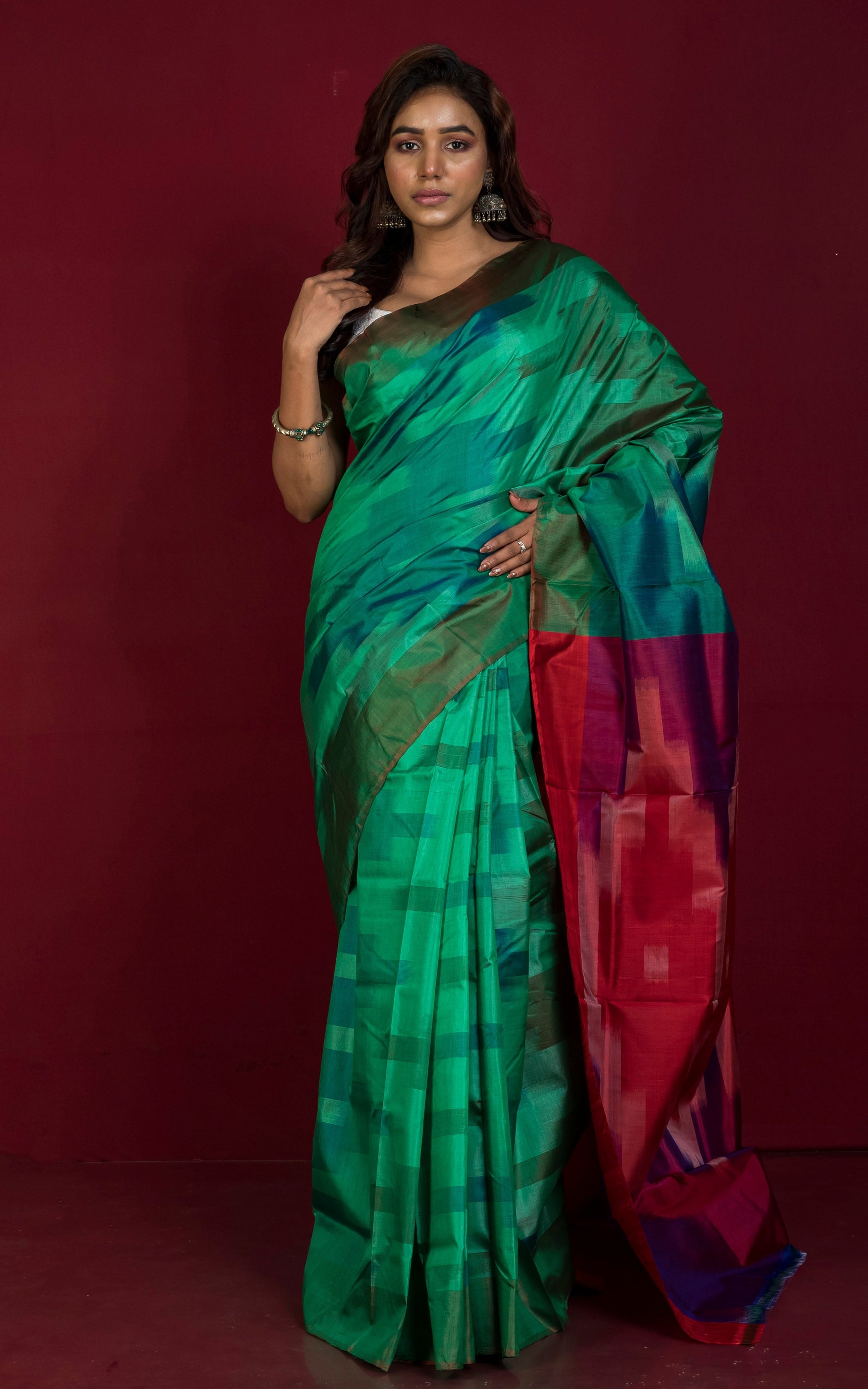Experience the rich heritage of Indian textiles with our Bishnupuri Pochampally Ikkat Silk Saree. Crafted in Myrtle Green, Red, and Multicolored, this saree boasts intricate patterns and luxurious silk fabric. Elevate your style and embrace the timeless beauty of traditional Indian sarees.