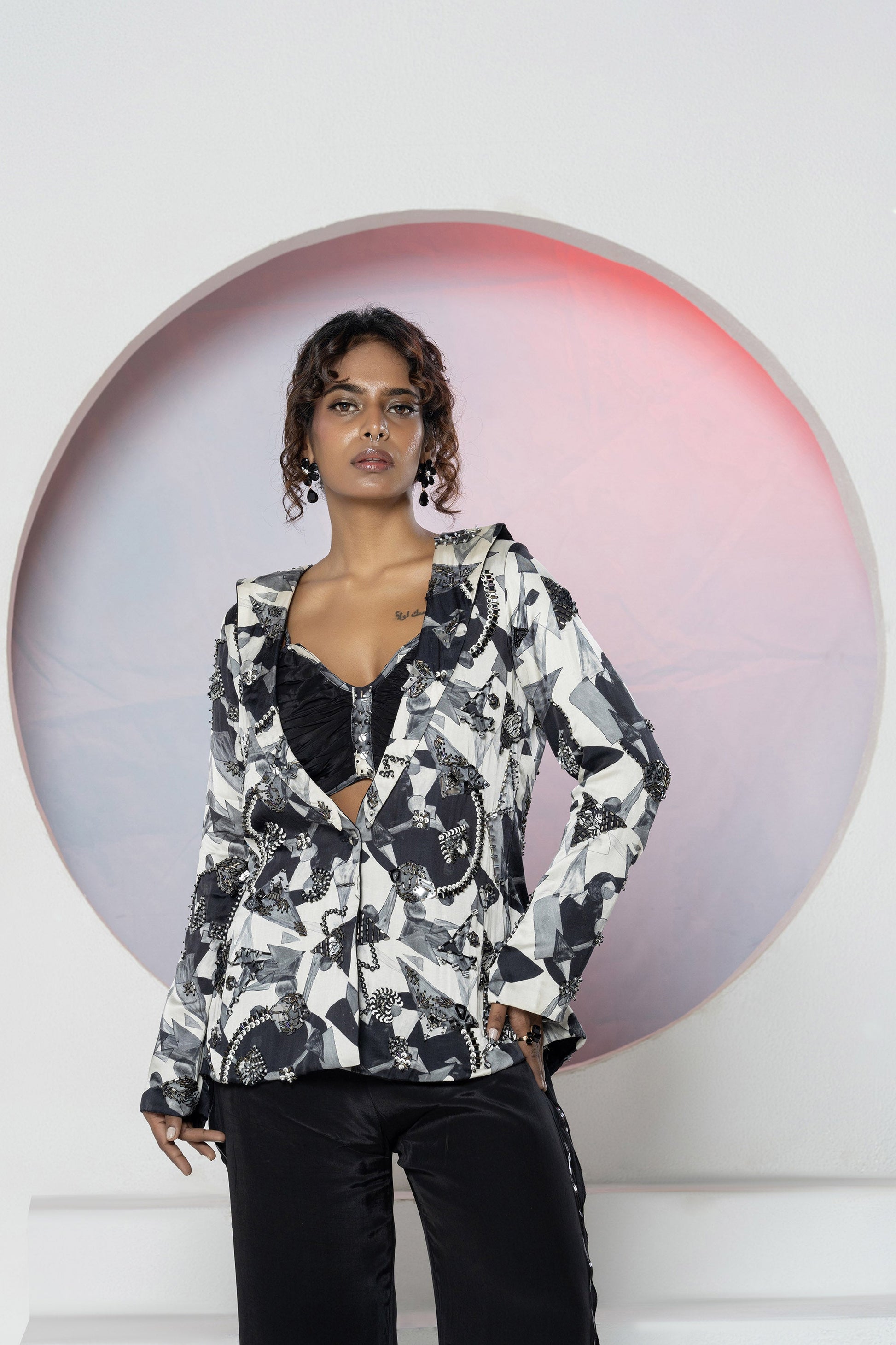 Pleated spaghetti with printed piping & Printed blazer with highlight handwork & Pants with bone lining at the sides