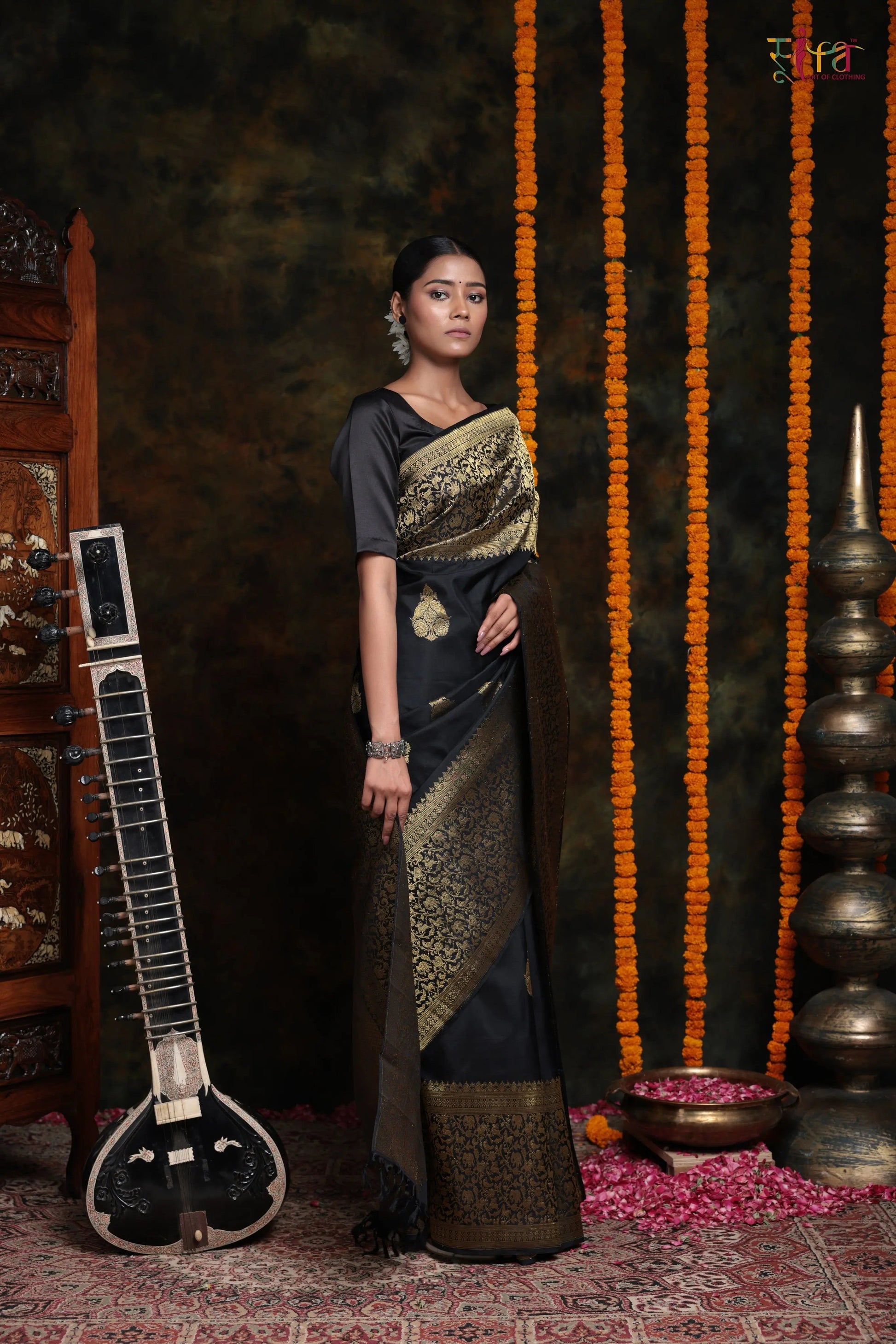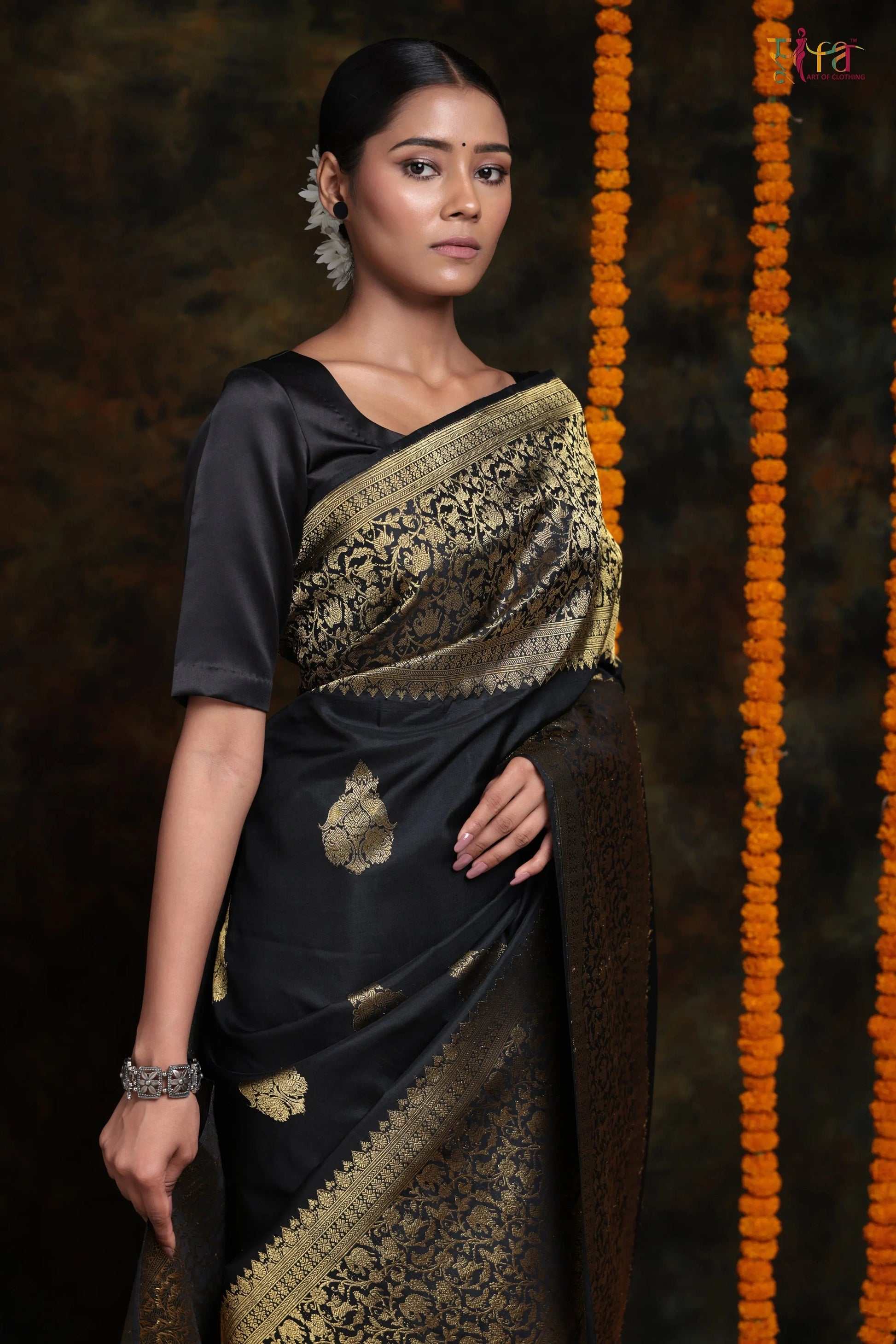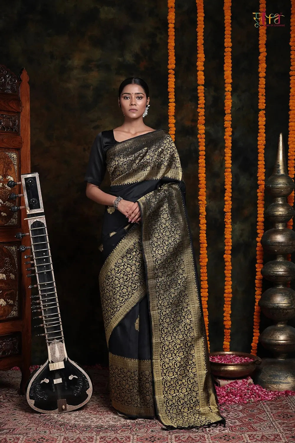 Black Handloom Kanchipattu with Gold Zari with Unstitched Blouse Piece-Experience elegance with our stunning black saree. Crafted from pure silk, it radiates subtle allure with its black body. The mesmerizing golden Zari border features intricate floral motifs, showcasing skilled craftsmanship. Complete with an unstitched blouse for personalized style, this saree lets you make a timeless statement of elegance. Embrace its exquisite motifs and craftsmanship, reflecting your unique style and grace.Black+A21