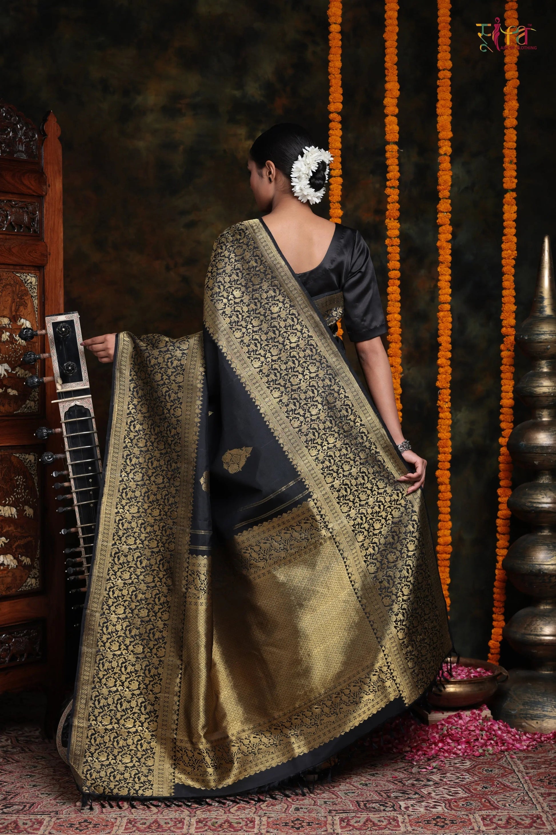 Black Handloom Kanchipattu Saree With Pure Thick Zari Motifs