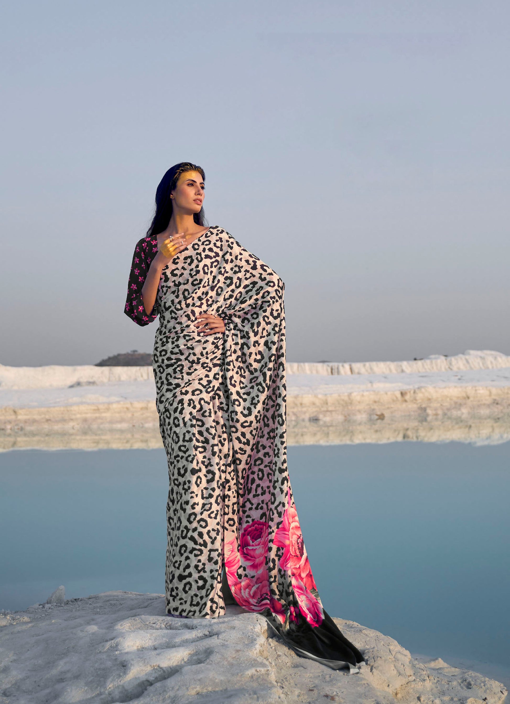 Does your wardrobe need more versatility? Then, check out this. Let your skin feel the refreshing touch as you adorn this superior-quality lightweight Black Leopard Print Soft Silk Saree to match the overall modest design. If you're yearning to make a fashion statement in your outfit, pick this digital printed designer saree for any occasion, such as wedding receptions, engagement parties, and sangeets. A wedding Guest would look gorgeous in this Black Leopard Print Soft Silk Saree. Don't wait. Just go ahead and order.