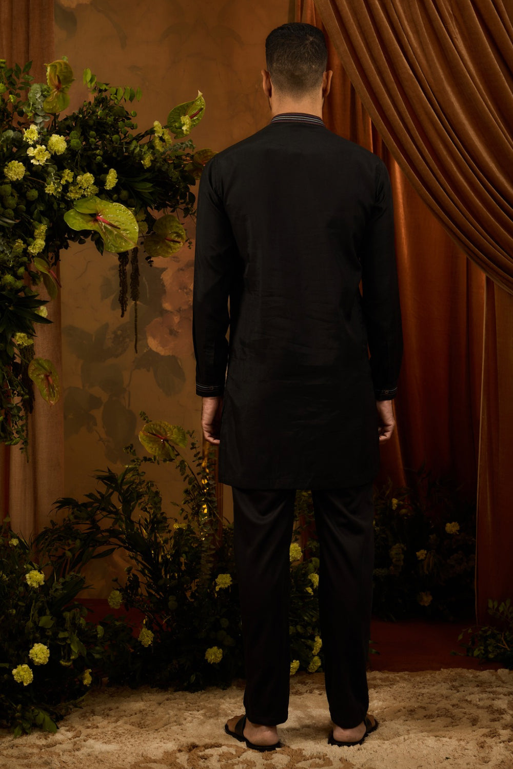 Step into spotlight with the black silk koti set. The plain classic black kurta pajama is complemented with a beautiful koti adorned with exqusite multicolour thread embroidery, crafted with machine work.