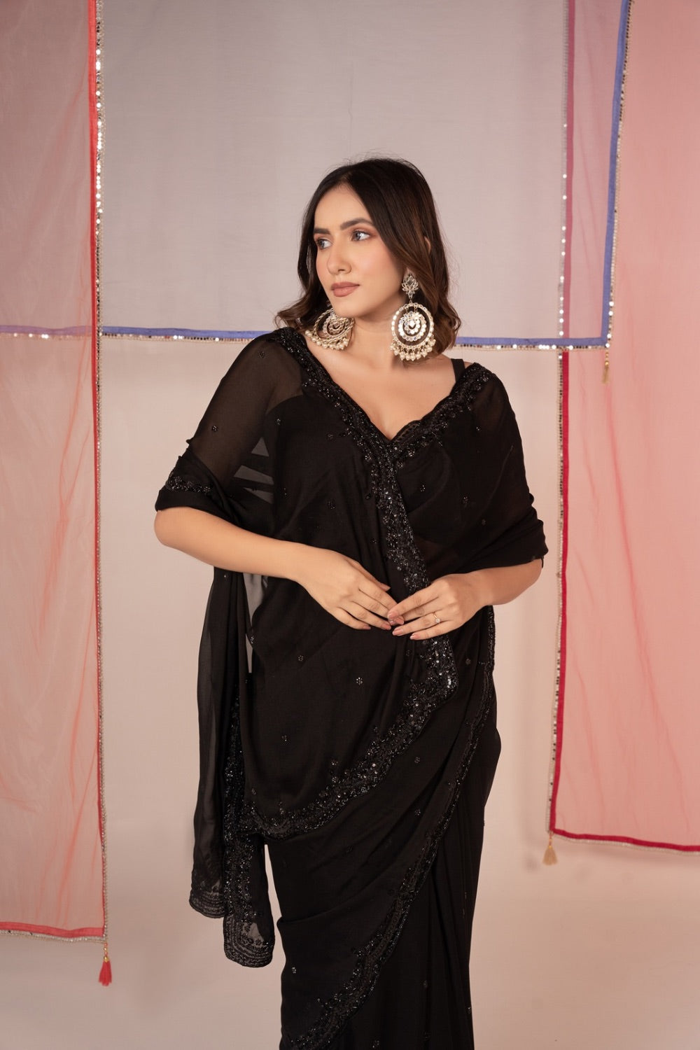 Wrap yourself in timeless elegance with this black tissue silk saree. Exquisite black stone embellishments gracefully adorn the border and are interspersed with delicate motifs, adding a touch of sophistication.