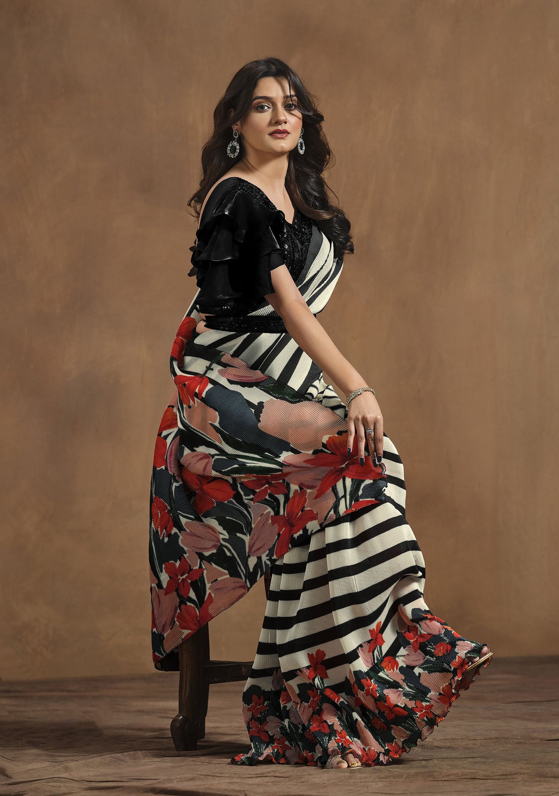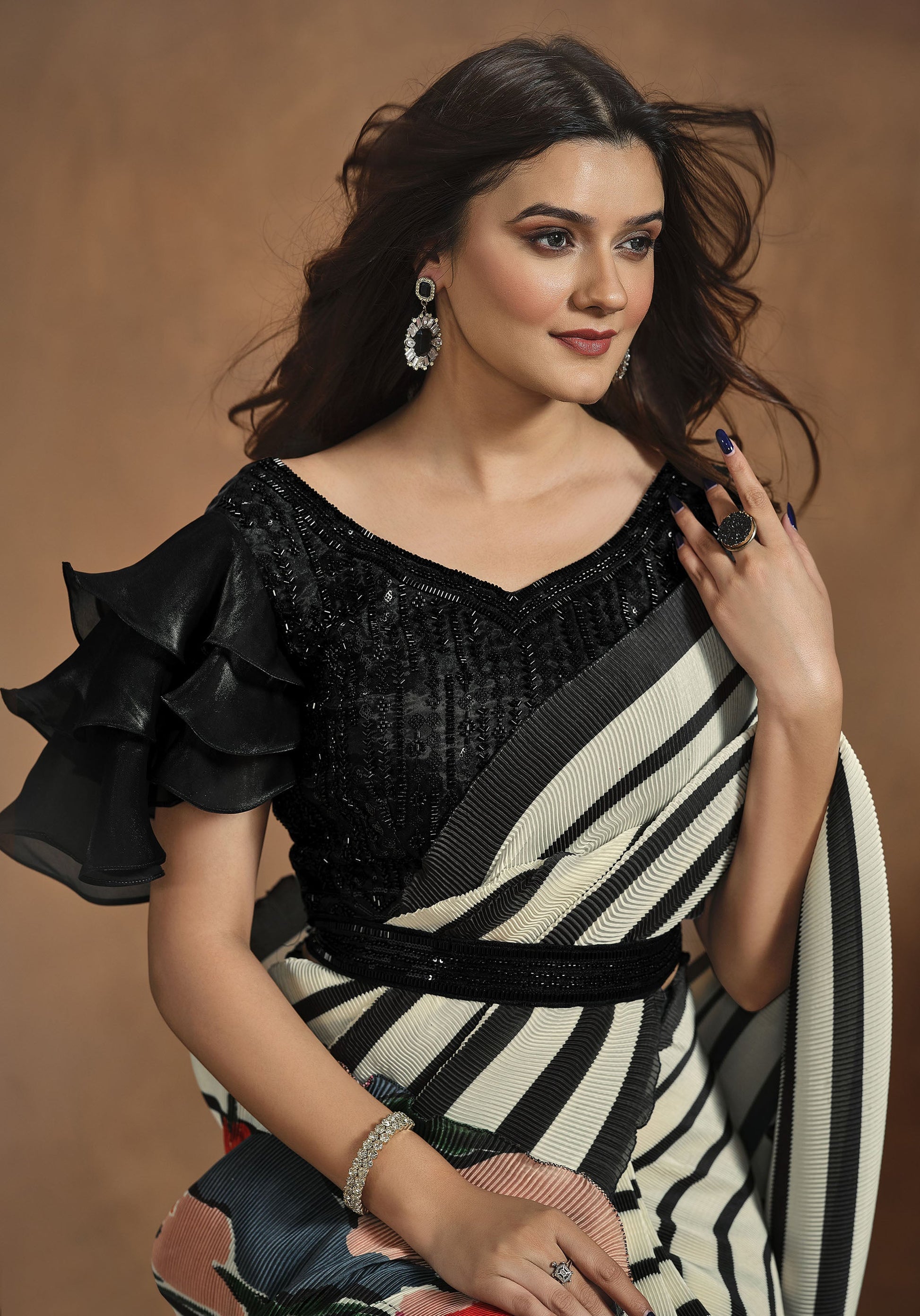 Does your wardrobe need more versatility? Then, check out this . Let you feel the refreshing touch as you adorn this superior-quality Black & White Satin Silk Readymade Floral Print Saree to match the overall modest design. If you're yearning to make a fashion statement in your outfit, pick this saree for any occasion, such as wedding receptions, engagement parties, and sangeets. A wedding Guest would look gorgeous in this Black & White Satin Silk Readymade Floral Print Saree. Don't wait. Just go ahead and order.