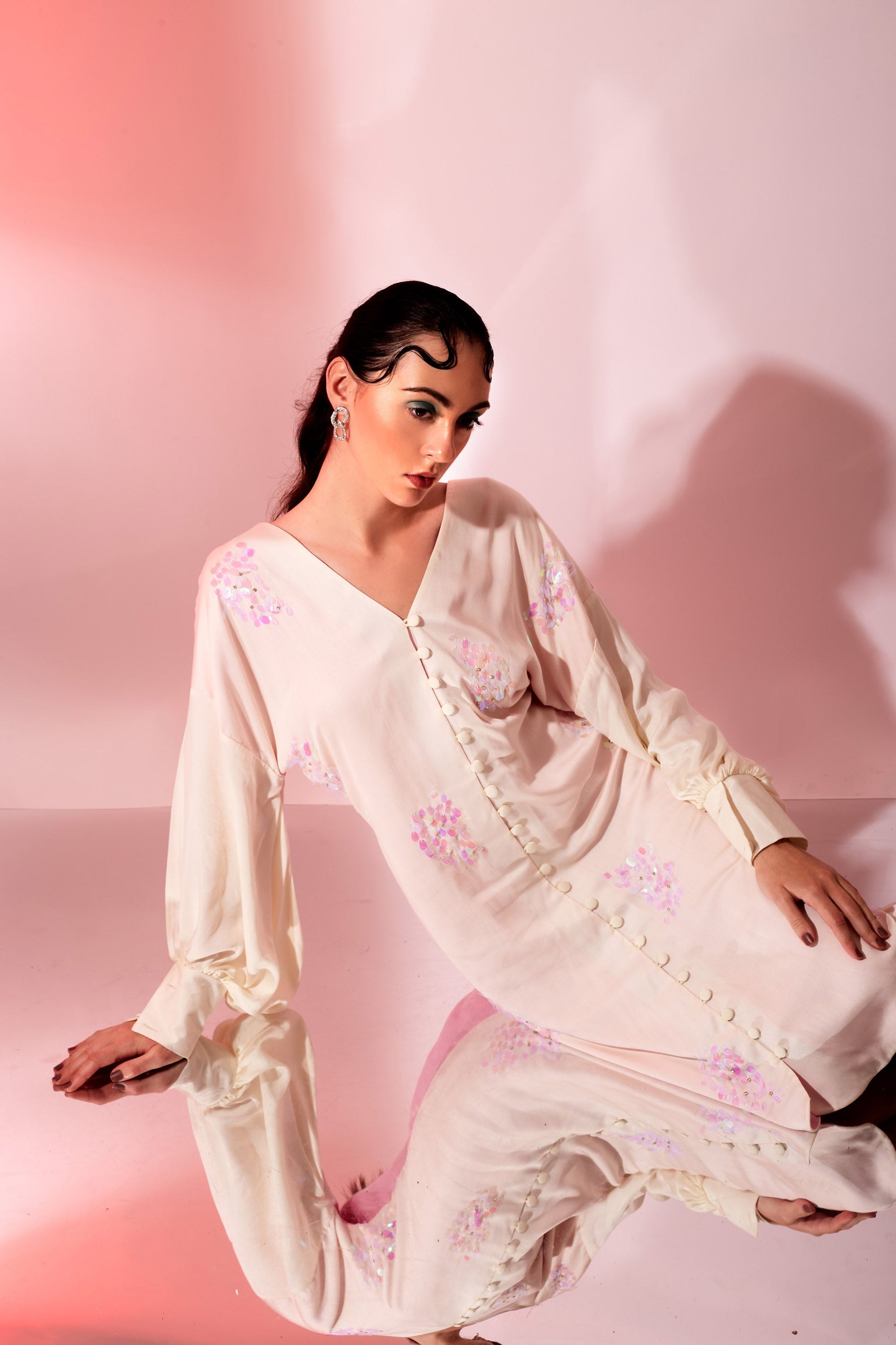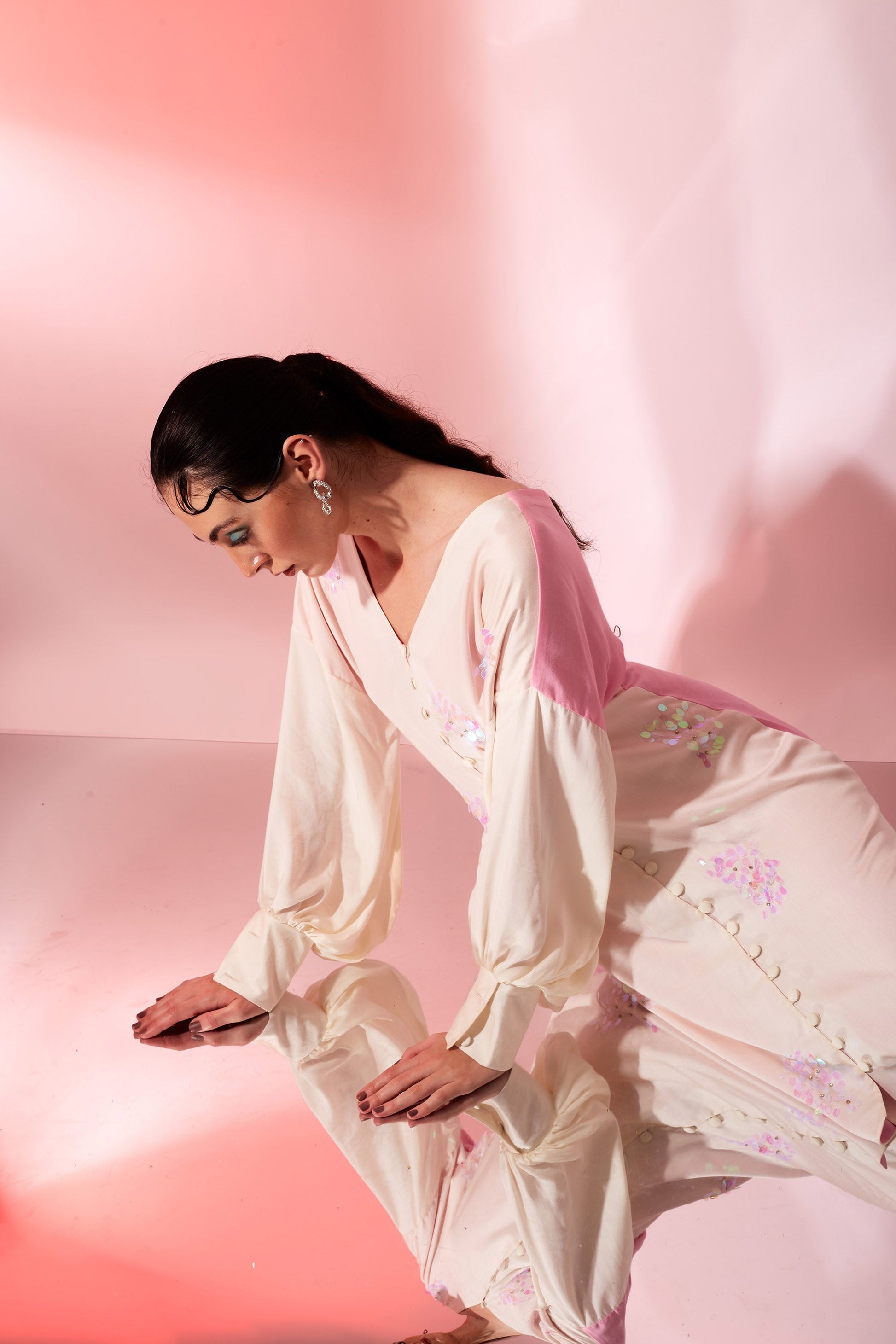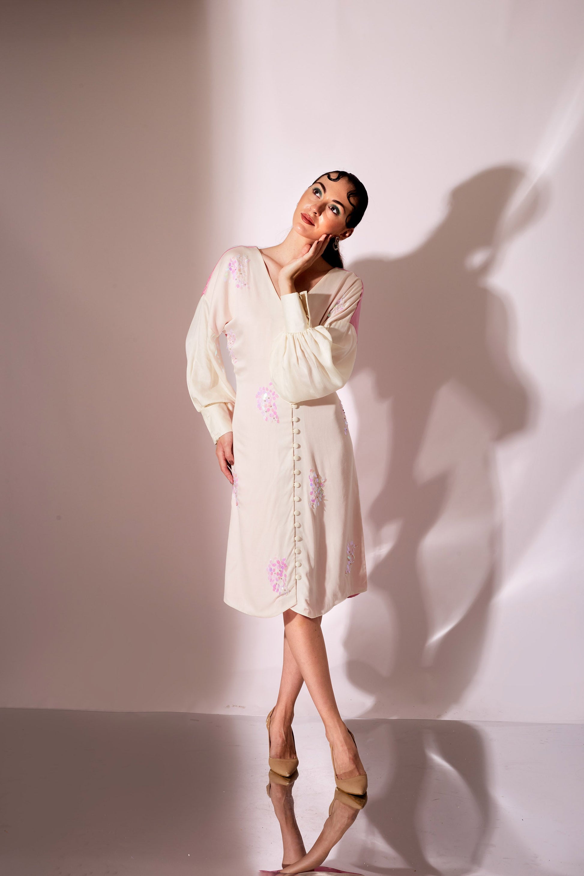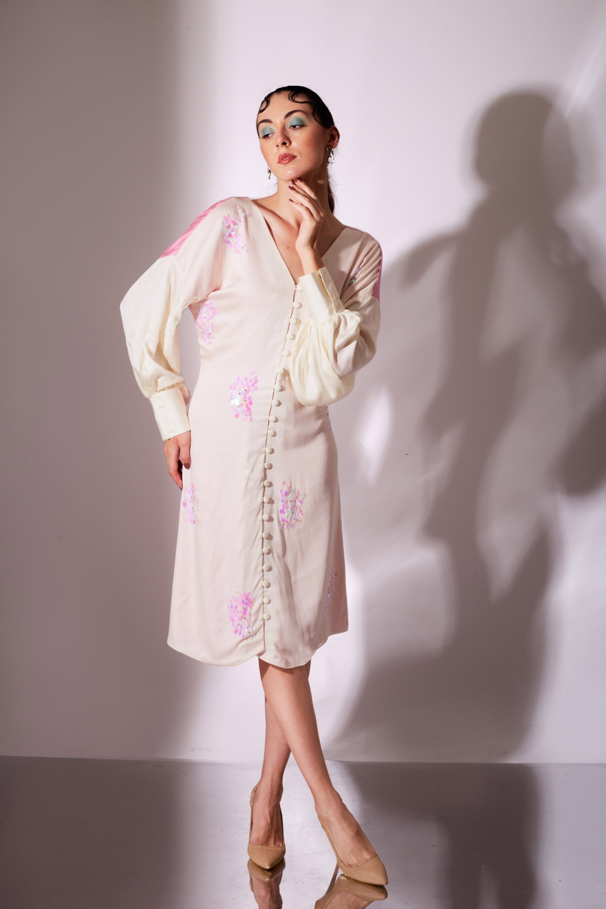 A holographic sequin embellished shirt dress with color block back, front open loop button closure.