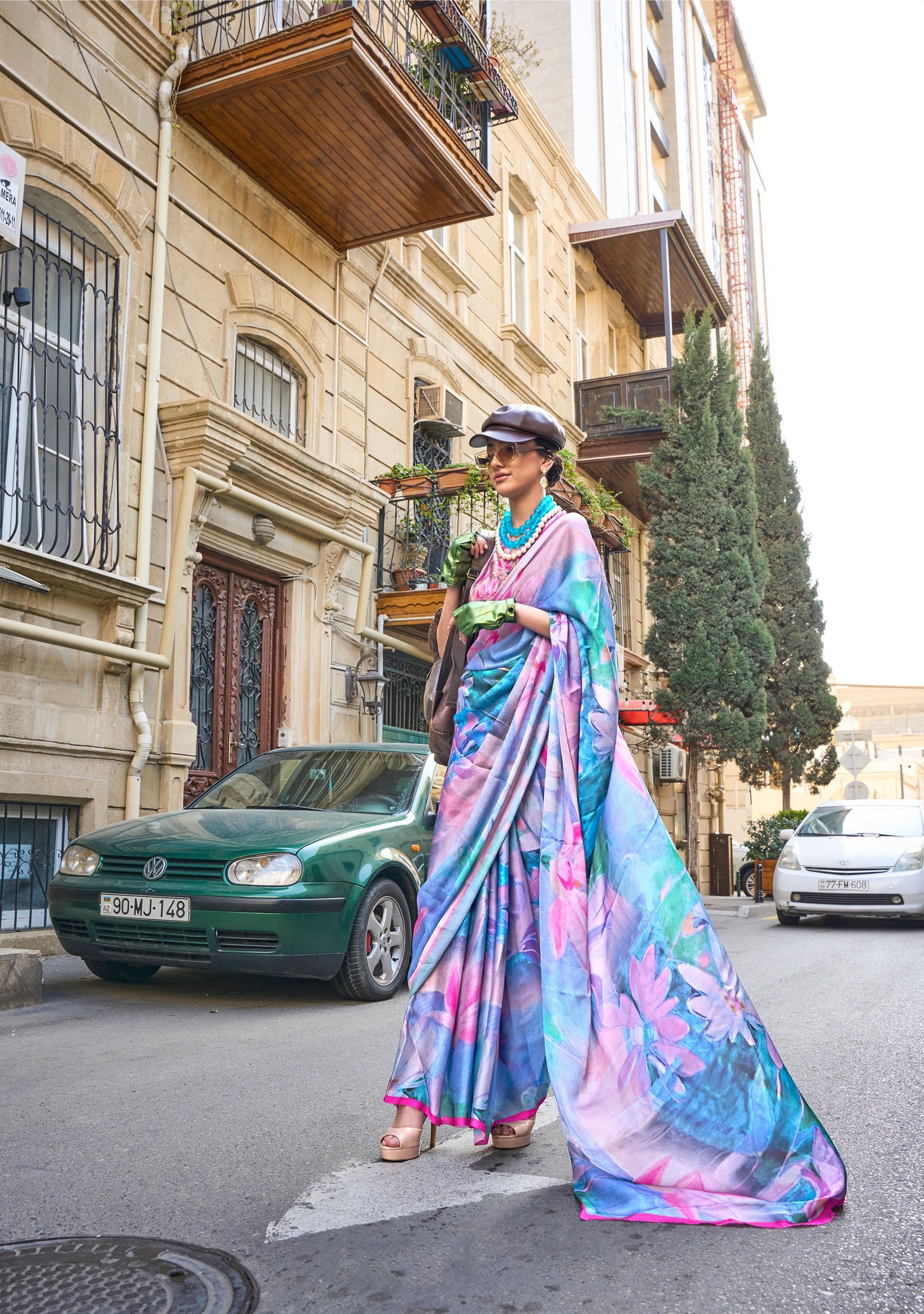 Blue and Green Floral Kolombus Satin Georgette Printed Saree