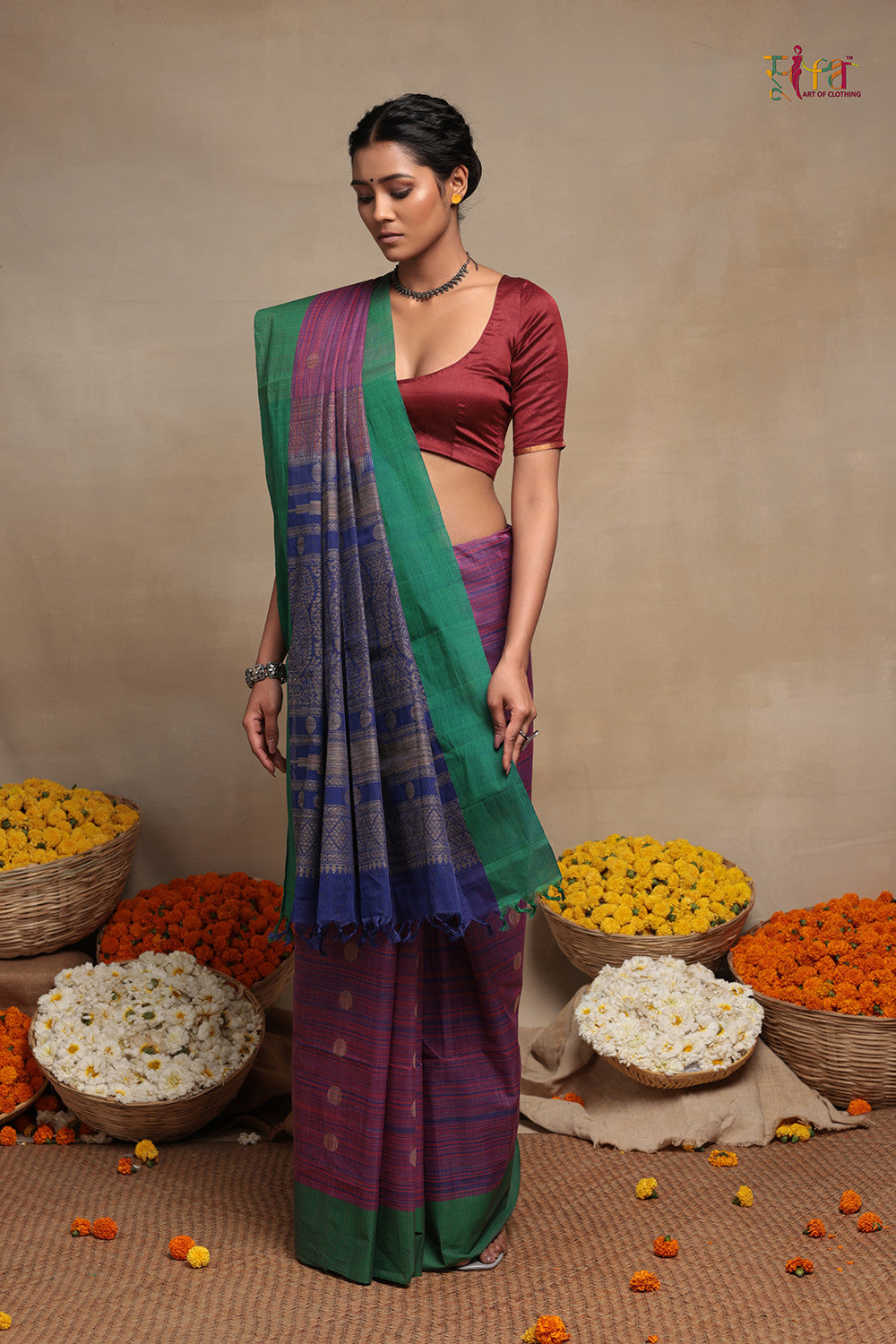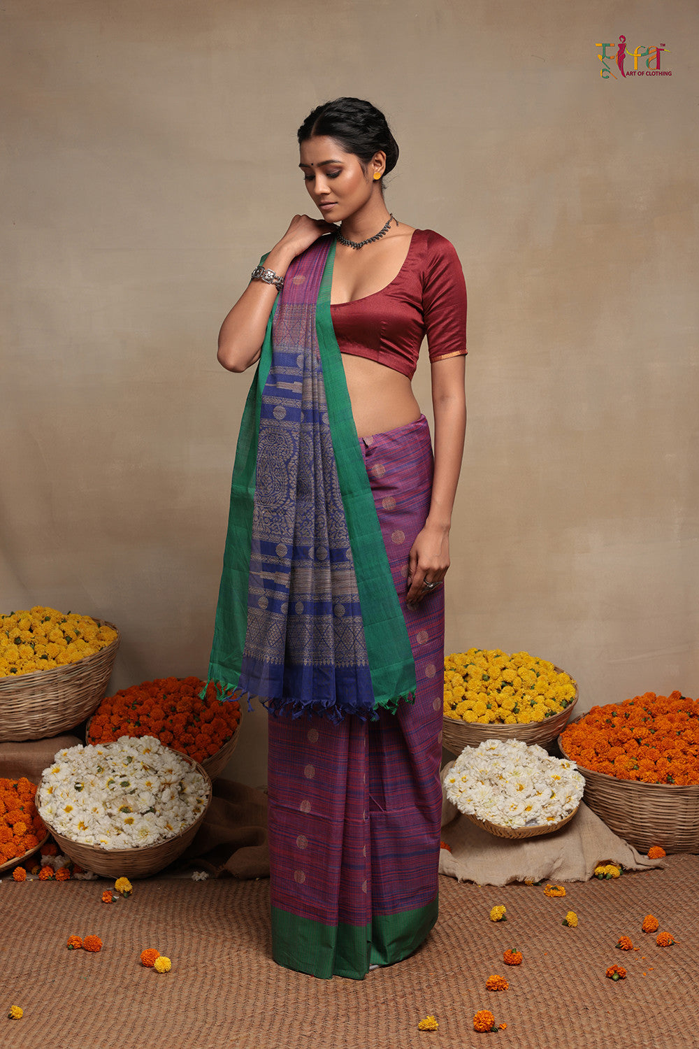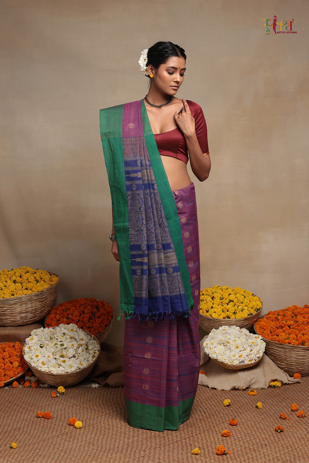 Experience the enchantment of our stunning blue and pink Handloom Pure Cotton Saree - a true fusion of traditional craftsmanship and contemporary design. Meticulously handwoven by skilled artisans, it exudes timeless elegance with its sophisticated black hue, complemented by captivating grey bootis and a duo-tone pattern. Lightweight and breathable, this saree ensures comfort while being a unique piece of art with intricate weaving. Embrace the beauty of this magnificent creation and be the center of attention on any occasion.