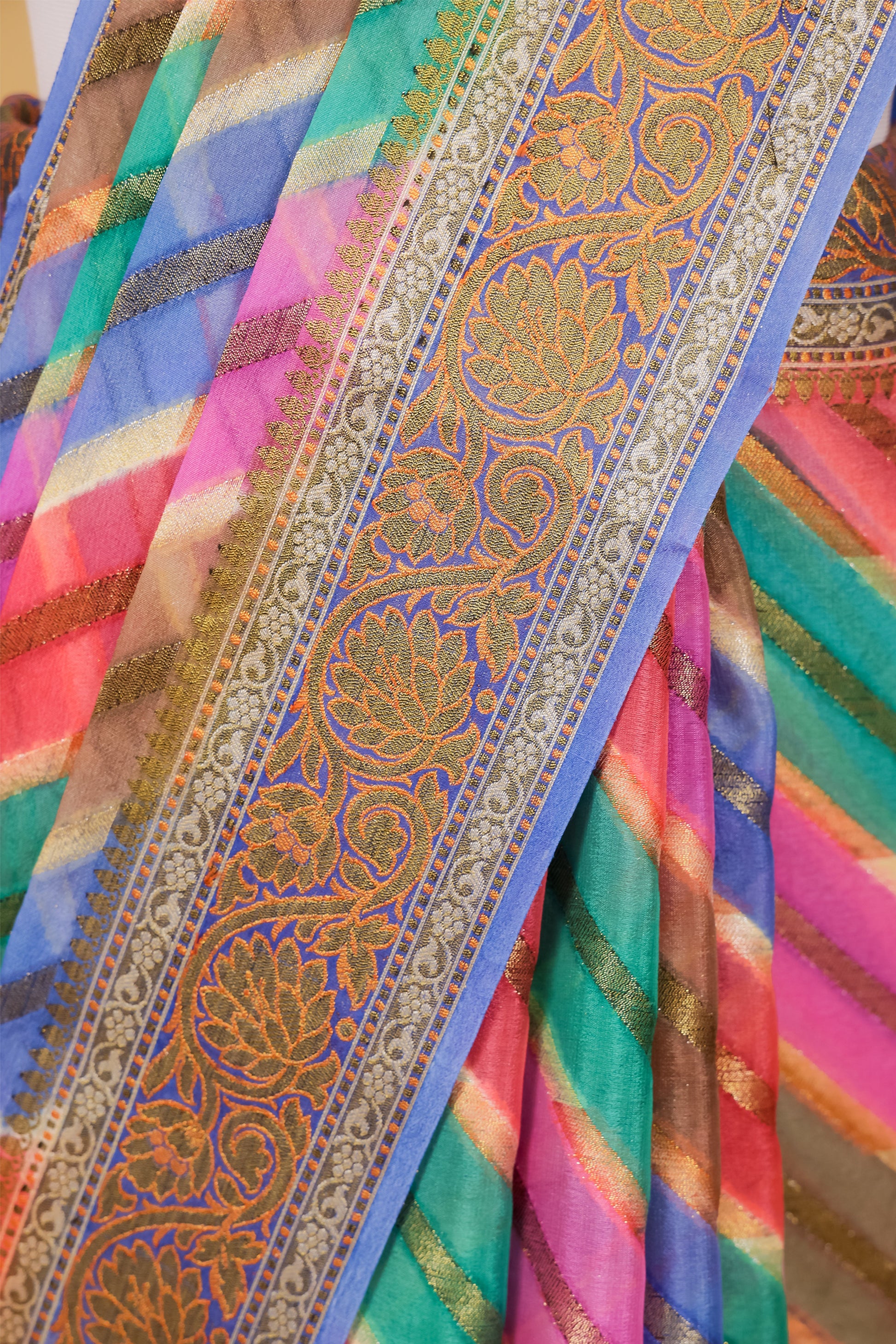 - Description: Banarasi Chiffon Sari with Diagonal pattern and Multi color hand brush paint with Copper zari Border and Aachal